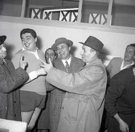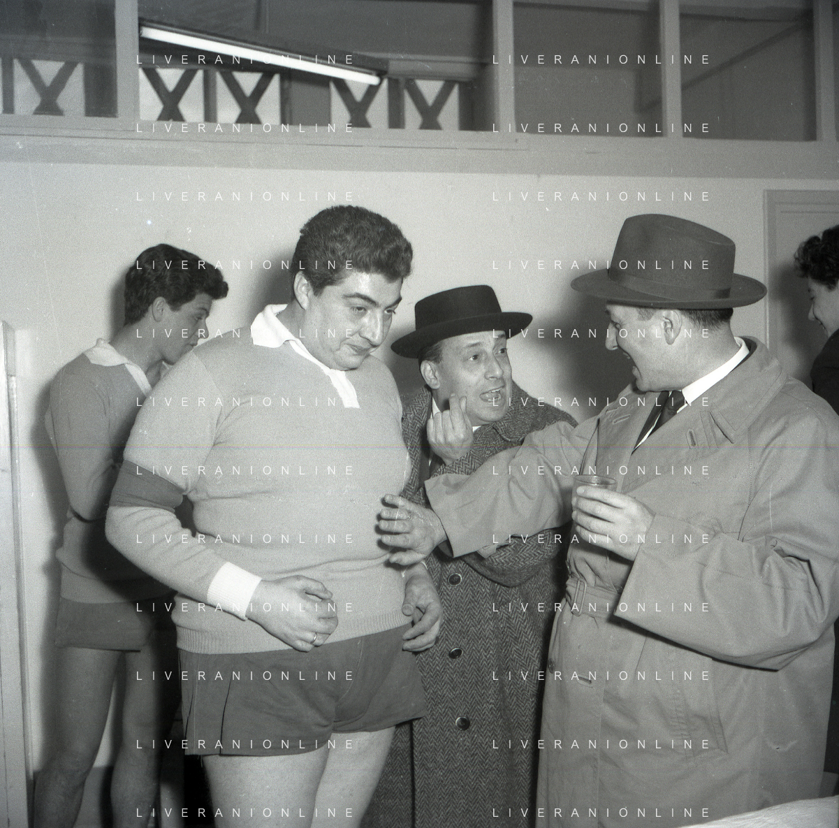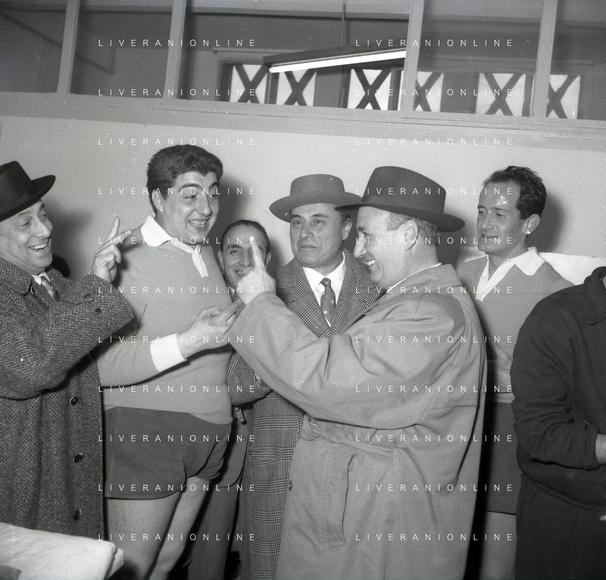RETROSPETTIVA GINO BRAMIERI COMICO-CABARETTISTA-ATTORE-UMORISTA CONDUTTORE TELEVISIVO NELLA FOTO GINO BRAMIERI A MILANO NELL'ANNO 1960 NEGLI SPOGLIATOI PER UNA PARTITA BENEFICA AG ALDO LIVERANI SAS