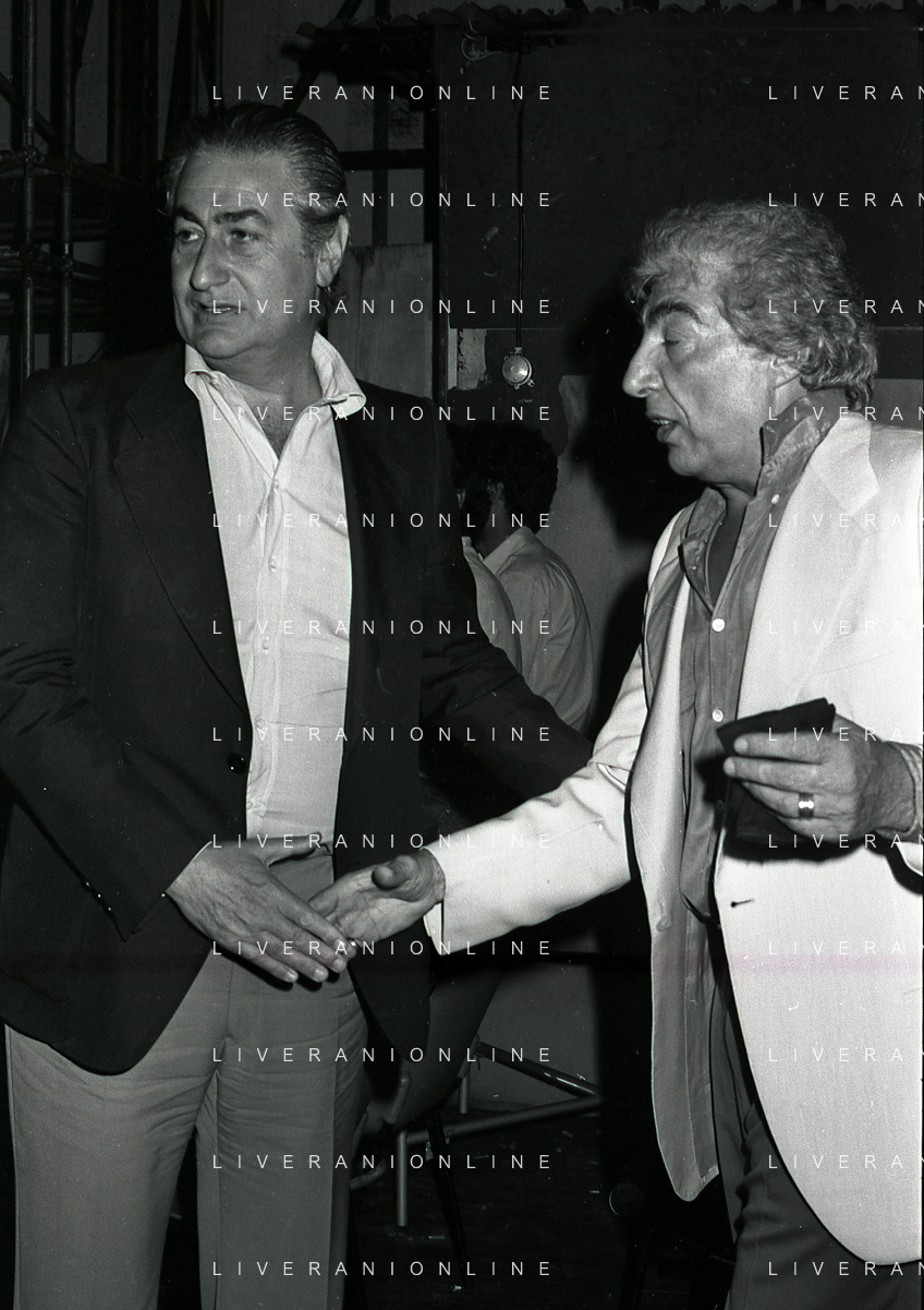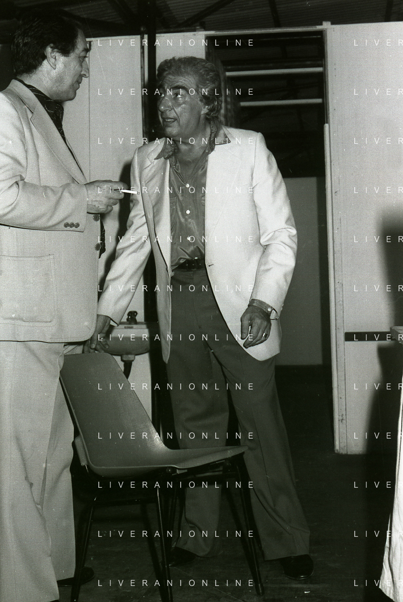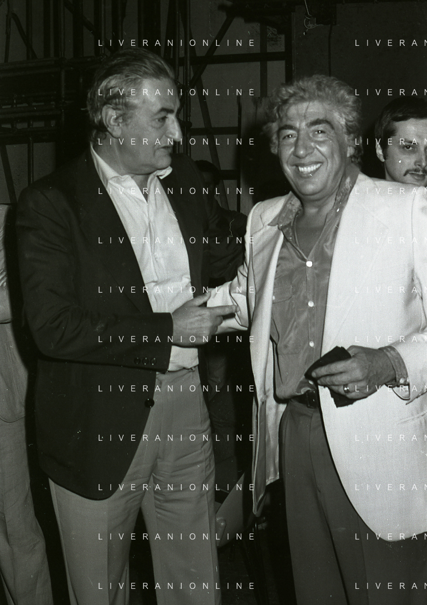 RETROSPETTIVA GINO BRAMIERI COMICO-CABARETTISTA-ATTORE-UMORISTA CONDUTTORE TELEVISIVO NELLA FOTO GINO BRAMIERICON L'ASSESSORE PARIDE ACCETTI A MILANO NELL'ANNO 1980 NELLO SPETTACOLO AL CASTELLO SFORZESCO AG ALDO LIVERANI SAS