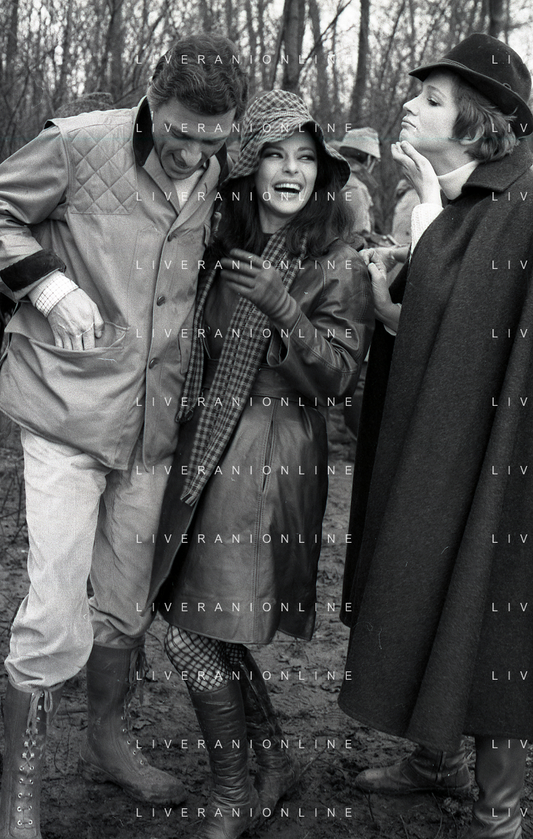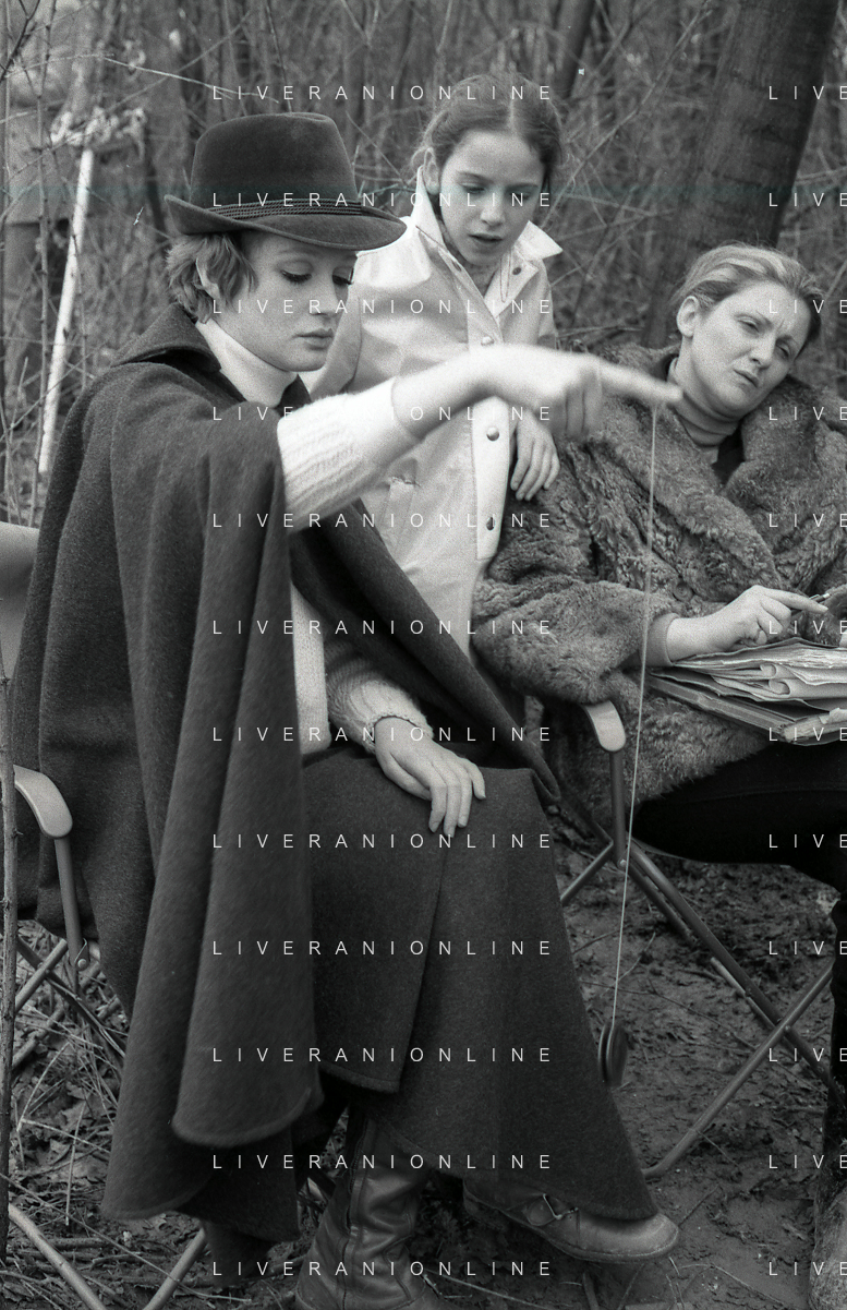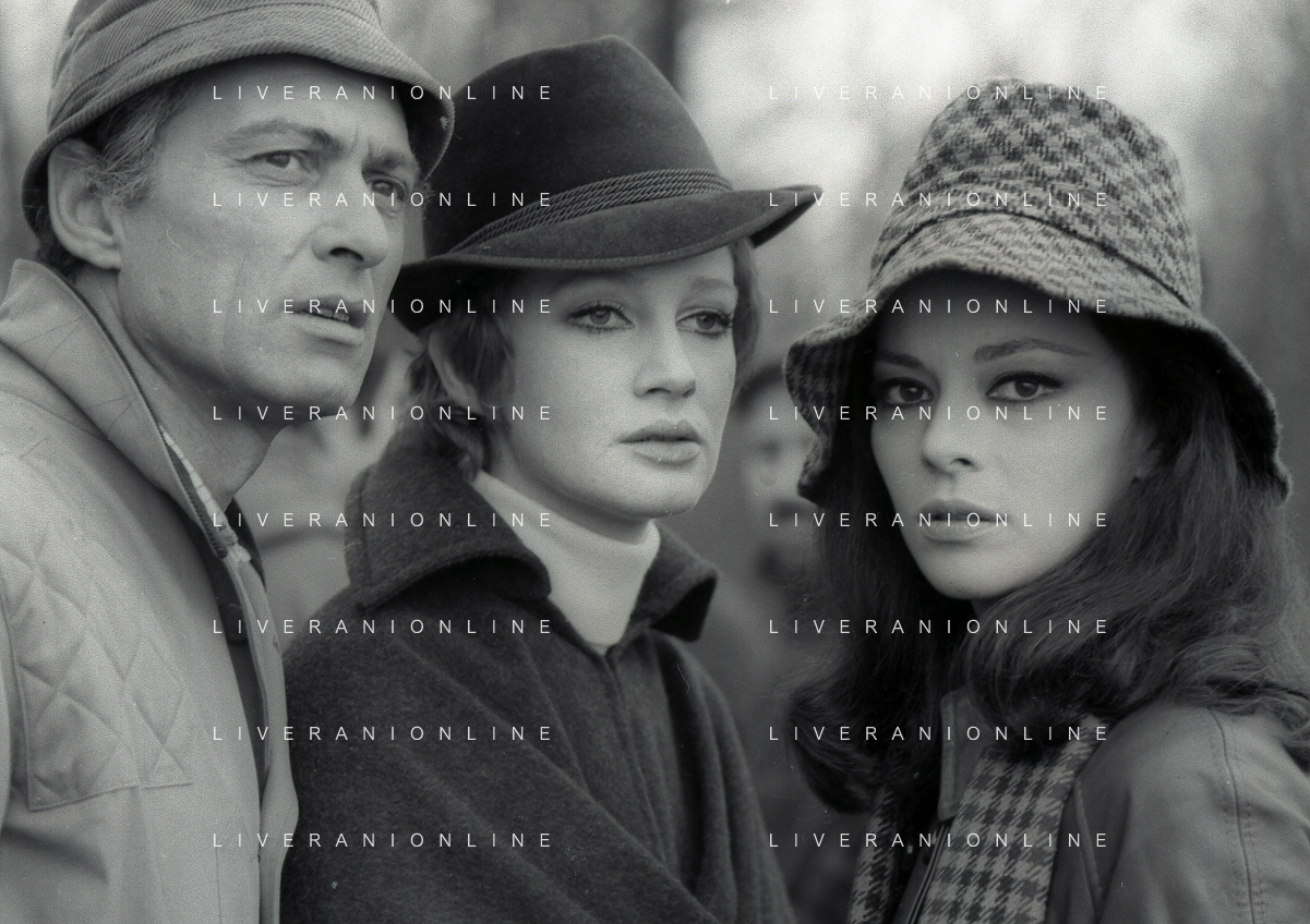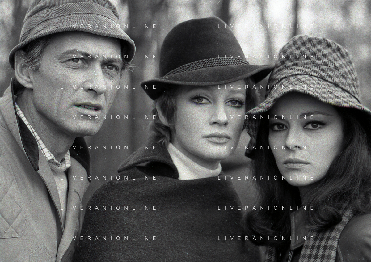 RETROSPETTIVA CARLA GRAVINA ATTRICE NELLA FOTO CARLA GRAVINA CON SILVANO TRANQUILLI E GIOVANNA RALLI NELL'ANNO 1969 A VIGEVANO SET DEL FILM“LA DONNA INVISIBILE“ AG ALDO LIVERANI SAS