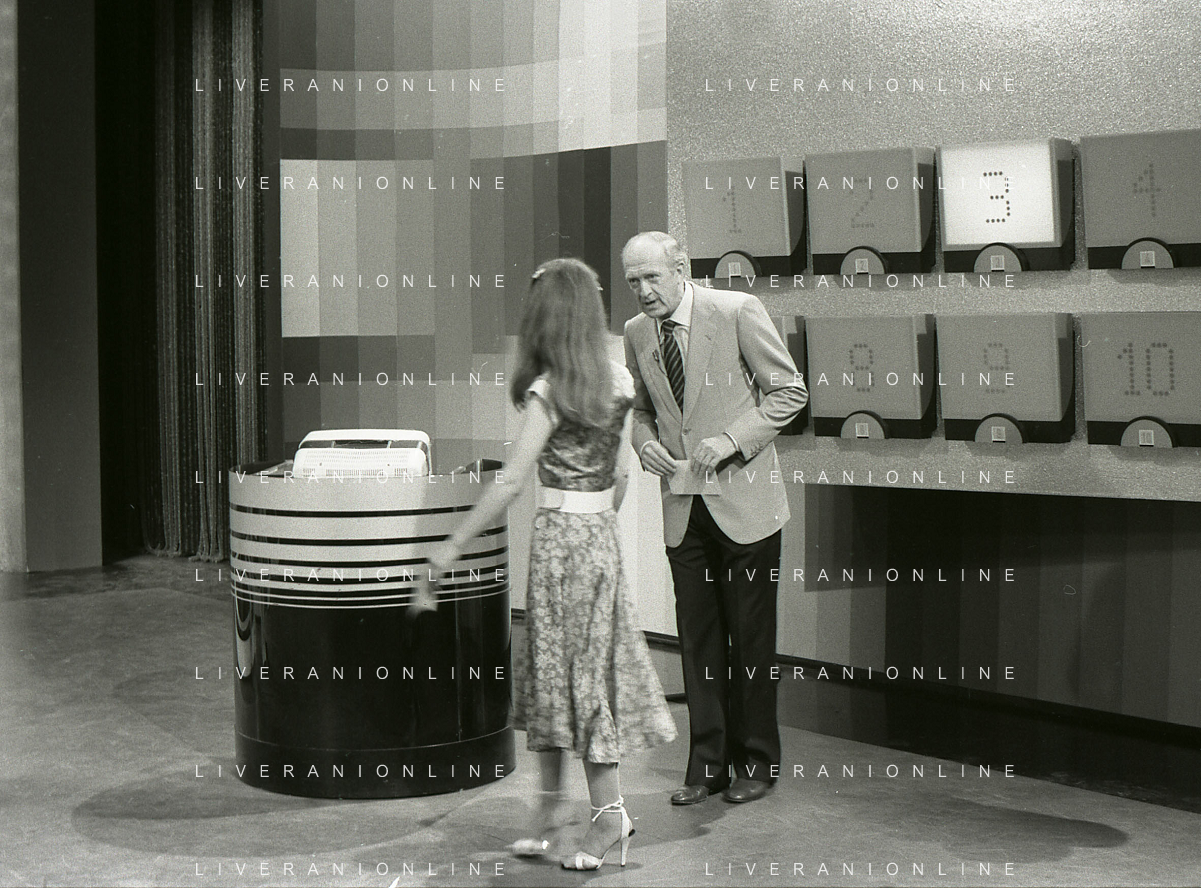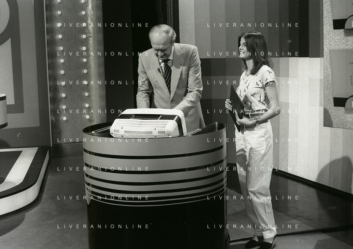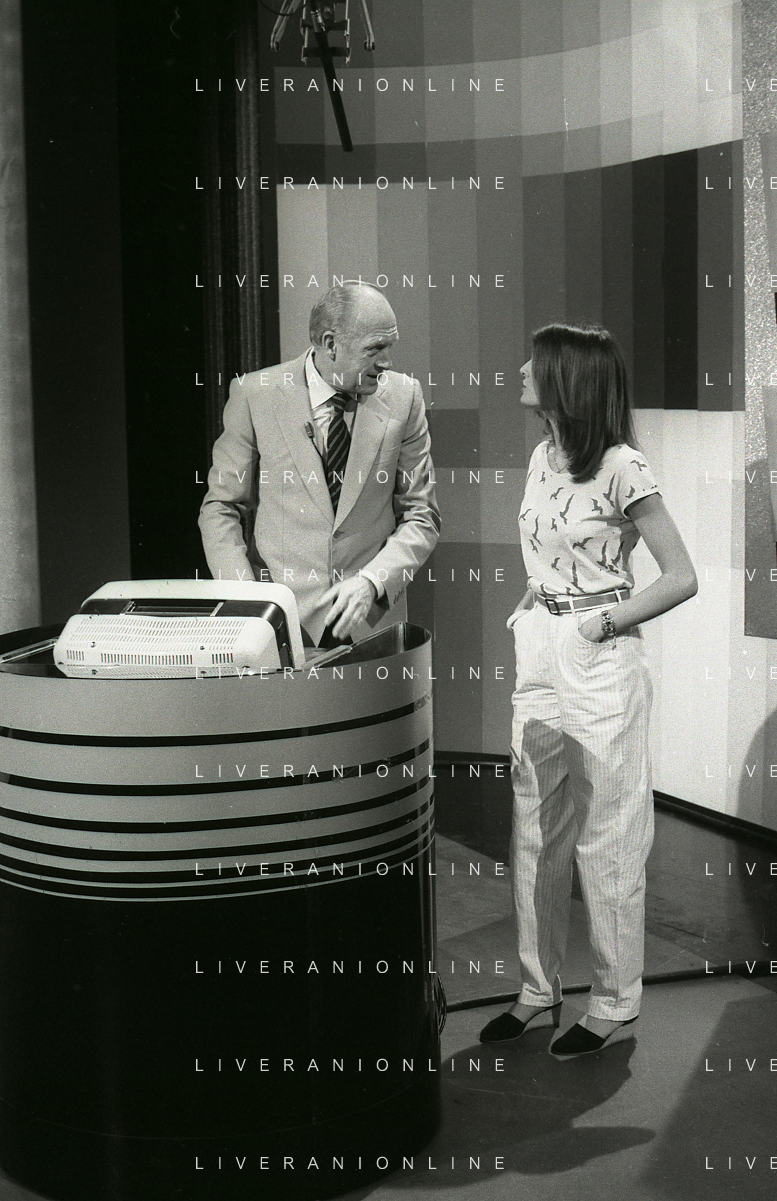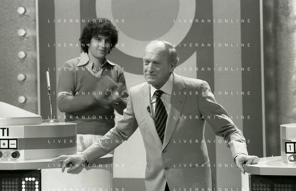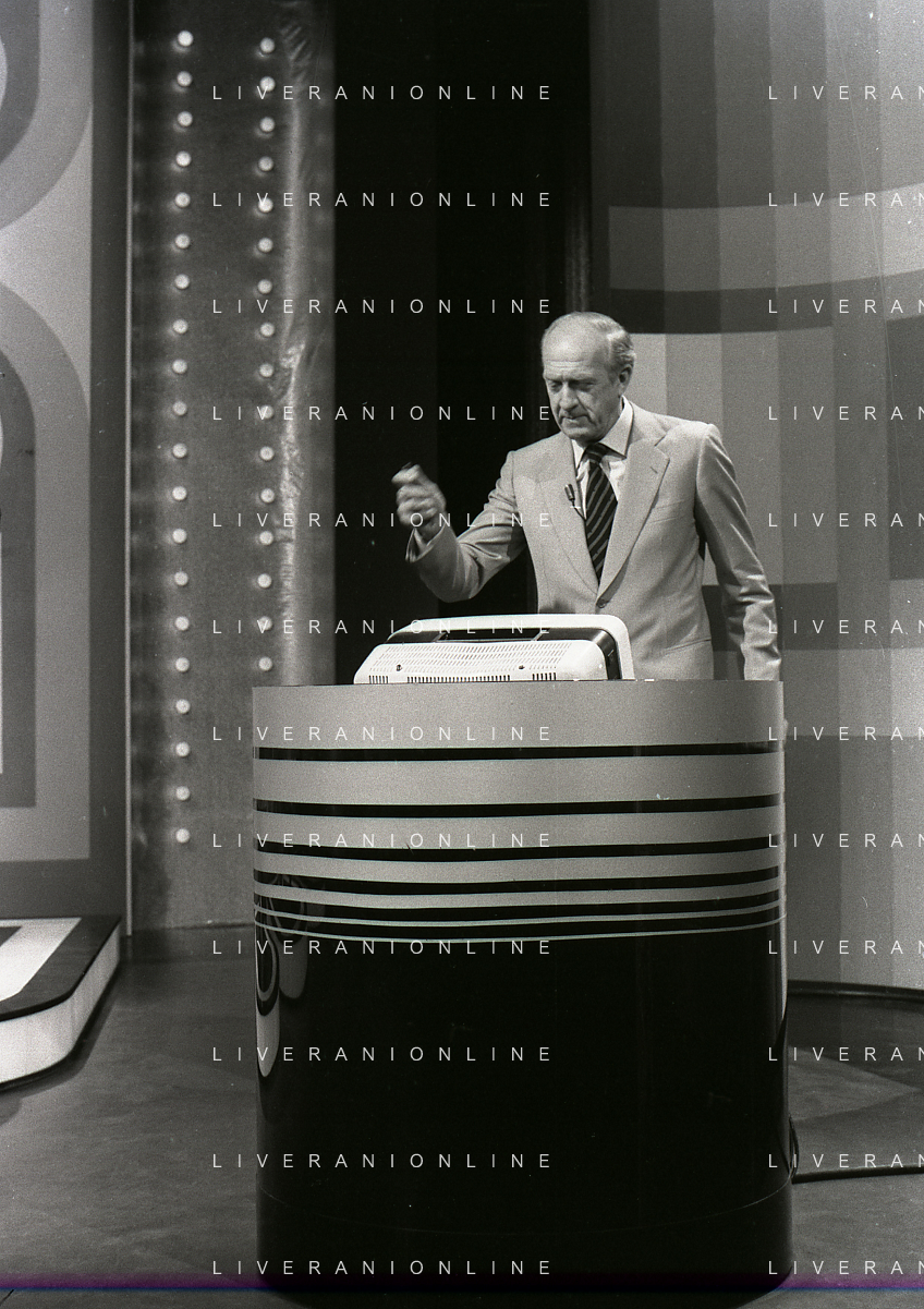 RETROSPETTIVA RAIMONDO VIANELLO E SANDRA MONDAINI ATTORI NELLA FOTO RAIMONDO VIANELLO NELLA TRASMISSIONE TELEVISIVA “SETTE E MEZZO “NELL'ANNO 1980 AG ALDO LIVERANI SAS