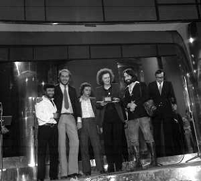 RETROSPETTIVA LUCIO DALLA CANTANTE NELLA FOTO LUCIO DALLA A SANREMO NELL'ANNO 1971 CON IL COMPLESSO MUSICALE 'NUOVA EQUIPE 84' (Victor Sogliani, Franz Di Cioccio, Maurizio Vandelli e Dario Baldan Bembo) E IL PRESENTATORE CARLO GIUFFRE' AG ALDO LIVERANI SAS