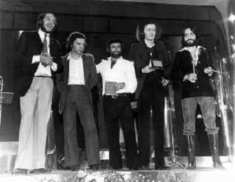RETROSPETTIVA LUCIO DALLA CANTANTE NELLA FOTO LUCIO DALLA A SANREMO NELL'ANNO 1971 CON IL COMPLESSO MUSICALE 'NUOVA EQUIPE 84' (Victor Sogliani, Franz Di Cioccio, Maurizio Vandelli e Dario Baldan Bembo) AG ALDO LIVERANI SAS