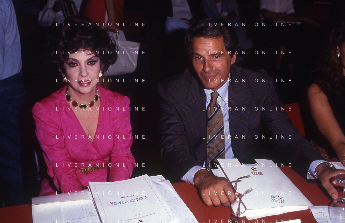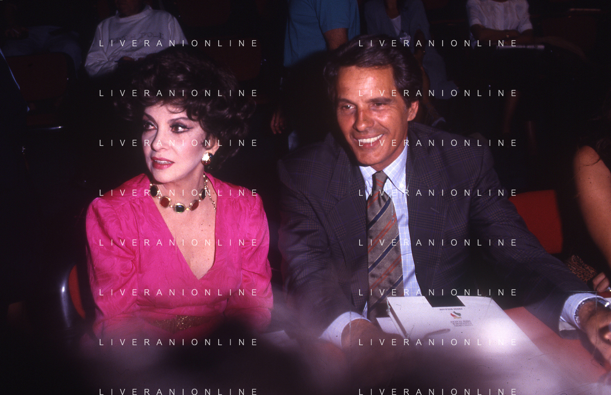 RETROSPETTIVA GINA LOLLOBRIGIDA ATTRICE NELLA FOTO GINA LOLLOBRIGIDA A SALSOMAGGIORE CONCORSO MISS ITALIA PRESIDE LA GIURIA CON GIULIANO GEMMA AG ALDO LIVERANI SAS