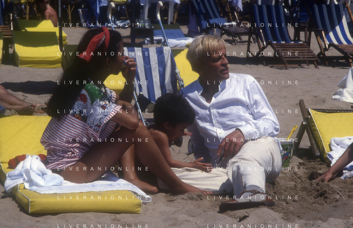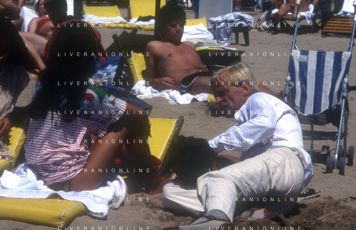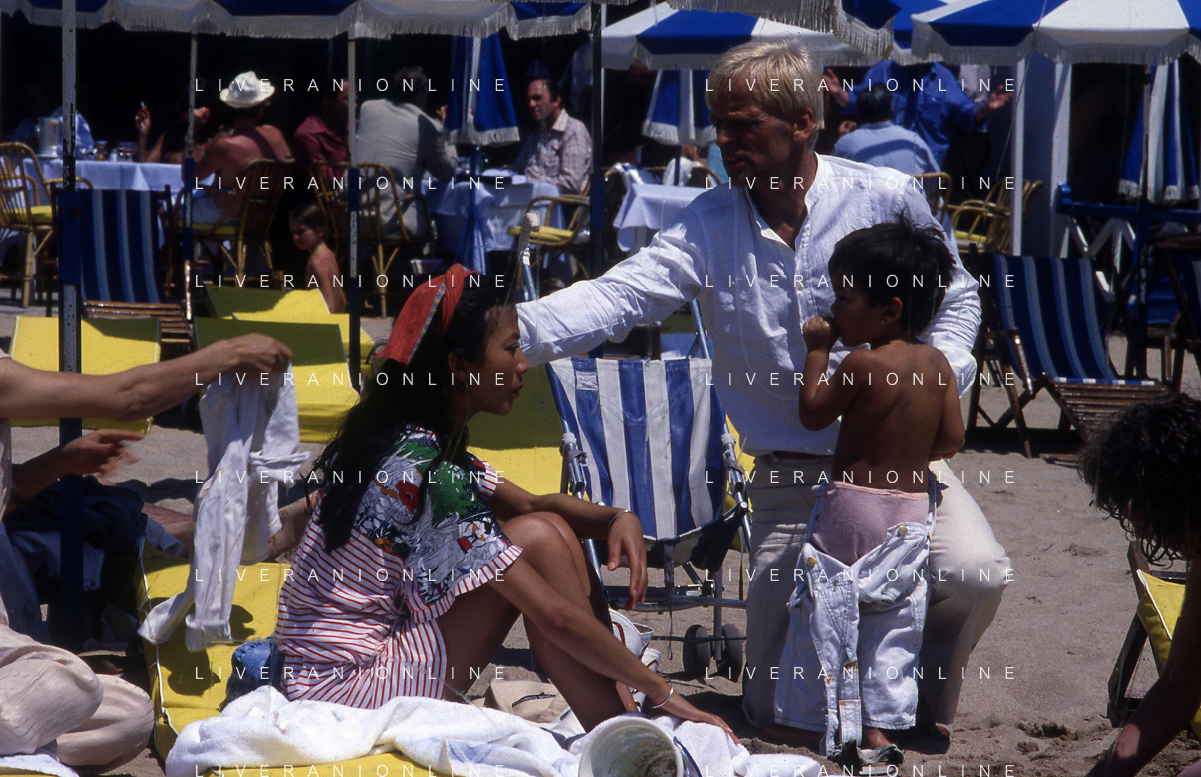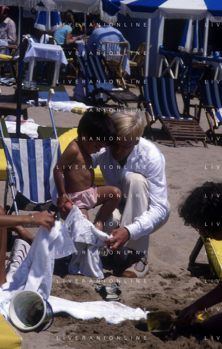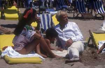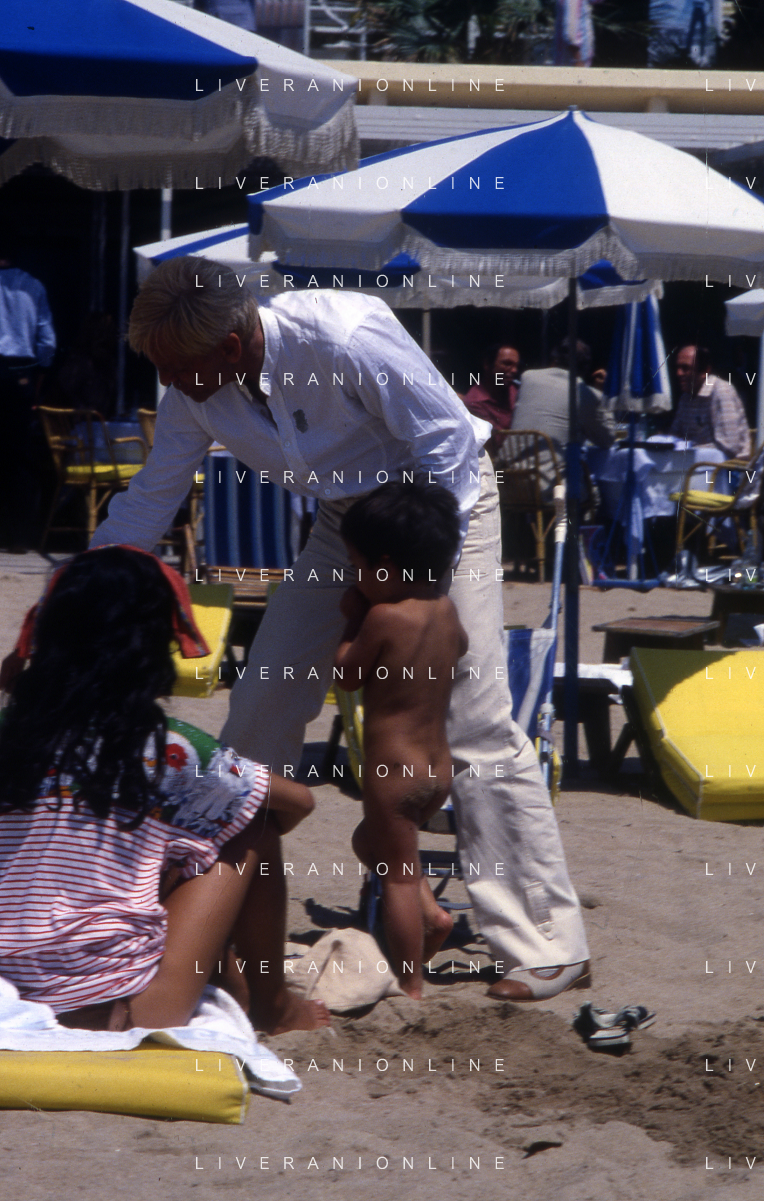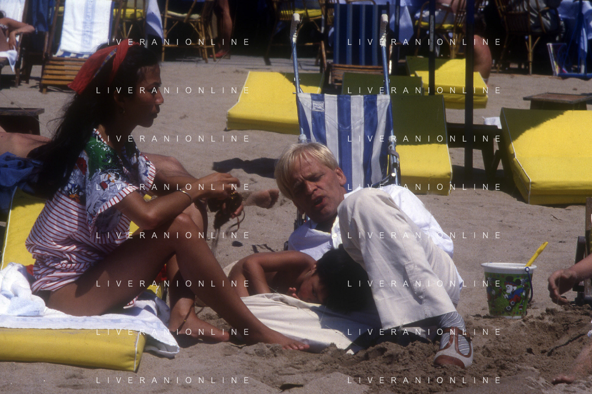 RETROSPETTIVA KLAUS KINSKI ATTORE NELLA FOTO KLAUS KINSKI A CANNES NELL'ANNO 1980 CON LA FAMIGLIA IN SPIAGGIA FOTO ENRICO LIVERANI-AG ALDO LIVERANI SAS