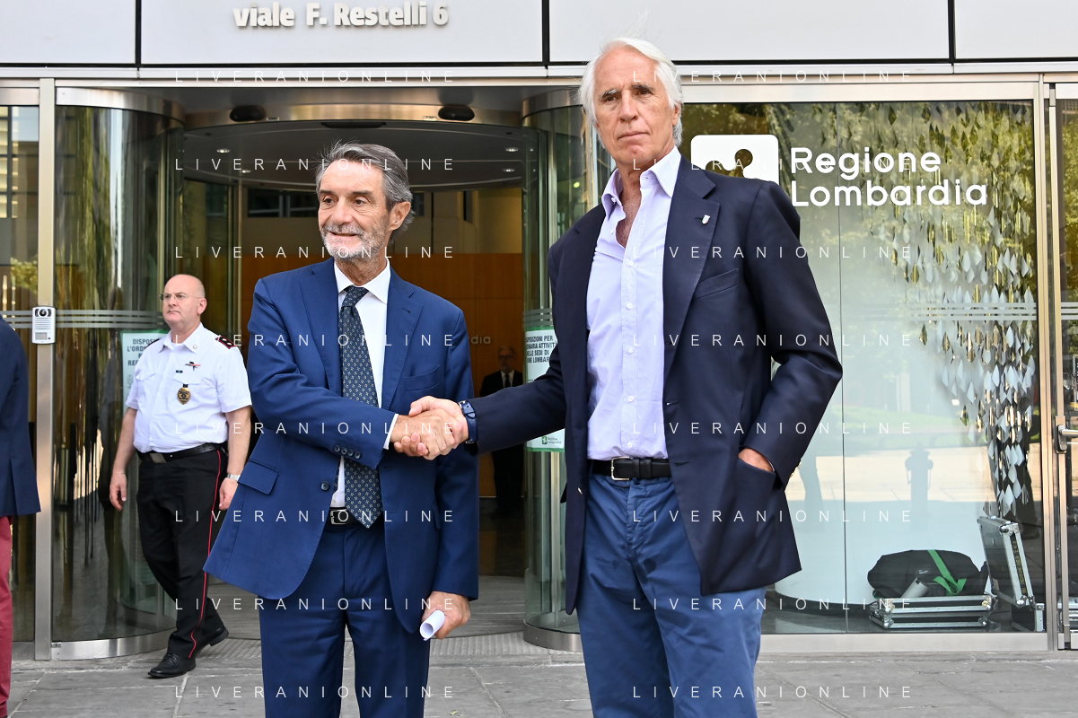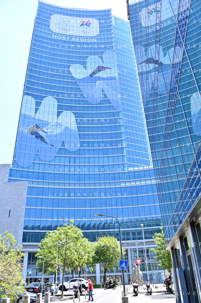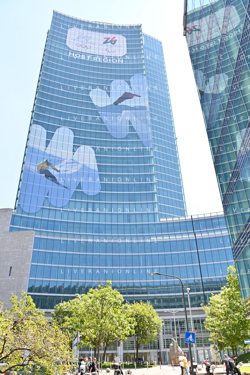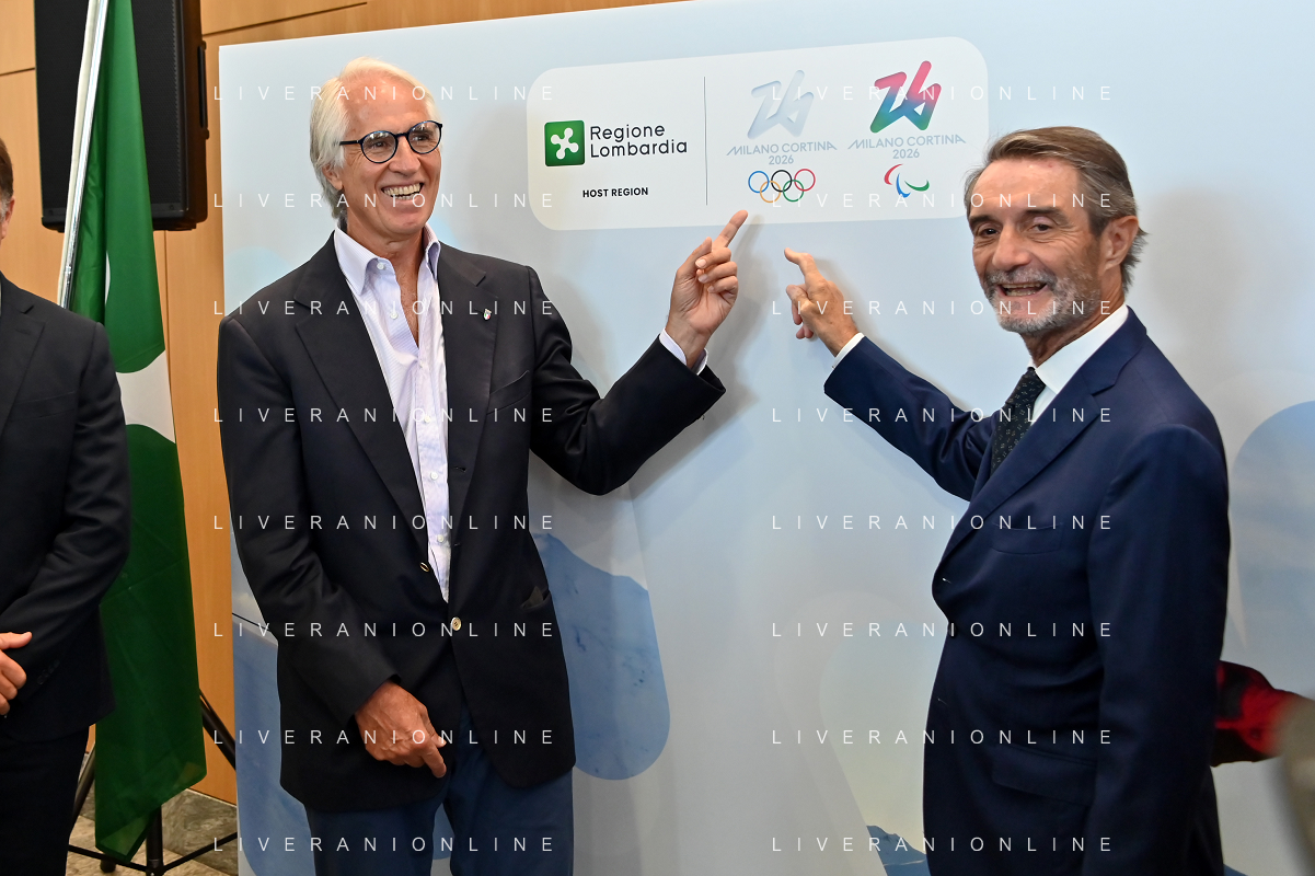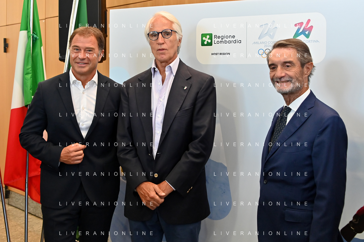 © TVRG Vetrofanie olimpiche Regione Lombardia nella foto da SX Antonio Rossi, Giovanni Malago' e Attilio Fontana Milano 27-07-2022 Incontro tra il presidente di Regione Lombardia, Attilio Fontana, e il presidente del CONI, Giovanni Malago', per fare il punto sui Giochi Olimpici invernali Milano-Cortina 2026 e per mostrare le vetrofanie olimpiche che caratterizzano le facciate di Palazzo Lombardia foto Roberto Garavaglia/ag. Aldo Liverani sas/AGENZIA ALDO LIVERANI SAS