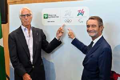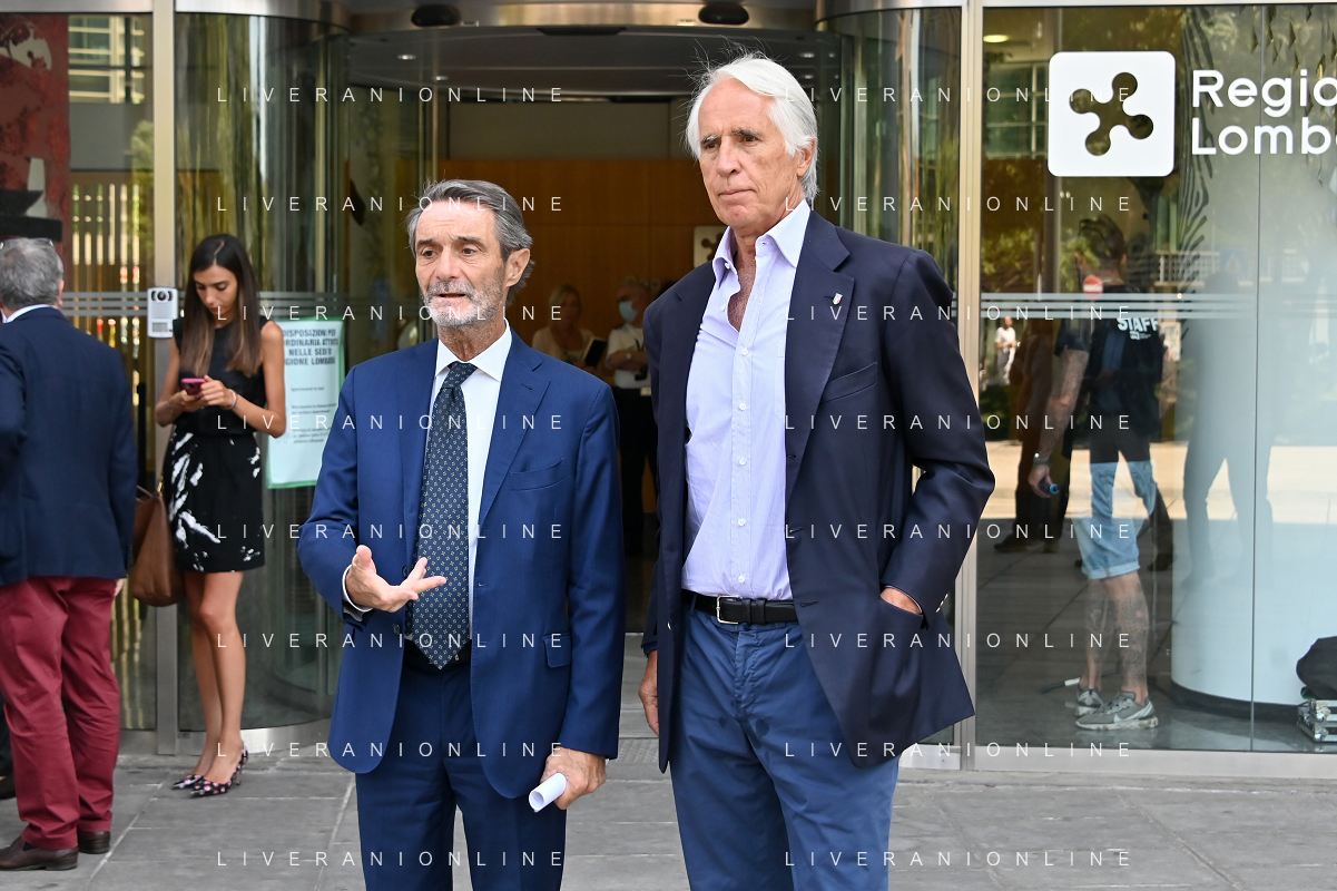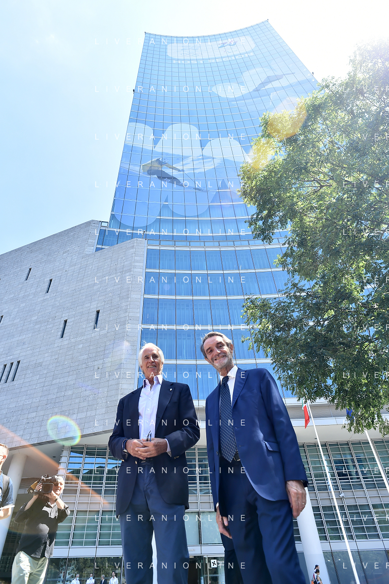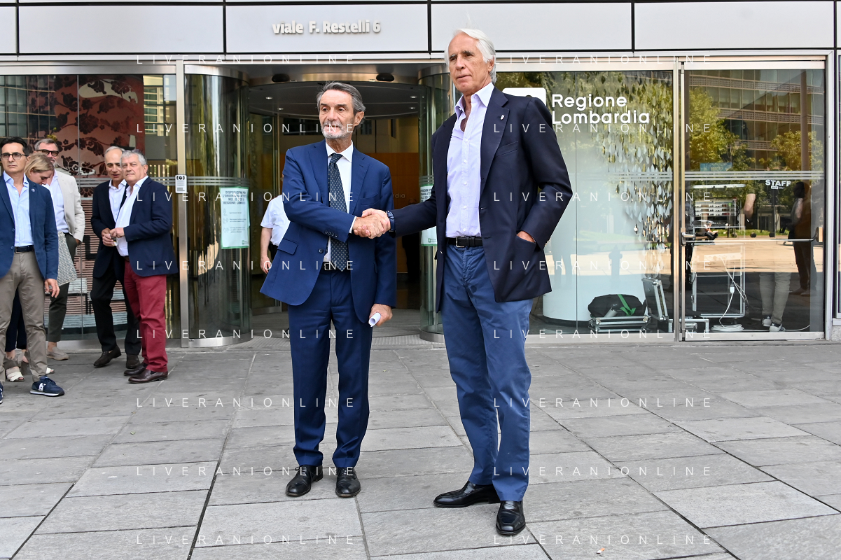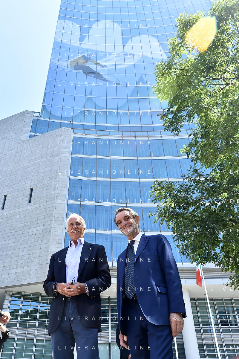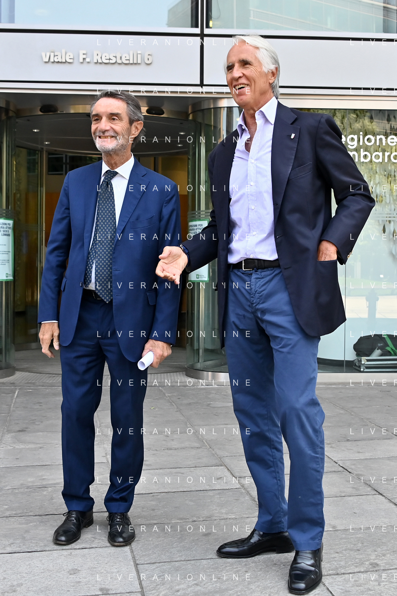 © TVRG Vetrofanie olimpiche Regione Lombardia nella foto da SX Antonio Rossi, Giovanni Malago' e Attilio Fontana Milano 27-07-2022 Incontro tra il presidente di Regione Lombardia, Attilio Fontana, e il presidente del CONI, Giovanni Malago', per fare il punto sui Giochi Olimpici invernali Milano-Cortina 2026 e per mostrare le vetrofanie olimpiche che caratterizzano le facciate di Palazzo Lombardia foto Roberto Garavaglia/ag. Aldo Liverani sas/AGENZIA ALDO LIVERANI SAS
