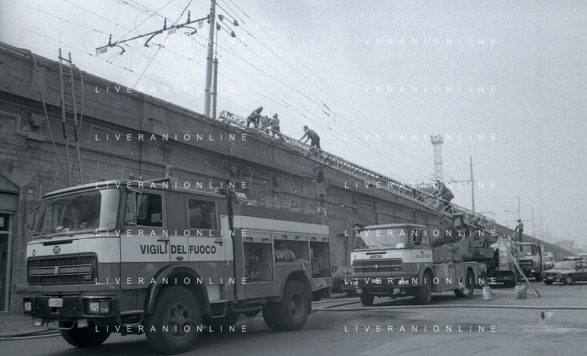 22-05-1989 MILANO STAZIONE CENTRALE A FUOCO UNA CAROZZA DEL TRENO NELLA FOTO I POMPIERI AL LAVORO PER SPEGNERE UN INCENDIO SULLA CARROZZA DI UN TRENO ALLA STAZIONE CENTRALE DI MILANO AG ALDO LIVERANI SAS