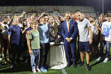 TRIANGOLARE SALERNITANA-REGGINA-ADANA DEMIRSPOR 'TROFEO IERVOLINO' SALERNO 30.07.2022 NELLA FOTO LA PREMIAZIONE DI VINCENZO MONTELLA CON LA COPPA CON IL PRESIDENTE DELLA SALERNITANA DANILO IERVOLINO ©GARREFFA/AGENZIA ALDO LIVERANI SAS