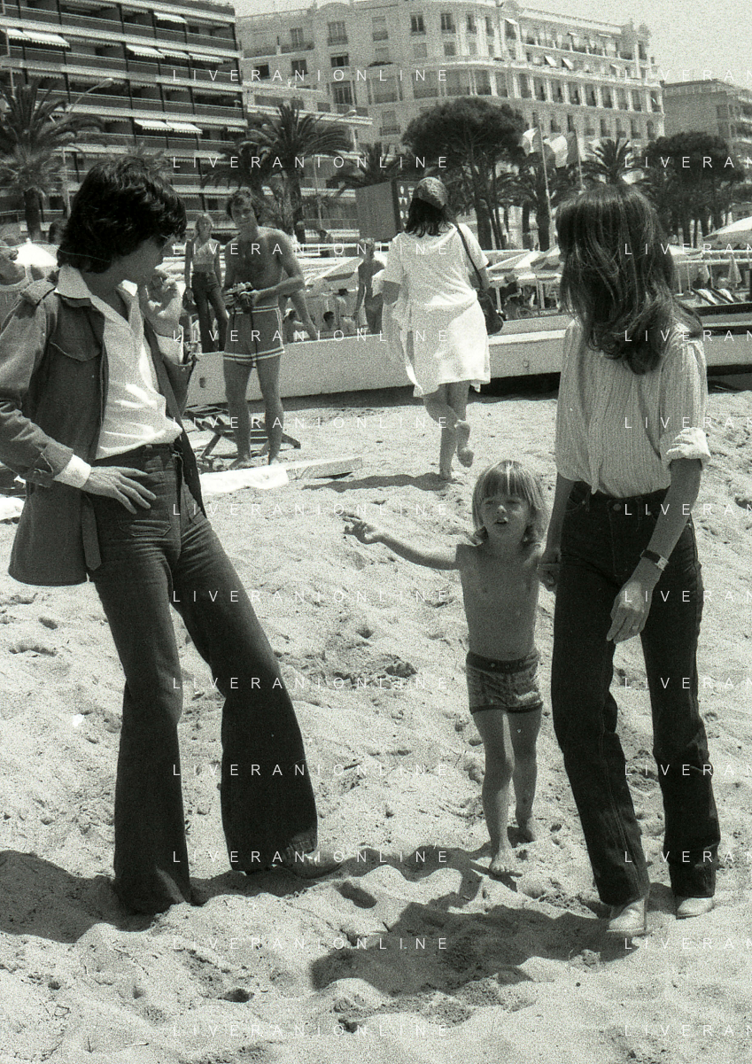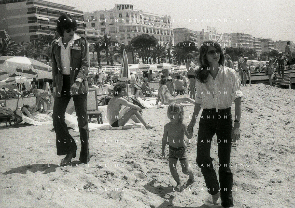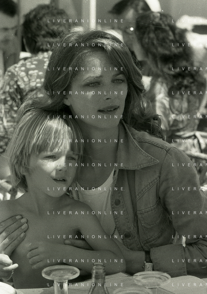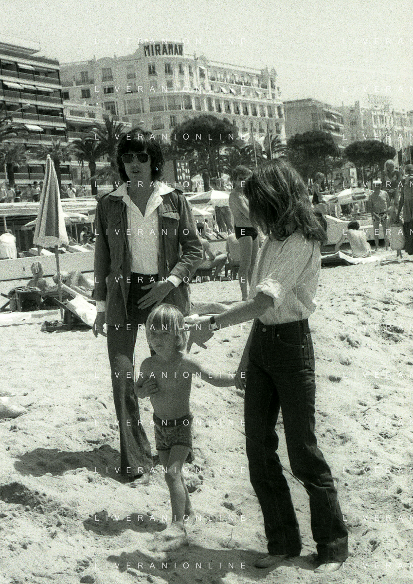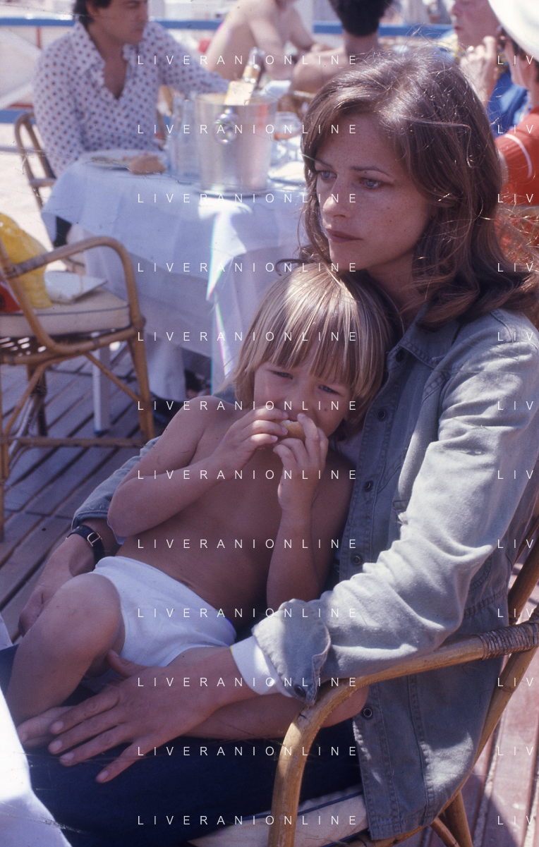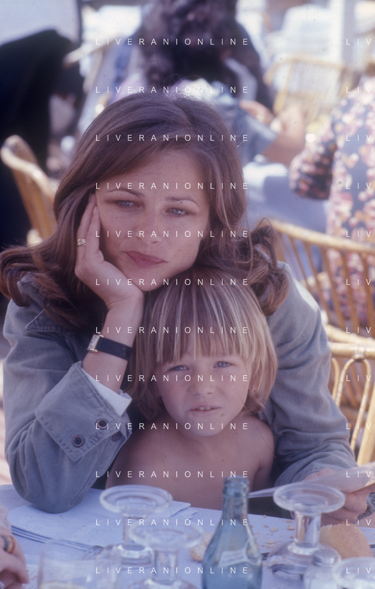 RETROSPETTIVA CHARLOTTE RAMPLING ATTRICE NELLA FOTO CHARLOTTE RAMPLING A CANNES NELL'ANNO 1976 CON IL FIGLIO BARNABY E IL SECONDO MARITO JEAN MICHEL JARRE AG ALDO LIVERANI SAS