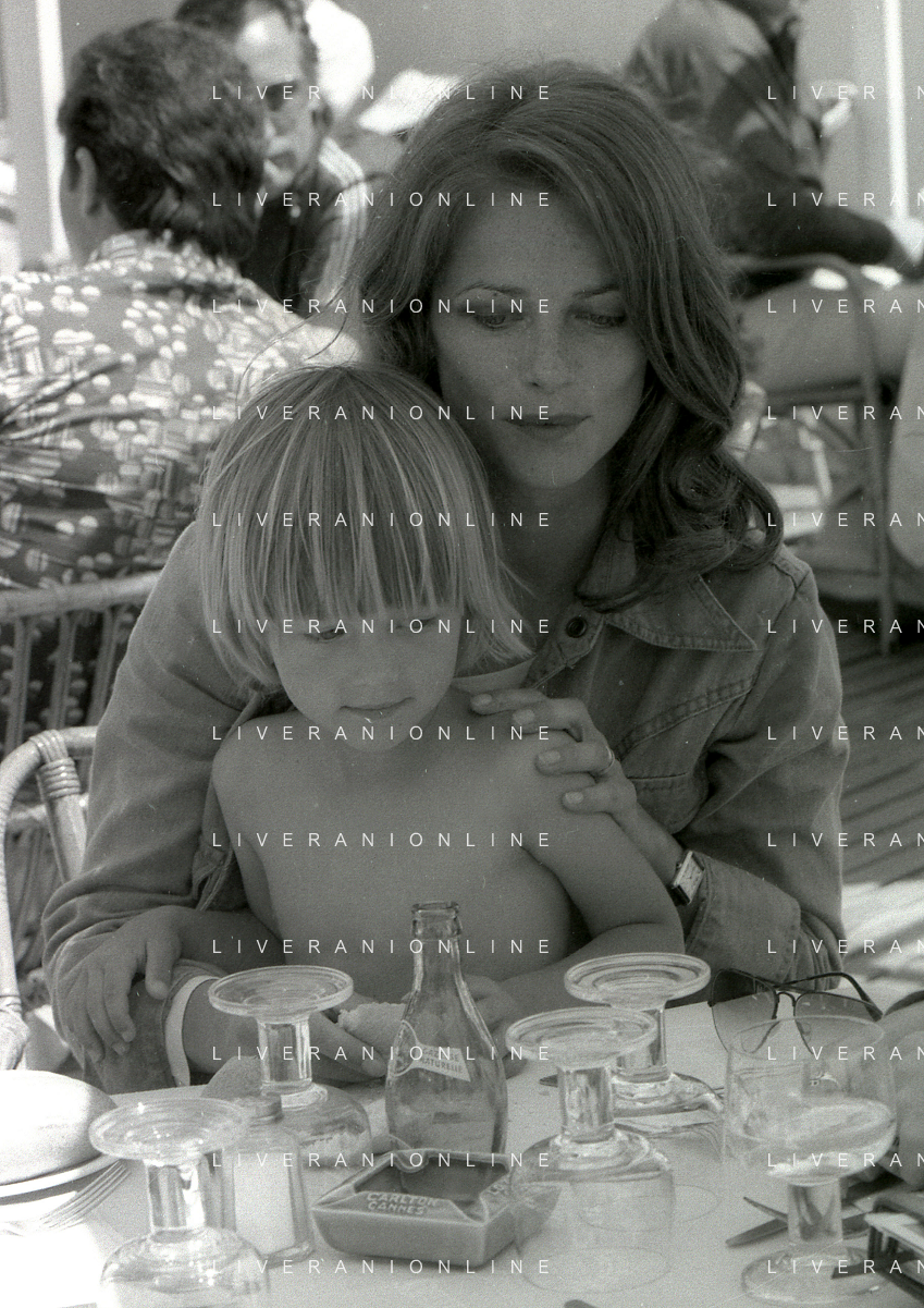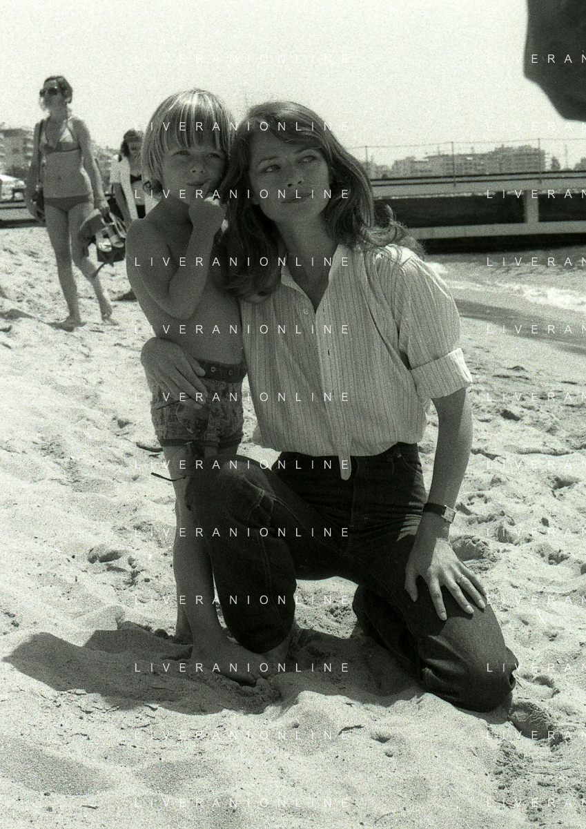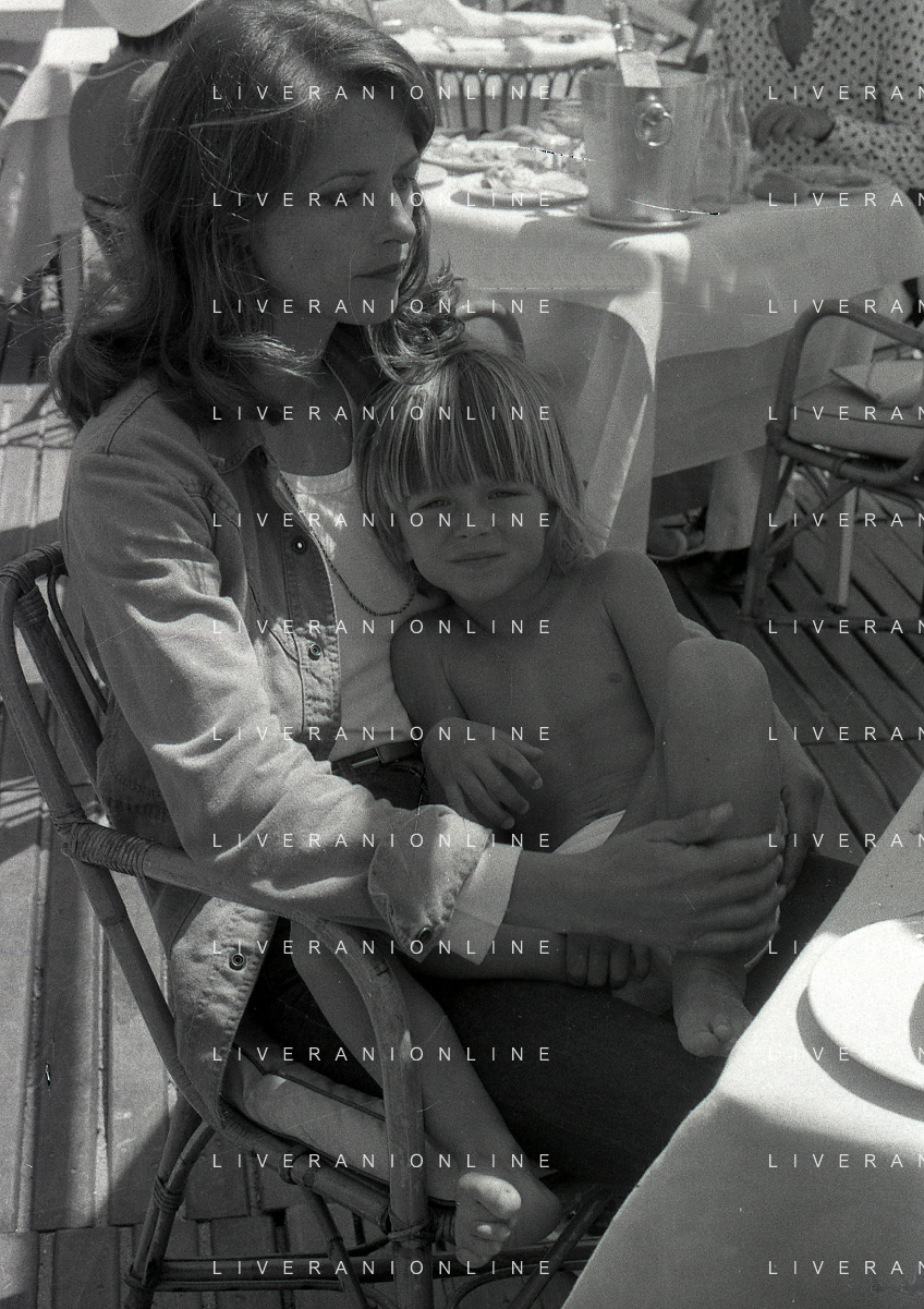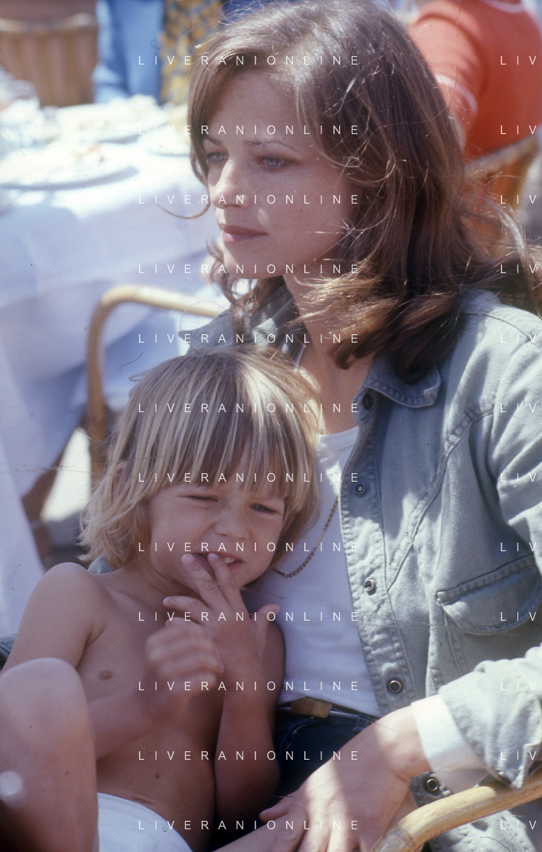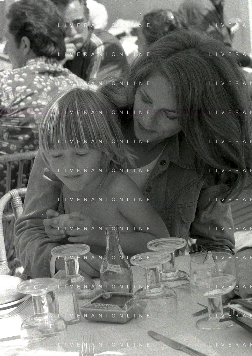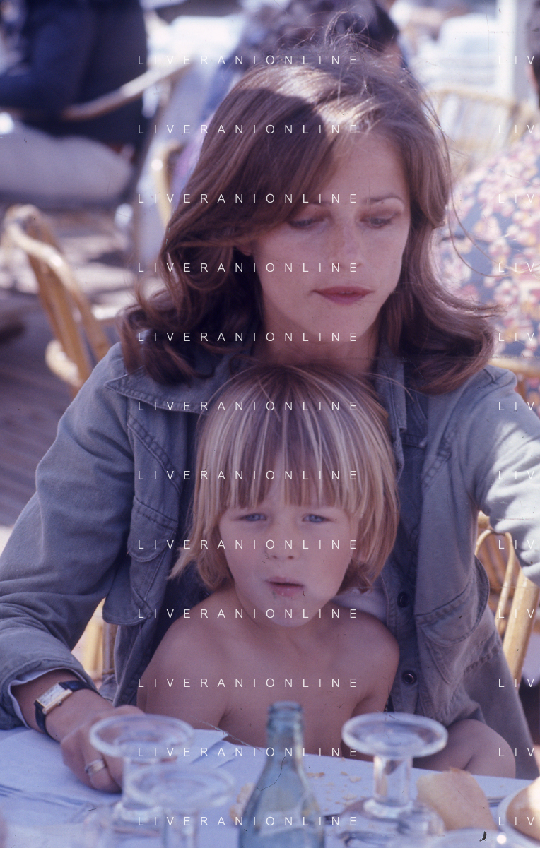 RETROSPETTIVA CHARLOTTE RAMPLING ATTRICE NELLA FOTO CHARLOTTE RAMPLING A CANNES NELL'ANNO 1976 CON IL FIGLIO BARNABY E IL SECONDO MARITO JEAN MICHEL JARRE AG ALDO LIVERANI SAS