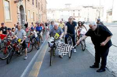 IMOLA 12 08 2022 PEDALATA DI SAN CASSIANO SOSTA AGLI SCAVI E AL CIPPO DI SAN CASSIANO NELLA FOTO IL VESCOVO GIOVANNI MOSCIATTI ABBASSA LA BANDIERA SCACCHI PER DARE IL INVIA ALLA PEDALATA DI SAN CASSIANO