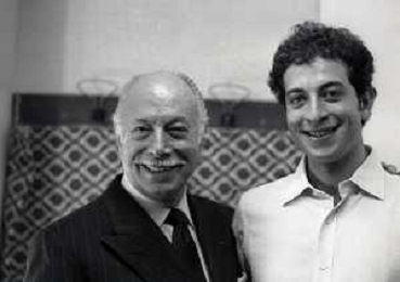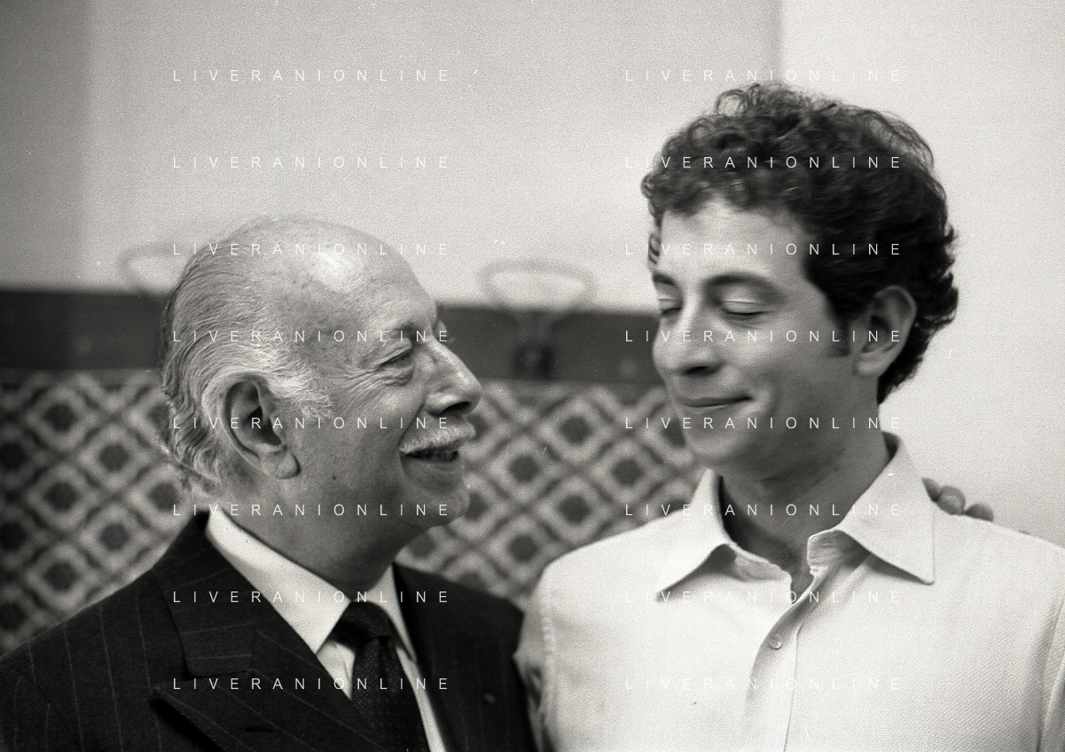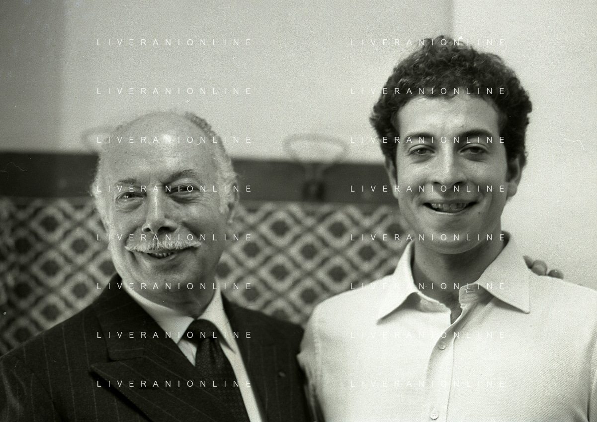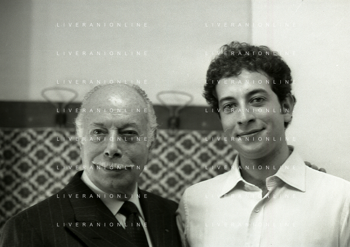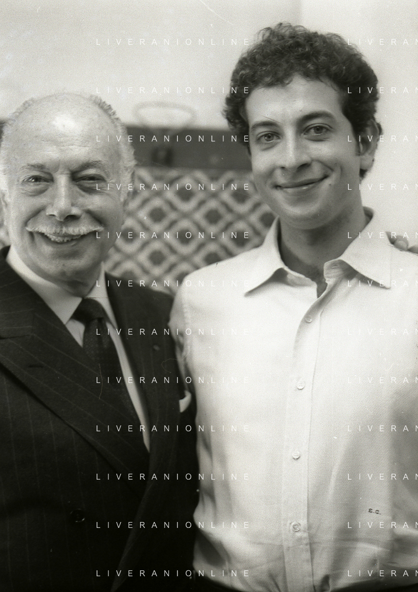 RETROSPETTIVA ERNESTO CALINDRI ATTORE NELLA FOTO ERNESTO CALINDRI CON IL FIGLIO GABRIELE AL TEATRO NAZIONALE DI MILANO NELL'ANNO 1986 AG ALDO LIVERANI SAS