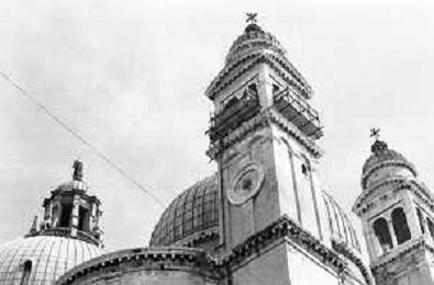 VEDUTE DELLA CITTA ' DI VENEZIA DURANTE IL RESTAURO DEL 1971 - RETROSPETTIVA NELLA FOTO IL CAMPANILE DELLA CHIESA O BASILICA DI SANTA MARIA DELLA SALUTE CANAL GRANDE ©Archivio Giovanni Liverani/AGENZIA ALDO LIVERANI SAS