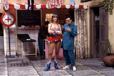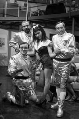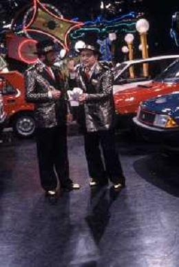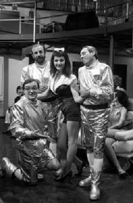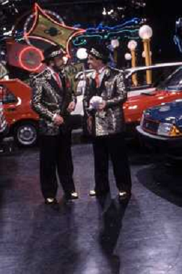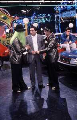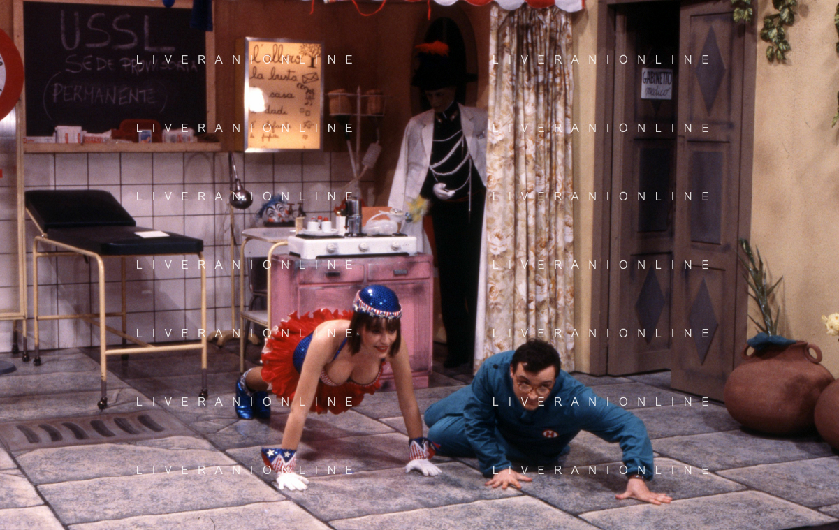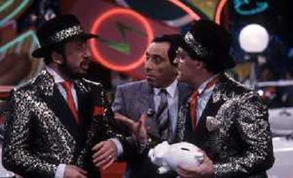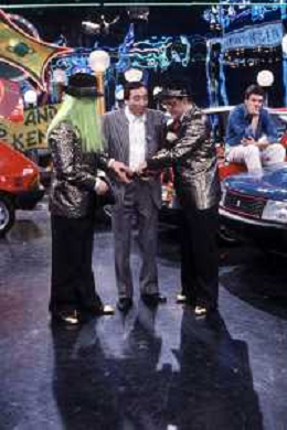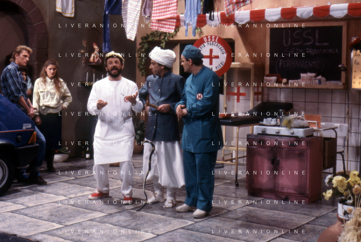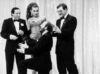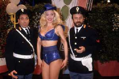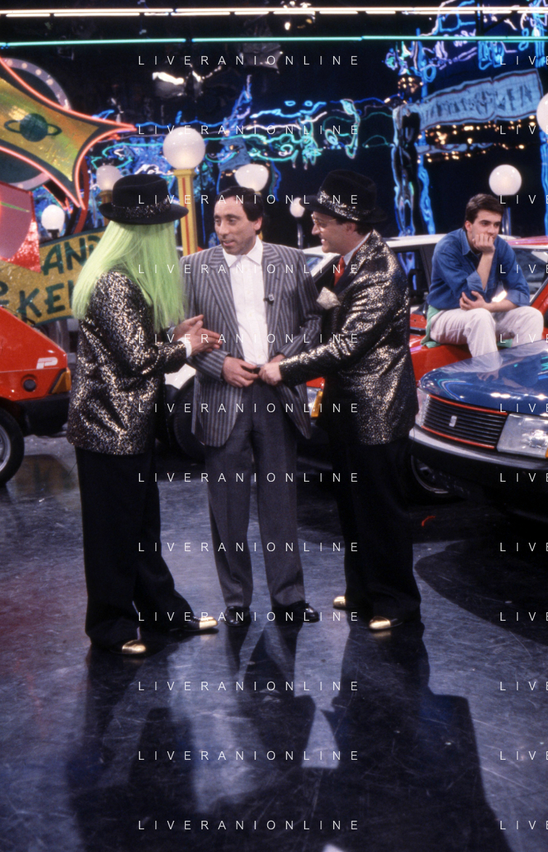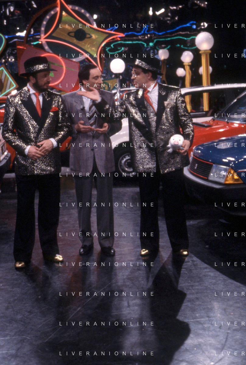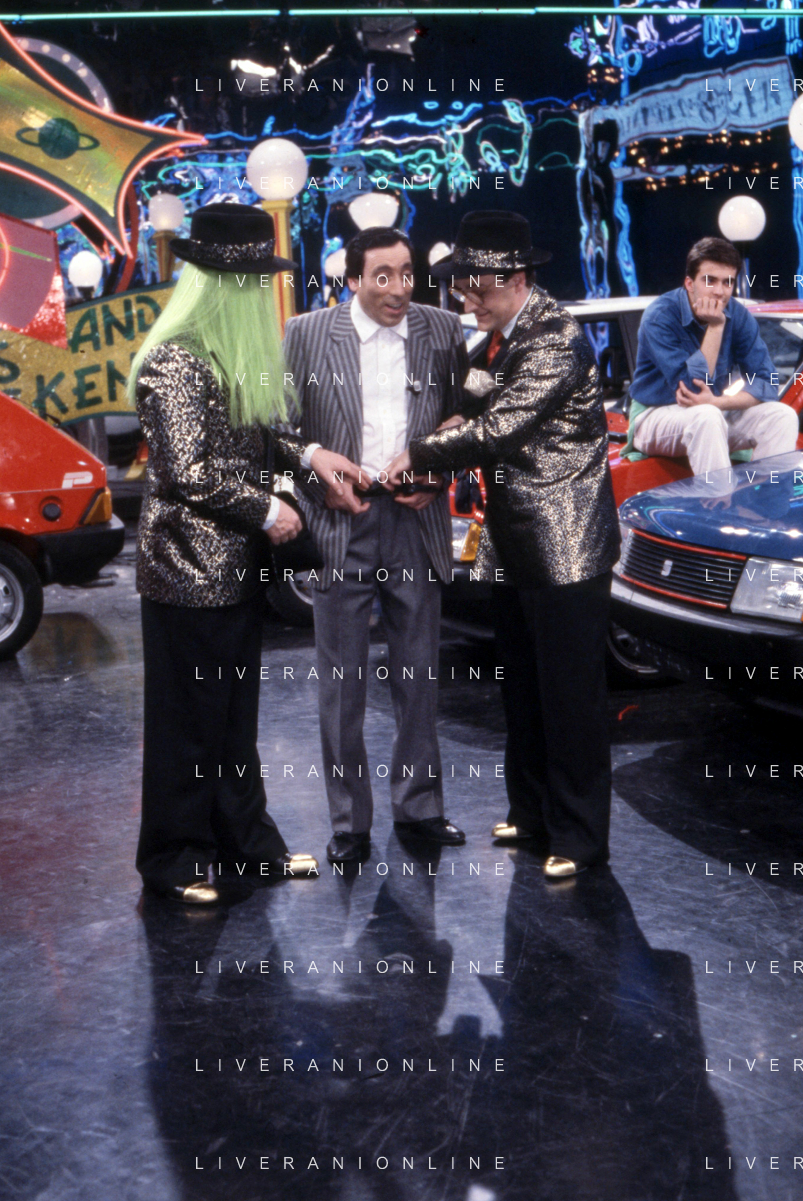 I TRETTRE' , TRIO COMICO NAPOLETANO, COMPOSTO DA GINO COGLIANDRO, EDOARDO ROMANO E MIRKO SETARO NELLA FOTO GINO COGLIANDRO, EDOARDO ROMANO CON MOANA POZZI A 'DRIVE IN ' NEL 1988 AG ALDO LIVERANI SAS