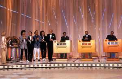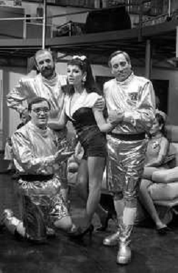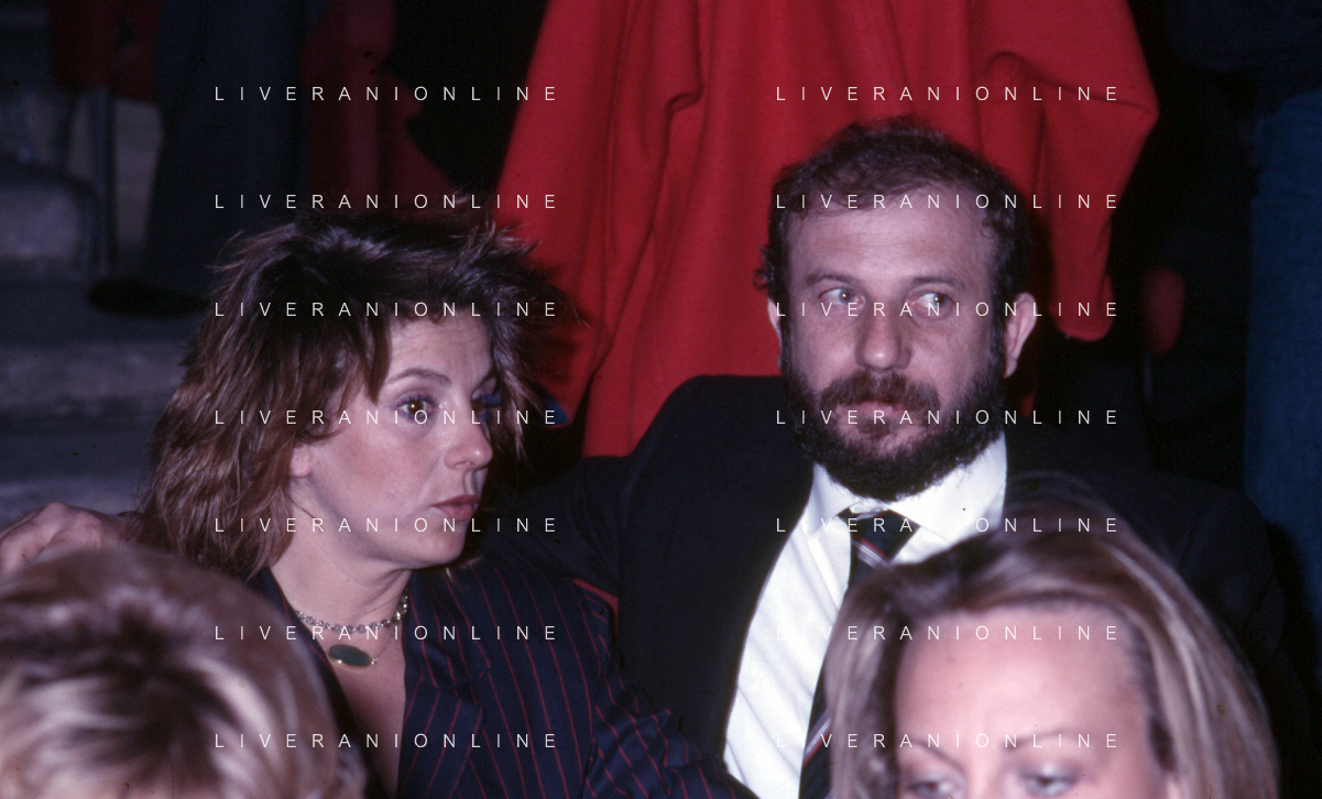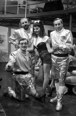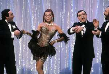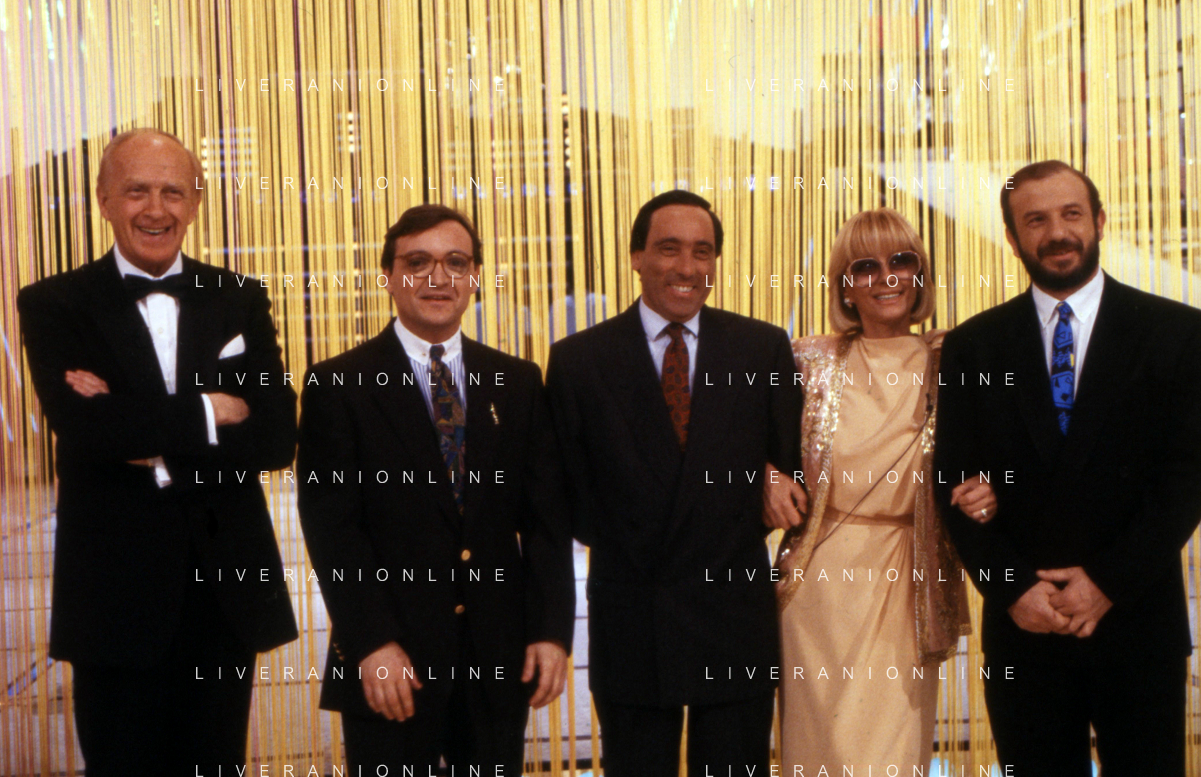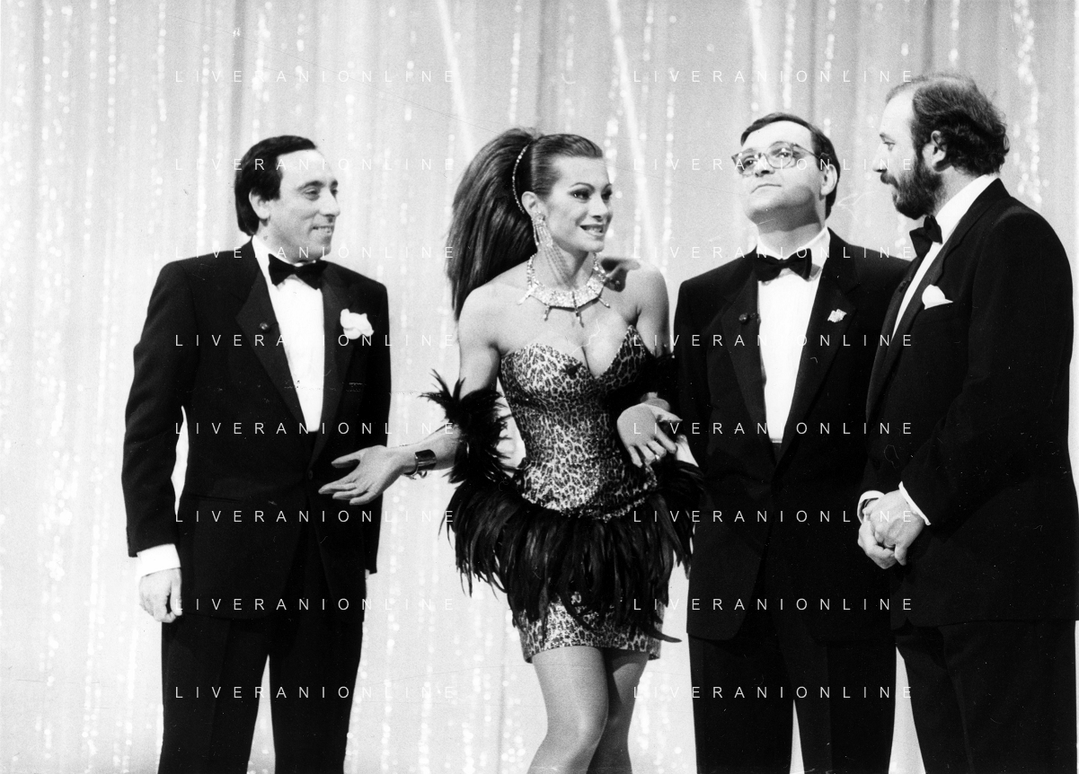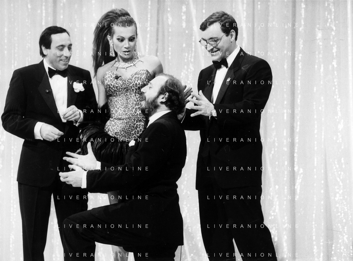 I TRETTRE' , TRIO COMICO NAPOLETANO, COMPOSTO DA GINO COGLIANDRO, EDOARDO ROMANO E MIRKO SETARO NELLA FOTO CON CARMEN RUSSO NEL PROGRAMMA TV ' QUEL FANTASTICO TRAGICO VENERDI' ' NEL 1987 AG ALDO LIVERANI SAS