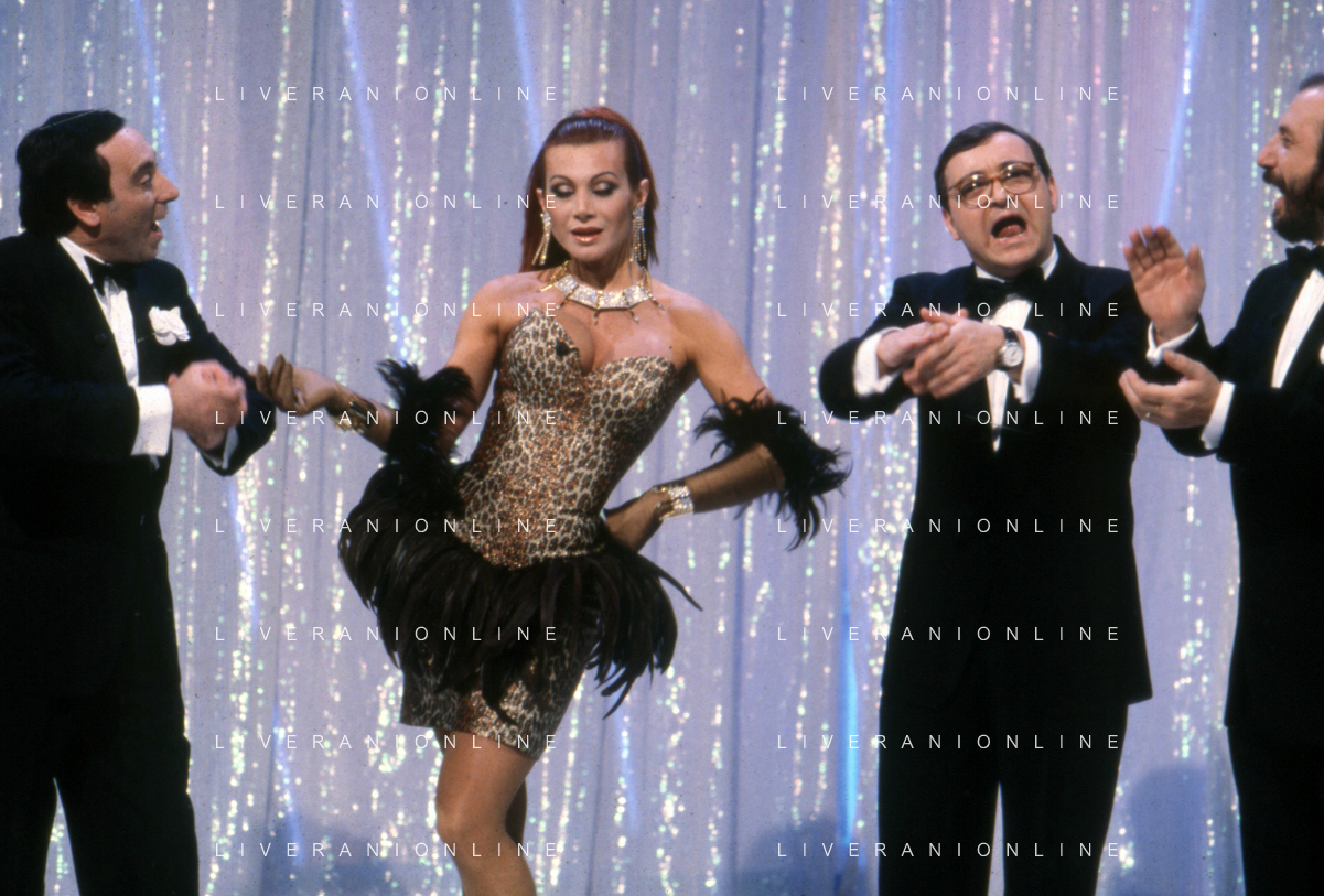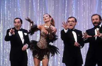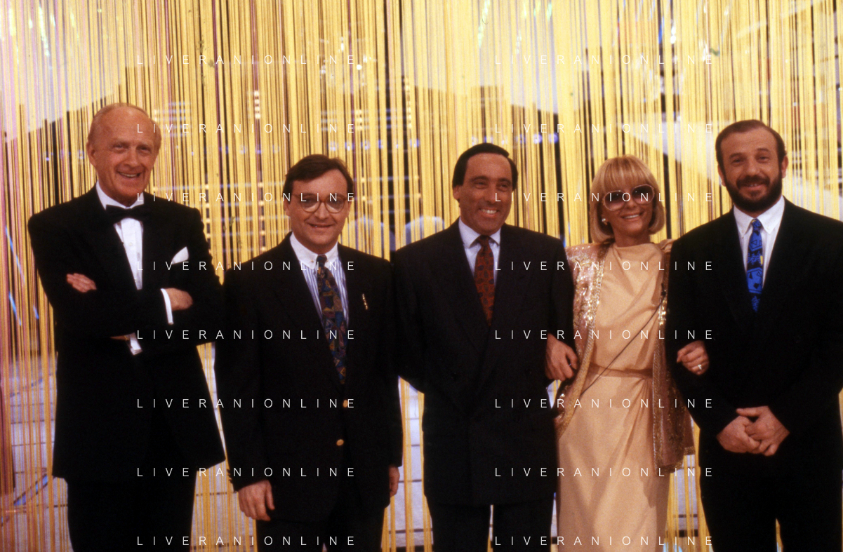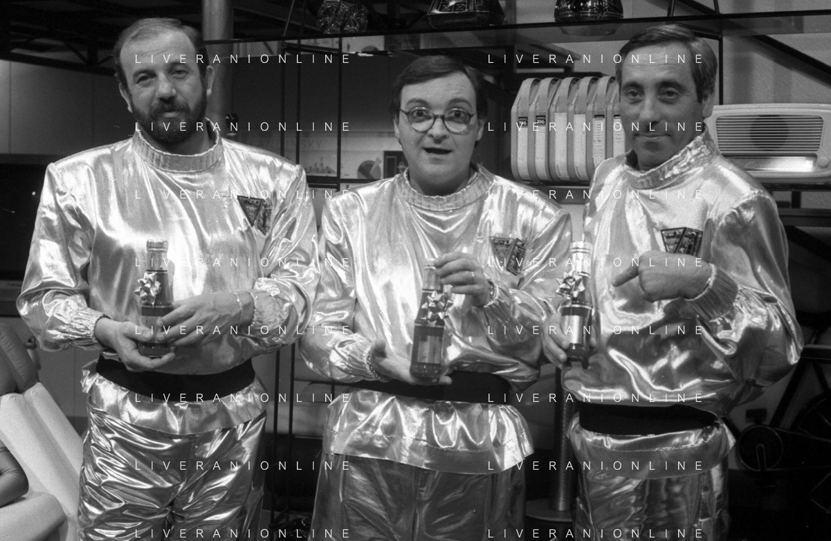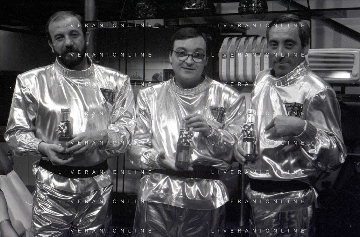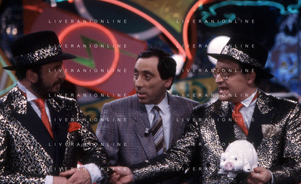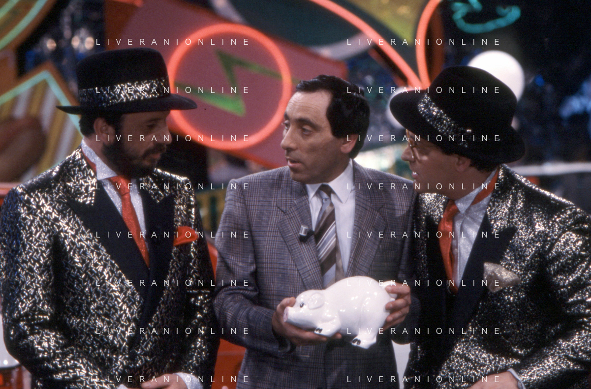 I TRETTRE' , TRIO COMICO NAPOLETANO, COMPOSTO DA GINO COGLIANDRO, EDOARDO ROMANO E MIRKO SETARO NELLA FOTO CON IL MAESTRO TONY DE VITA NEL PROGRAMMA TV DI RAIMONDO VIANELLO E SANDRA MONDAINI AG ALDO LIVERANI SAS