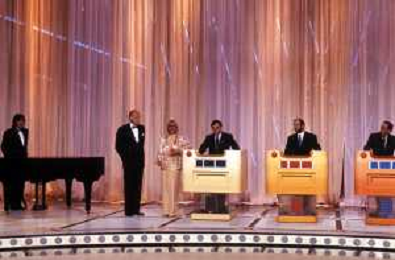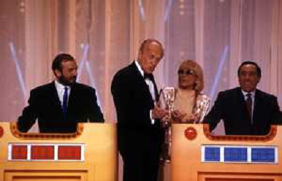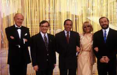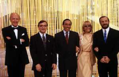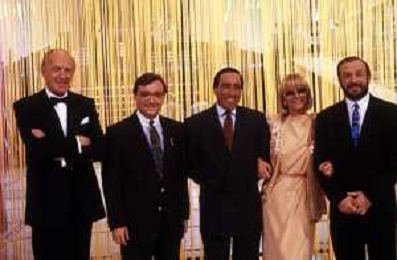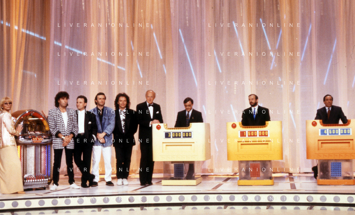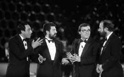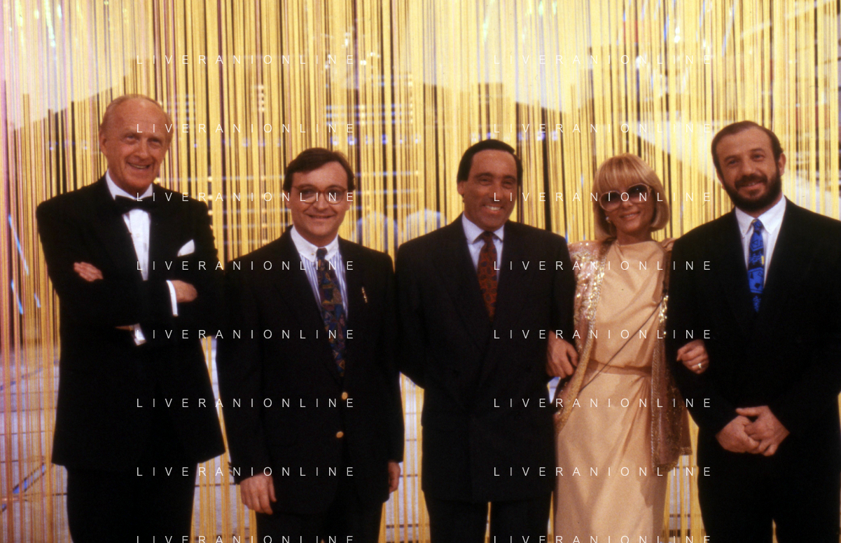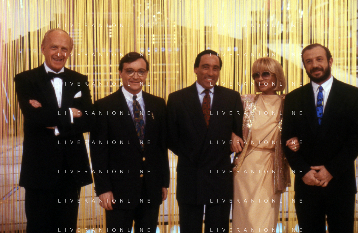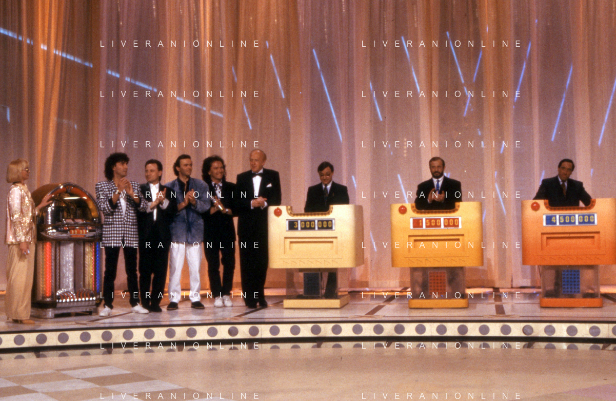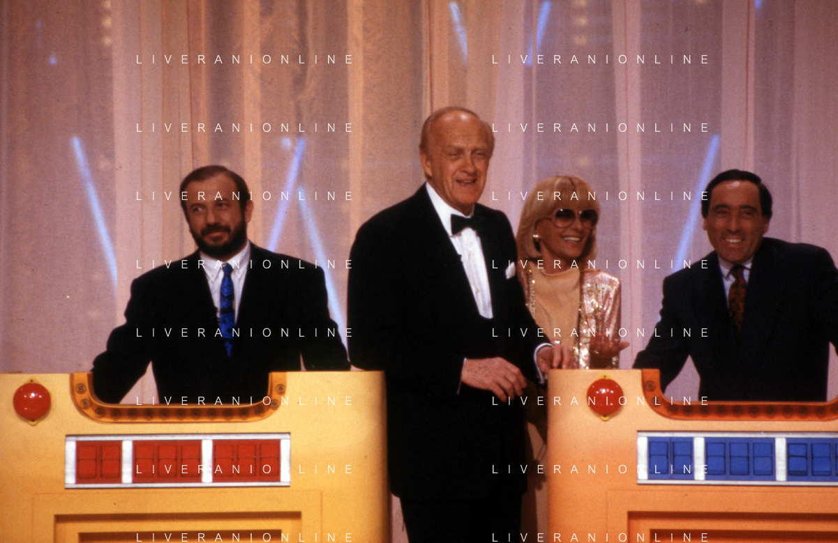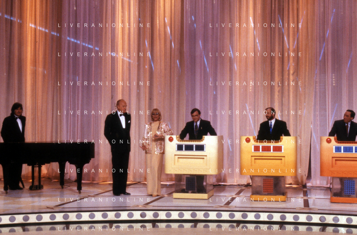 I TRETTRE' , TRIO COMICO NAPOLETANO, COMPOSTO DA GINO COGLIANDRO, EDOARDO ROMANO E MIRKO SETARO NELLA FOTO CON IL MAESTRO TONY DE VITA NEL PROGRAMMA TV DI RAIMONDO VIANELLO E SANDRA MONDAINI AG ALDO LIVERANI SAS