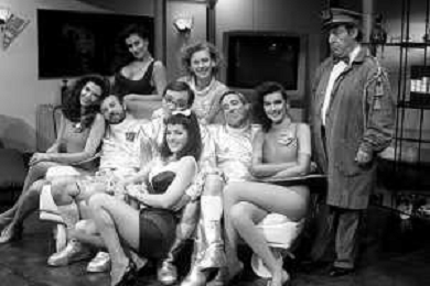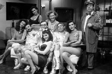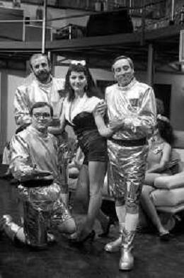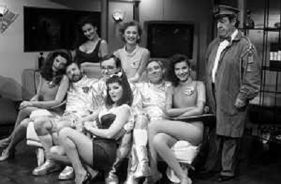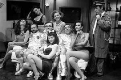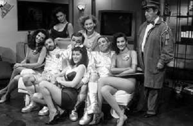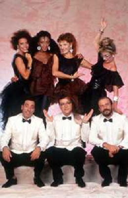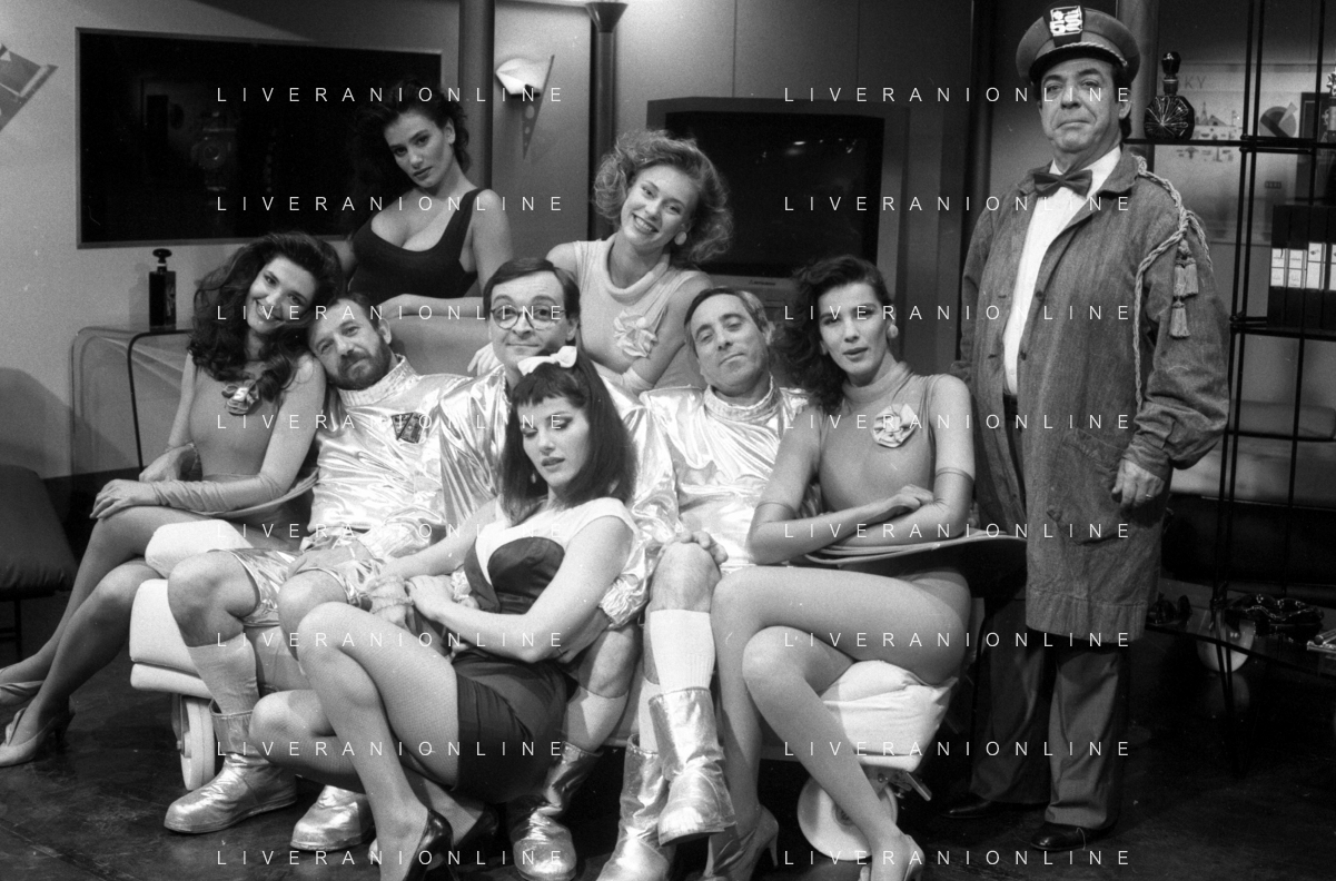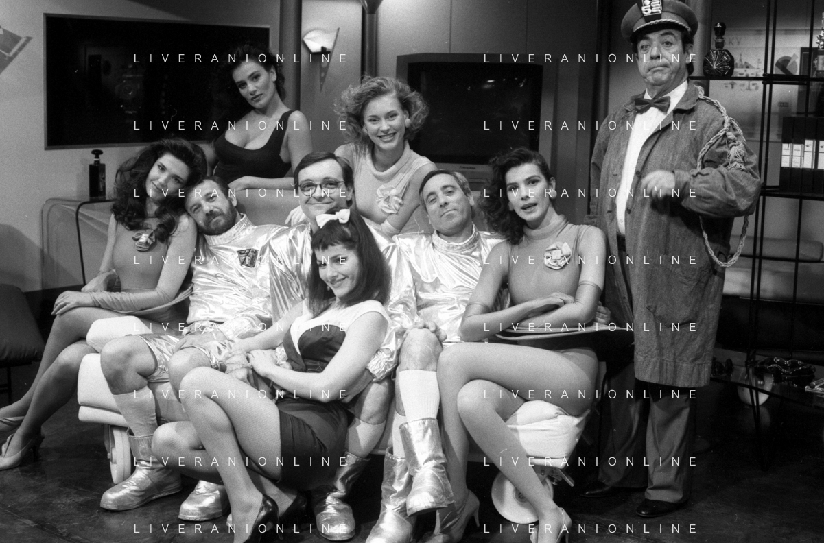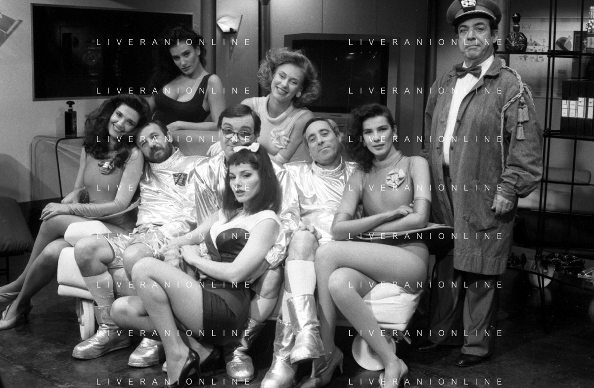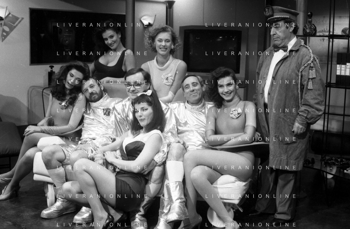 I TRETTRE' , TRIO COMICO NAPOLETANO, COMPOSTO DA GINO COGLIANDRO, EDOARDO ROMANO E MIRKO SETARO NELLA FOTO CON LE RAGAZZE FAST FOOD CAST DI 'DRIVE IN' DEL 1988 - TINI' CANSINO, CATERINA SYLOS LABINI, JOHARA VALERIE RACZ E OLGA DURANO AG ALDO LIVERANI SAS