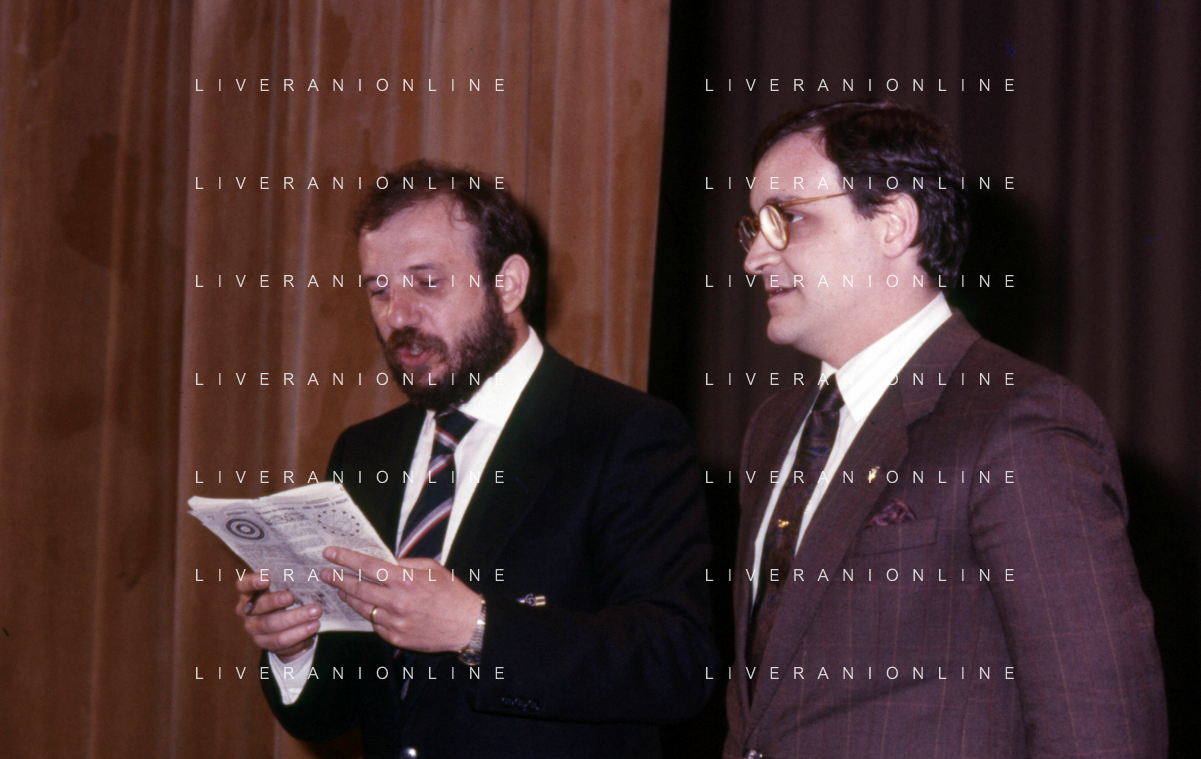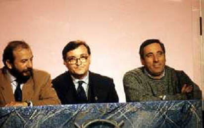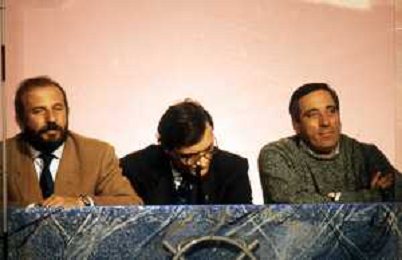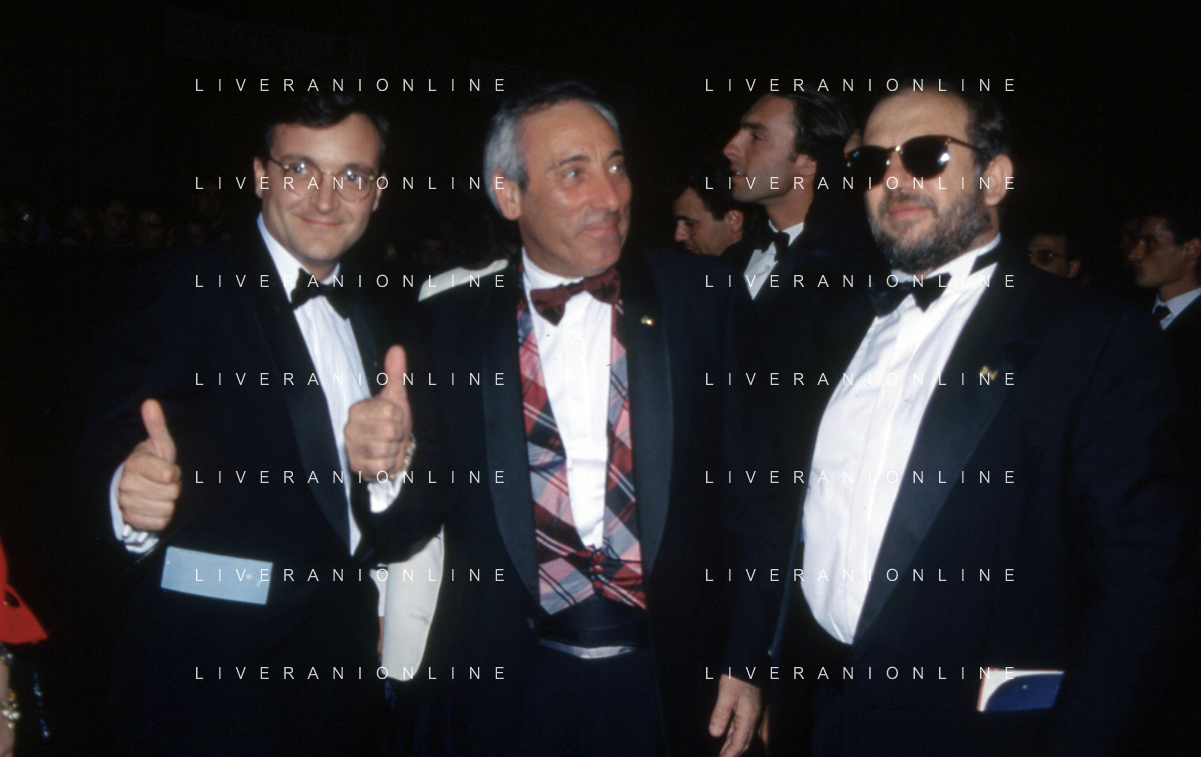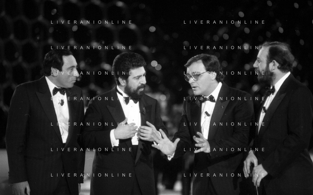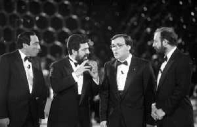 I TRETTRE' , TRIO COMICO NAPOLETANO, COMPOSTO DA GINO COGLIANDRO, EDOARDO ROMANO E MIRKO SETARO NELLA FOTO CON LELLO ARENA A MILANO FEBBRAIO 1988 AG ALDO LIVERANI SAS