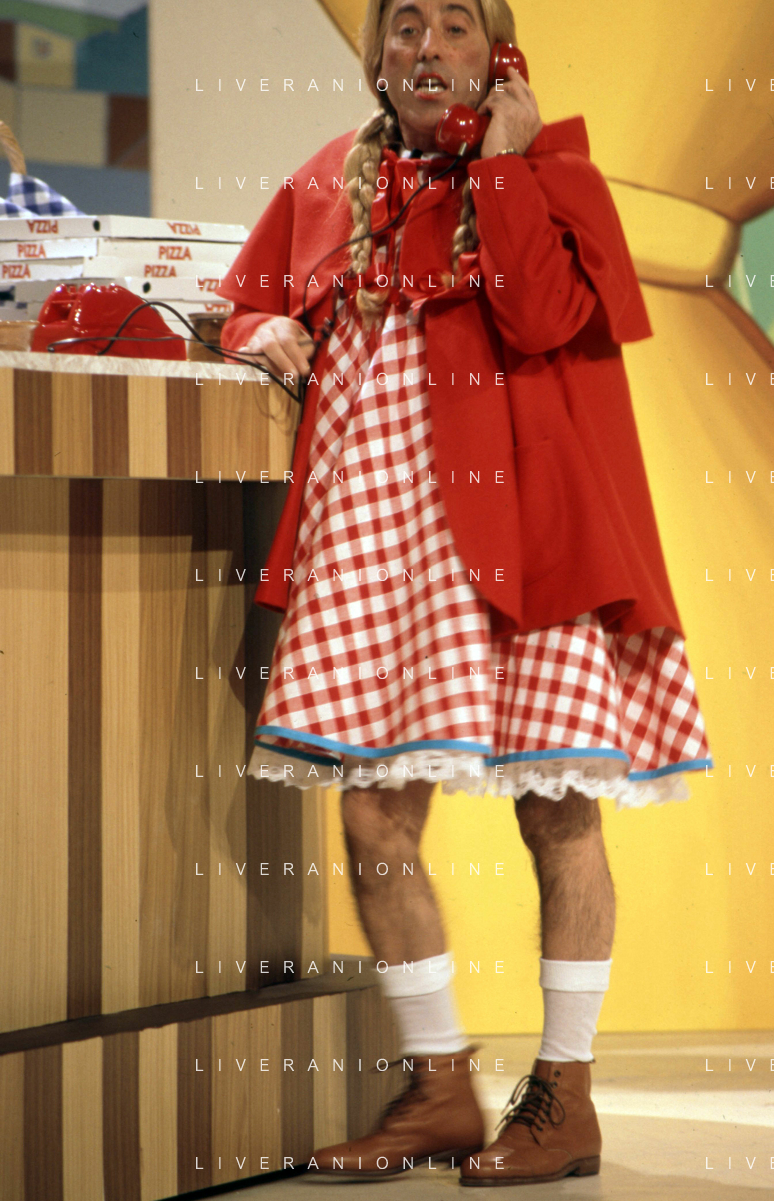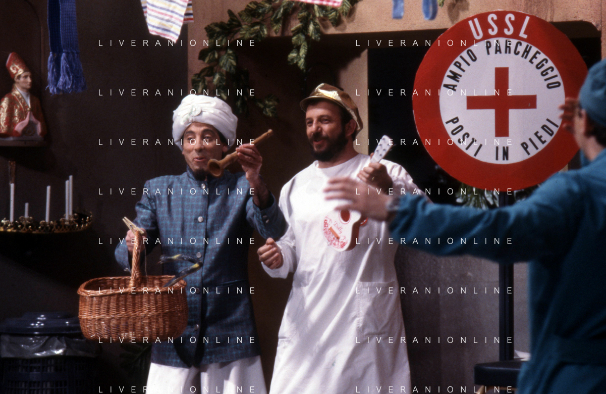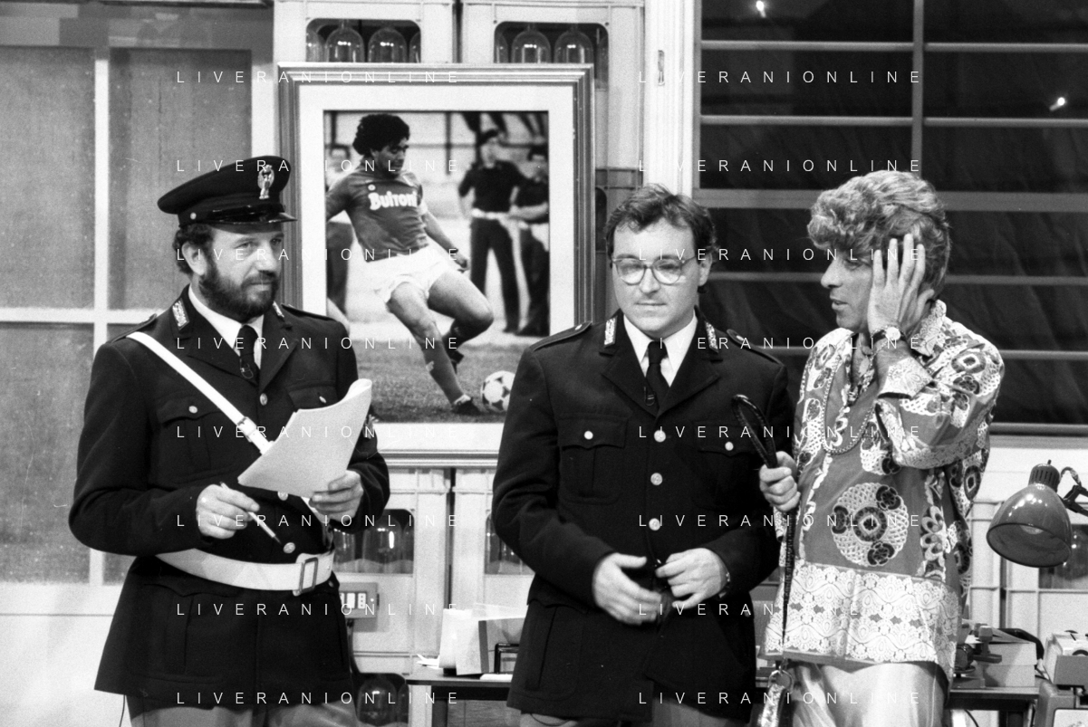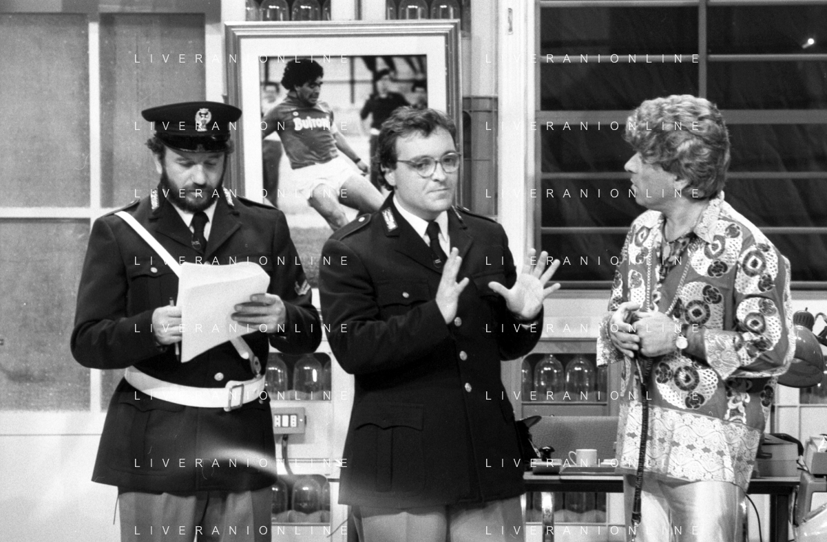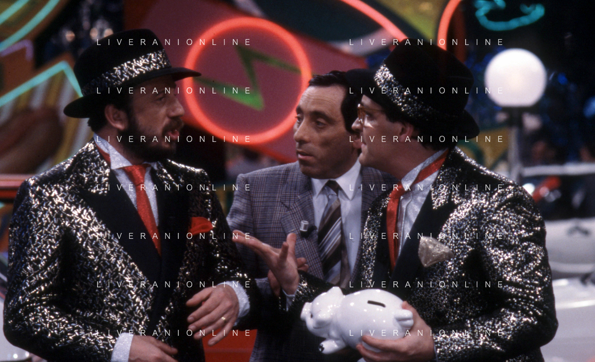 I TRETTRE' , TRIO COMICO NAPOLETANO, COMPOSTO DA GINO COGLIANDRO, EDOARDO ROMANO E MIRKO SETARO NELLA FOTO GINO COGLIANDRO NEL PROGRAMMA TV DI RAIMONDO VIANELLO E SANDRA MONDAINI AG ALDO LIVERANI SAS