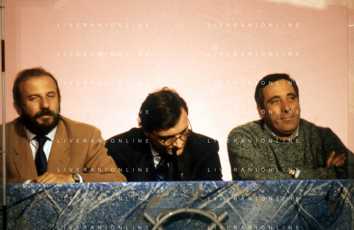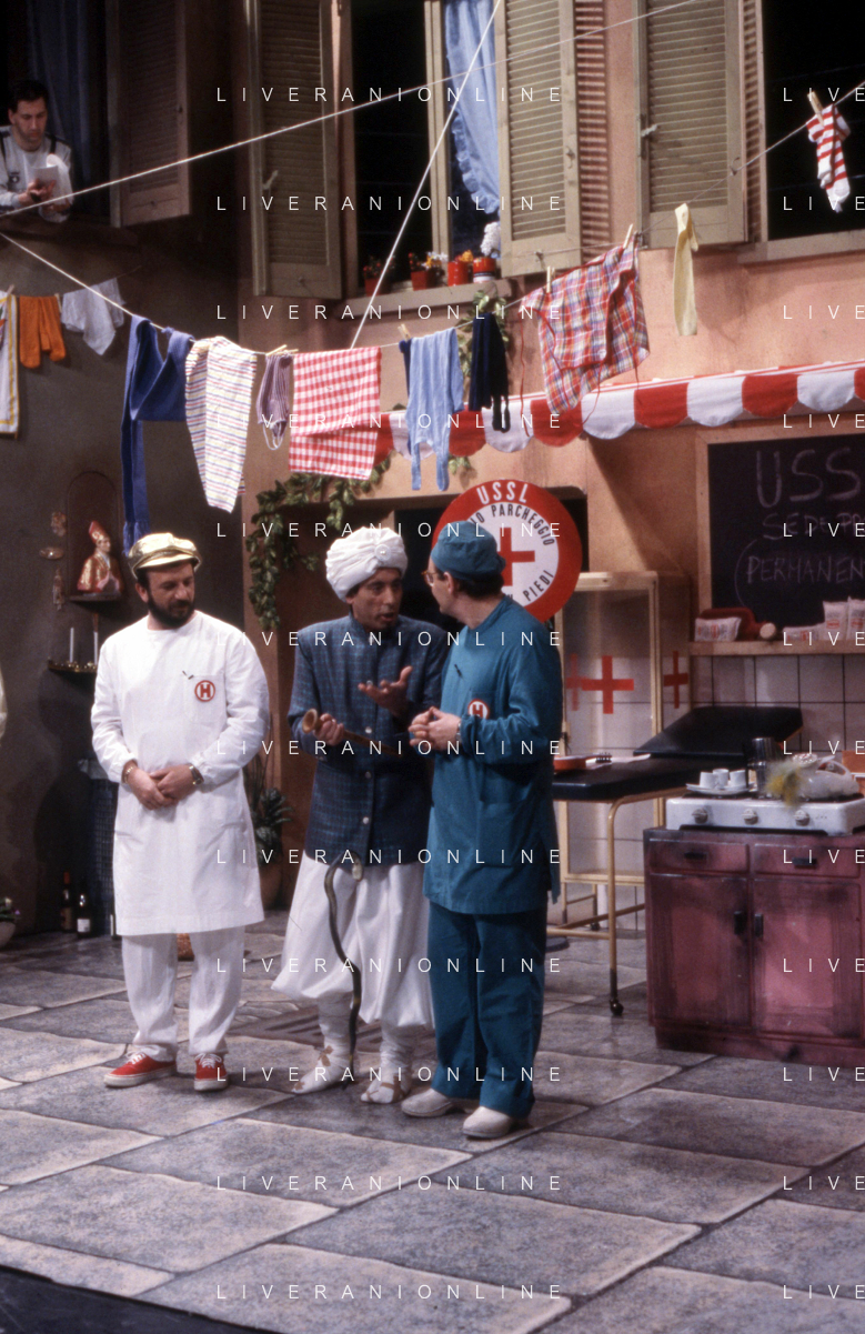 I TRETTRE' , TRIO COMICO NAPOLETANO, COMPOSTO DA GINO COGLIANDRO, EDOARDO ROMANO E MIRKO SETARO NELLA FOTO NEL PROGRAMMA TV 'TRISITORS' NEL 1989 AG ALDO LIVERANI SAS