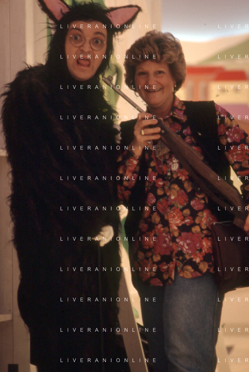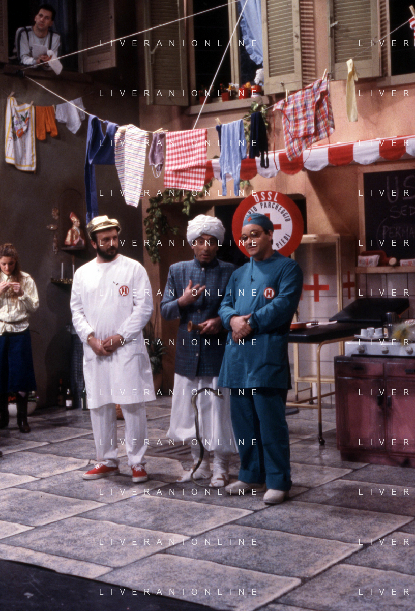 I TRETTRE' , TRIO COMICO NAPOLETANO, COMPOSTO DA GINO COGLIANDRO, EDOARDO ROMANO E MIRKO SETARO NELLA FOTO CON TINI' CANSINO NEL PROGRAMMA TV 'TRISITORS' NEL 1989 AG ALDO LIVERANI SAS