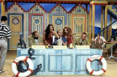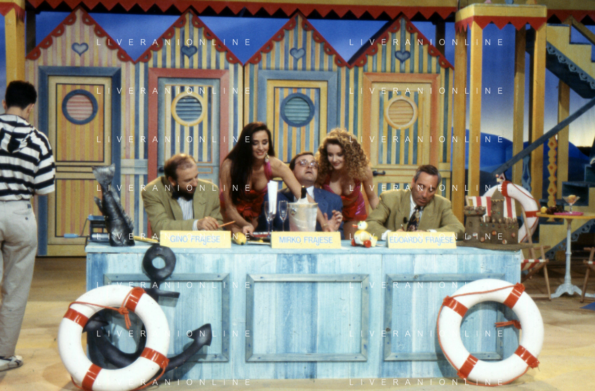 I Trettre' , trio comico napoletano, composto da Gino Cogliandro, Edoardo Romano e Mirko Setaro Nella foto alla conduzione del Tg delle vacanze nel 1991 con le sirenette Gabriela Labate e Angela Melillo AG ALDO LIVERANI SAS