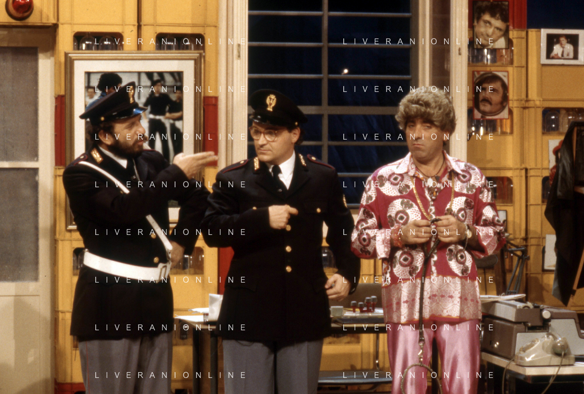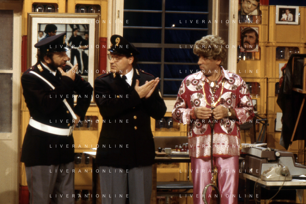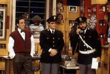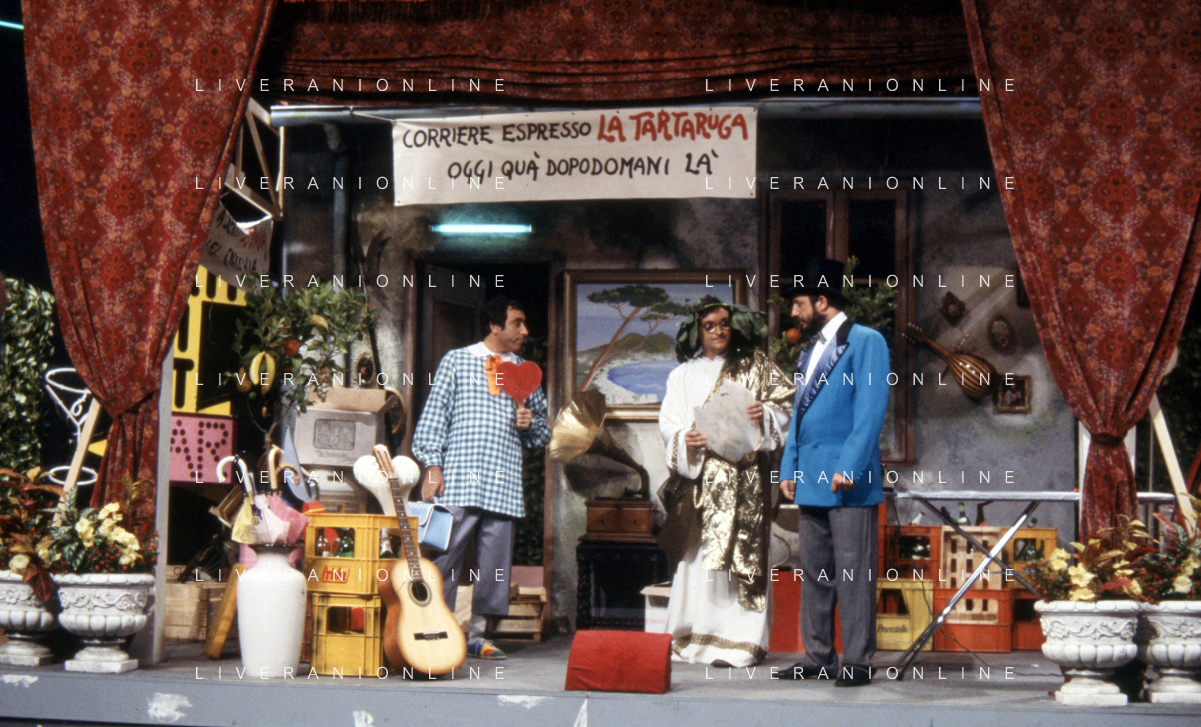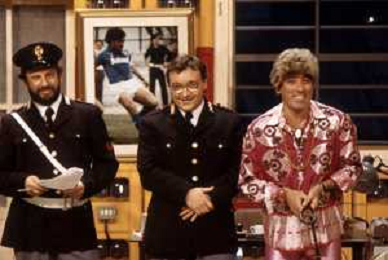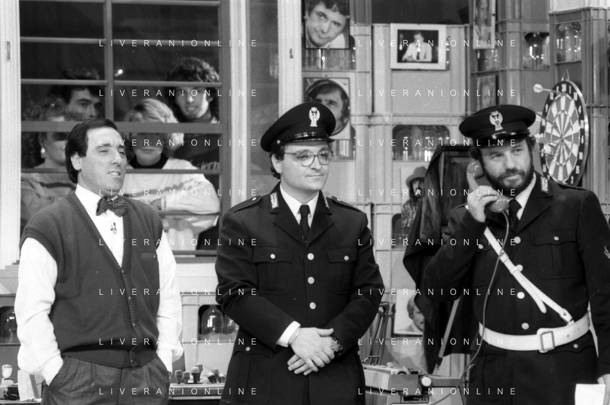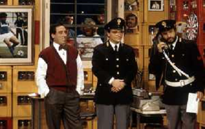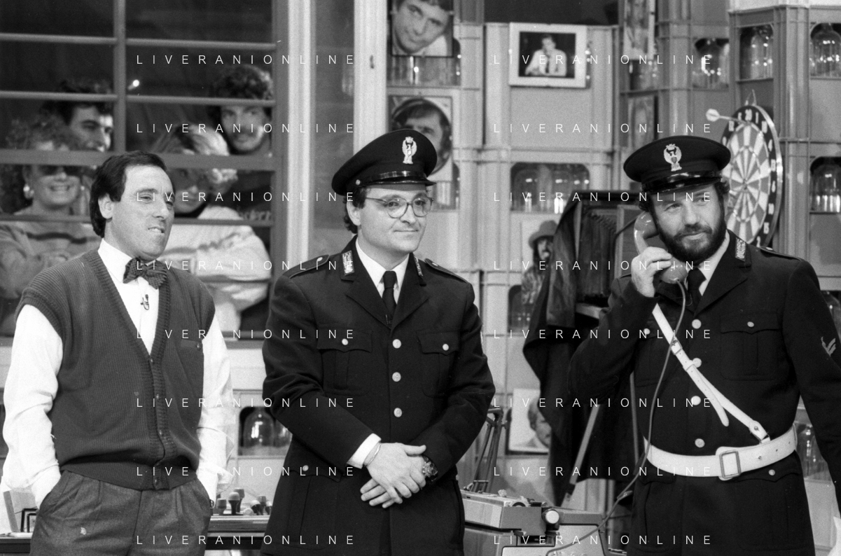 I TRETTRE' , TRIO COMICO NAPOLETANO, COMPOSTO DA GINO COGLIANDRO, EDOARDO ROMANO E MIRKO SETARO NELLA FOTO NEL VARIETA' TELEVISIVO 'TRISITORS' NEL 1989 CON TINI' CANSINO E LUIGI UZZO AG ALDO LIVERANI SAS