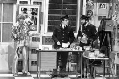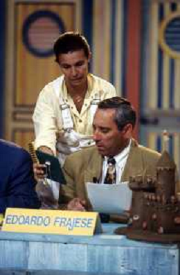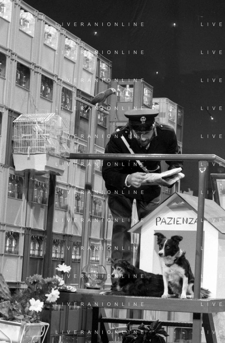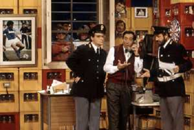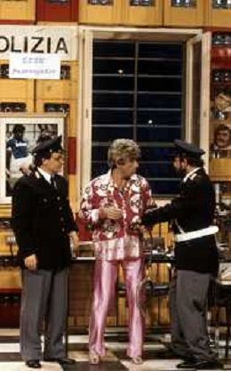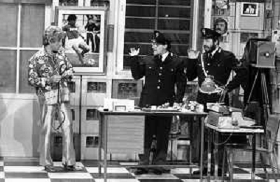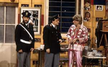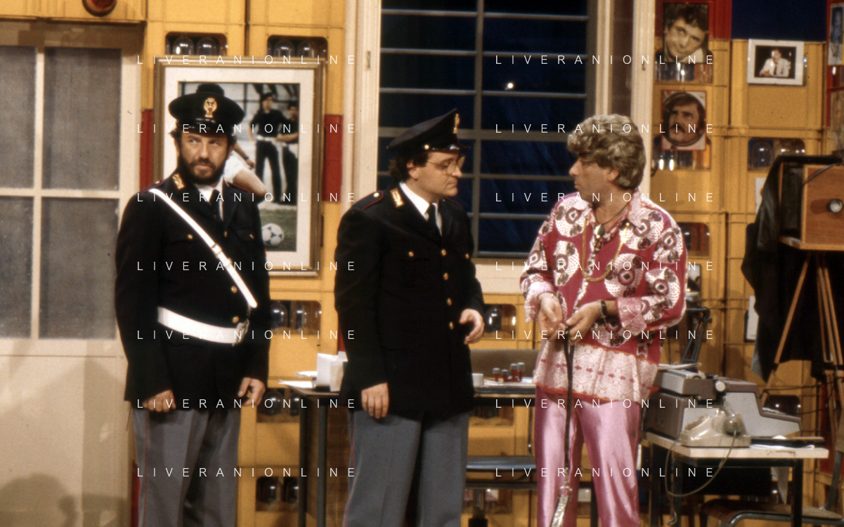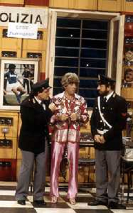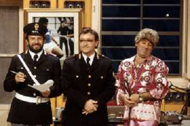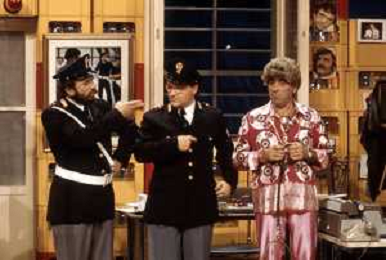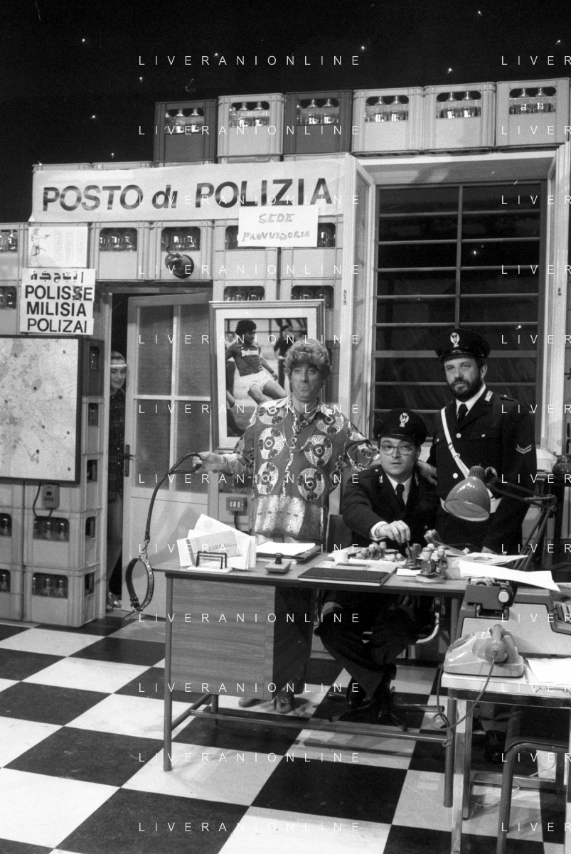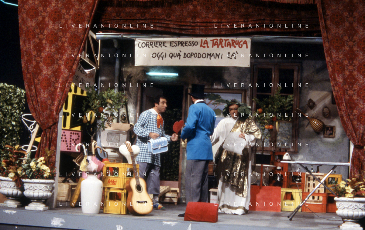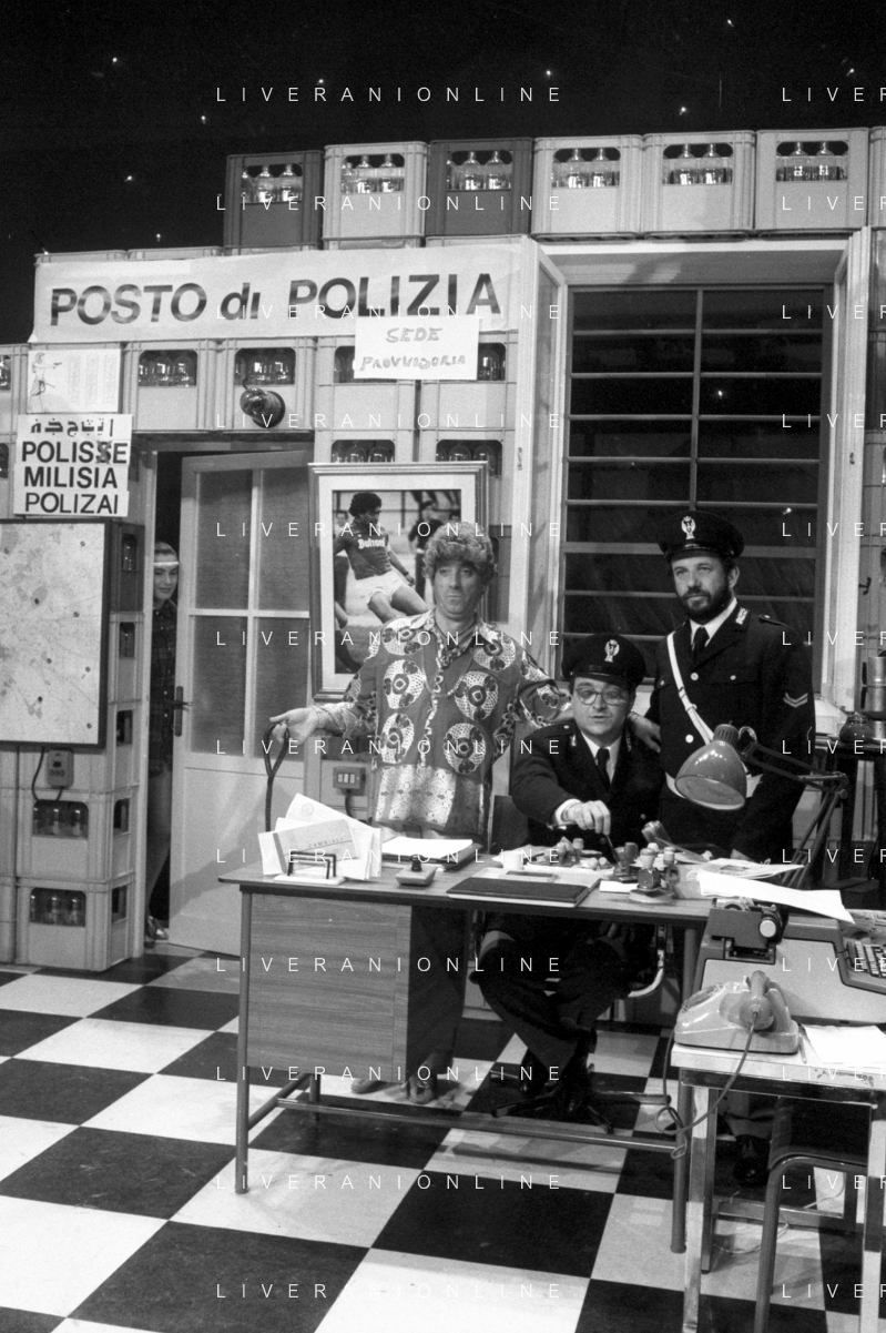 I TRETTRE' , TRIO COMICO NAPOLETANO, COMPOSTO DA GINO COGLIANDRO, EDOARDO ROMANO E MIRKO SETARO NELLA FOTO NEL VARIETA' TELEVISIVO 'TRISITORS' NEL 1989 CON TINI' CANSINO E LUIGI UZZO AG ALDO LIVERANI SAS