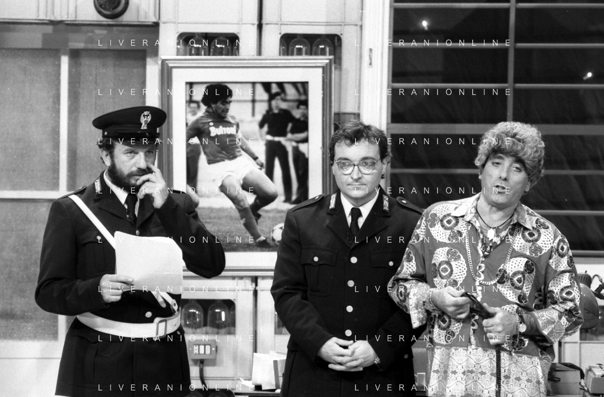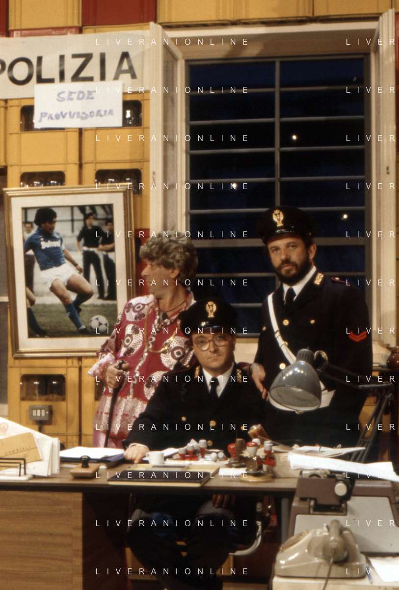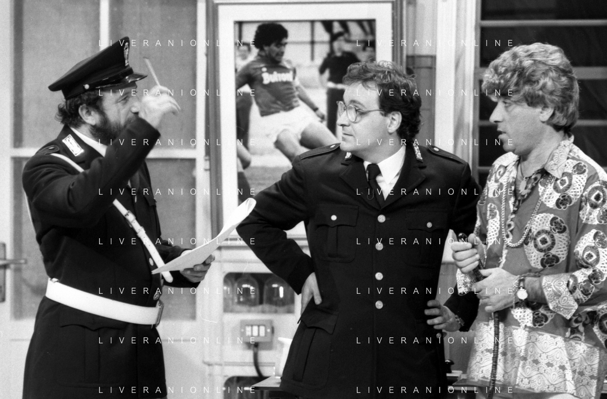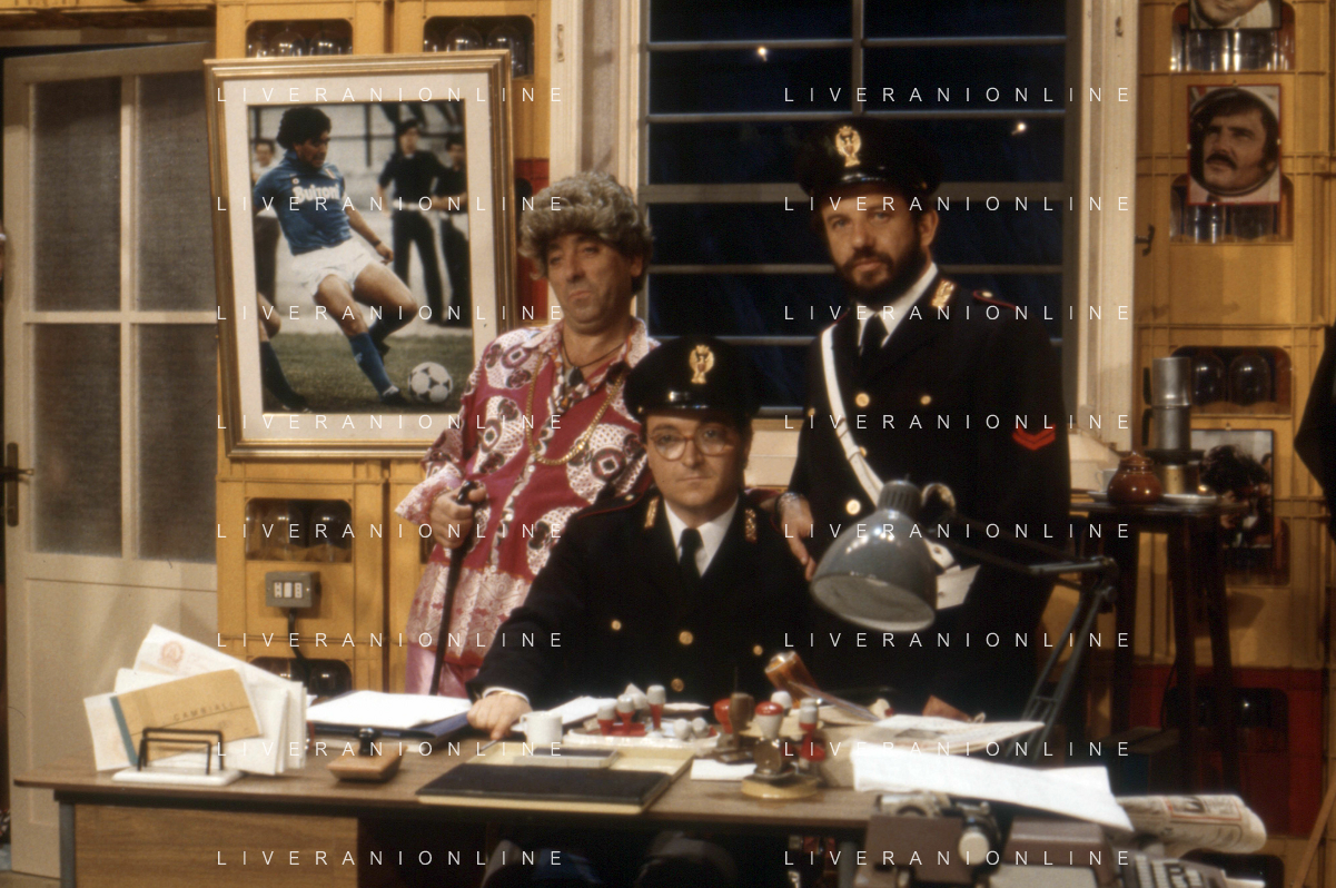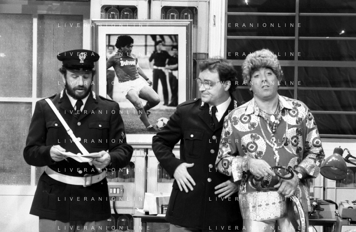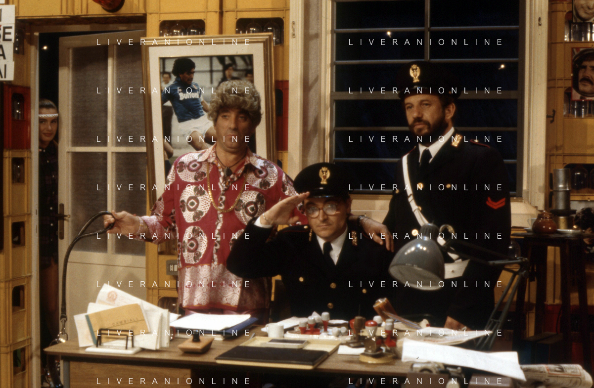 I TRETTRE' , TRIO COMICO NAPOLETANO, COMPOSTO DA GINO COGLIANDRO, EDOARDO ROMANO E MIRKO SETARO NELLA FOTO GINO COGLIANDRO E EDOARDO ROMANO NEL 1986 AG ALDO LIVERANI SAS