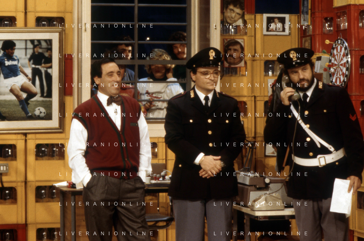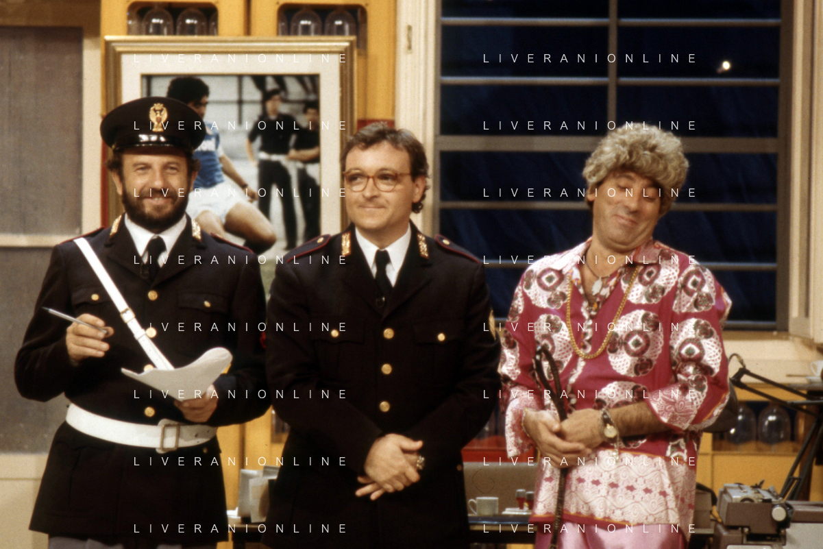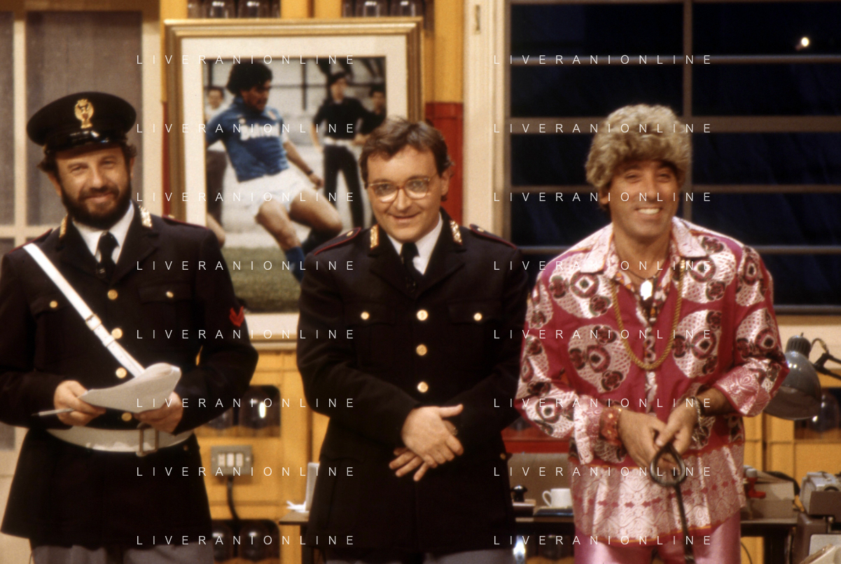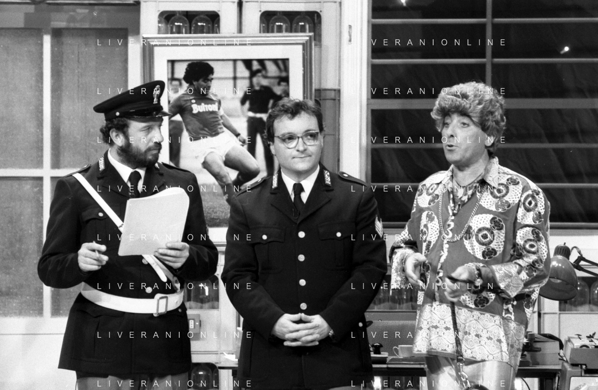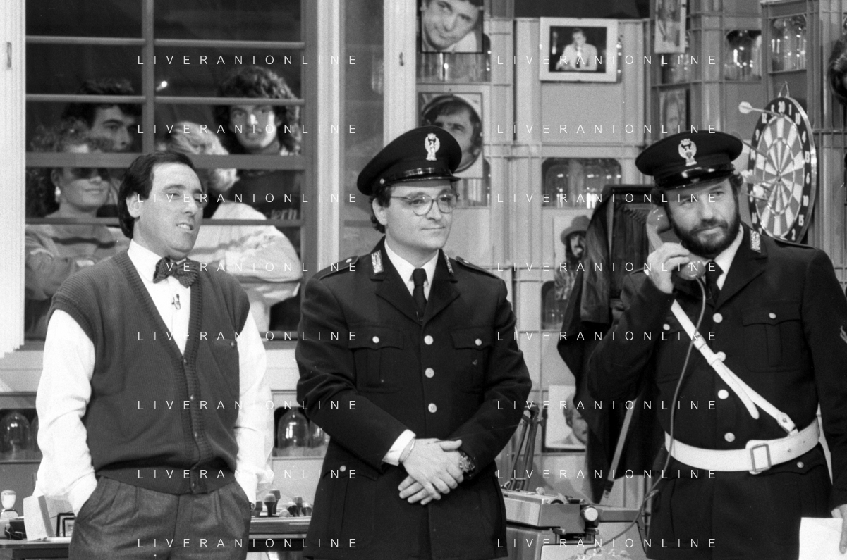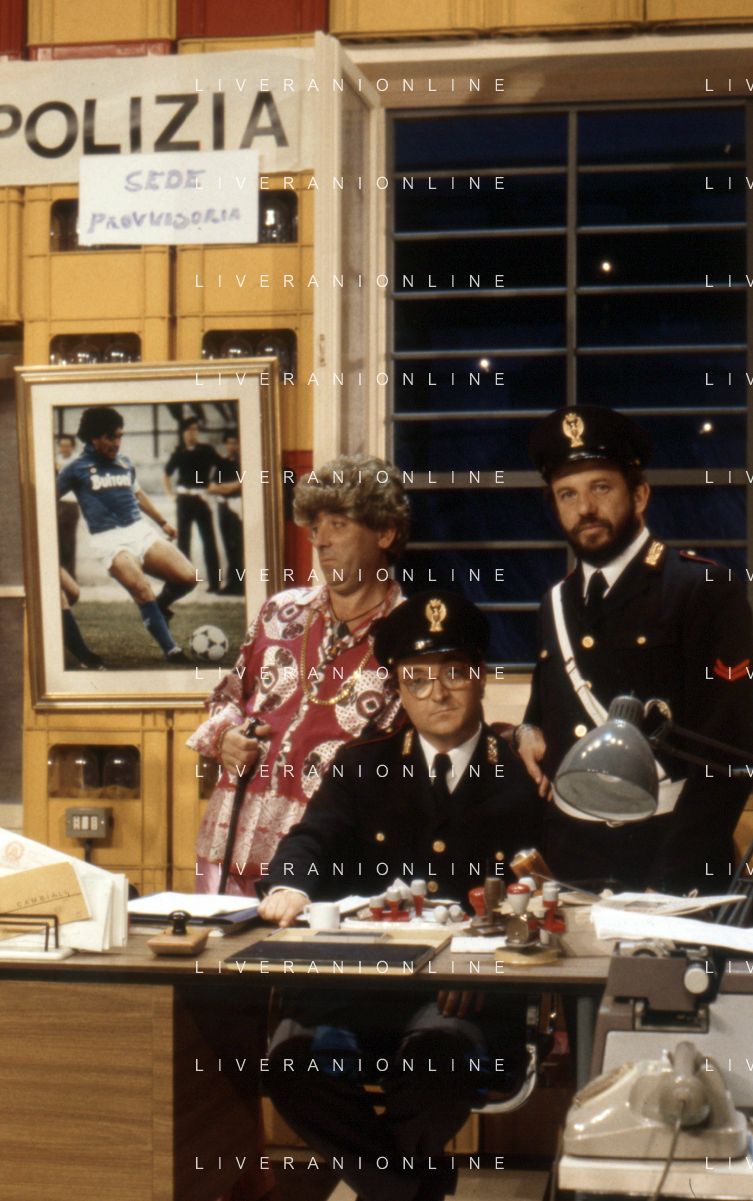 I TRETTRE' , TRIO COMICO NAPOLETANO, COMPOSTO DA GINO COGLIANDRO, EDOARDO ROMANO E MIRKO SETARO NELLA FOTO GINO COGLIANDRO E EDOARDO ROMANO NEL 1986 AG ALDO LIVERANI SAS