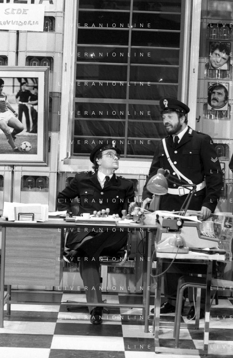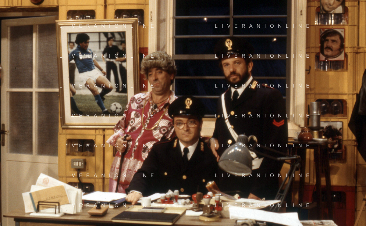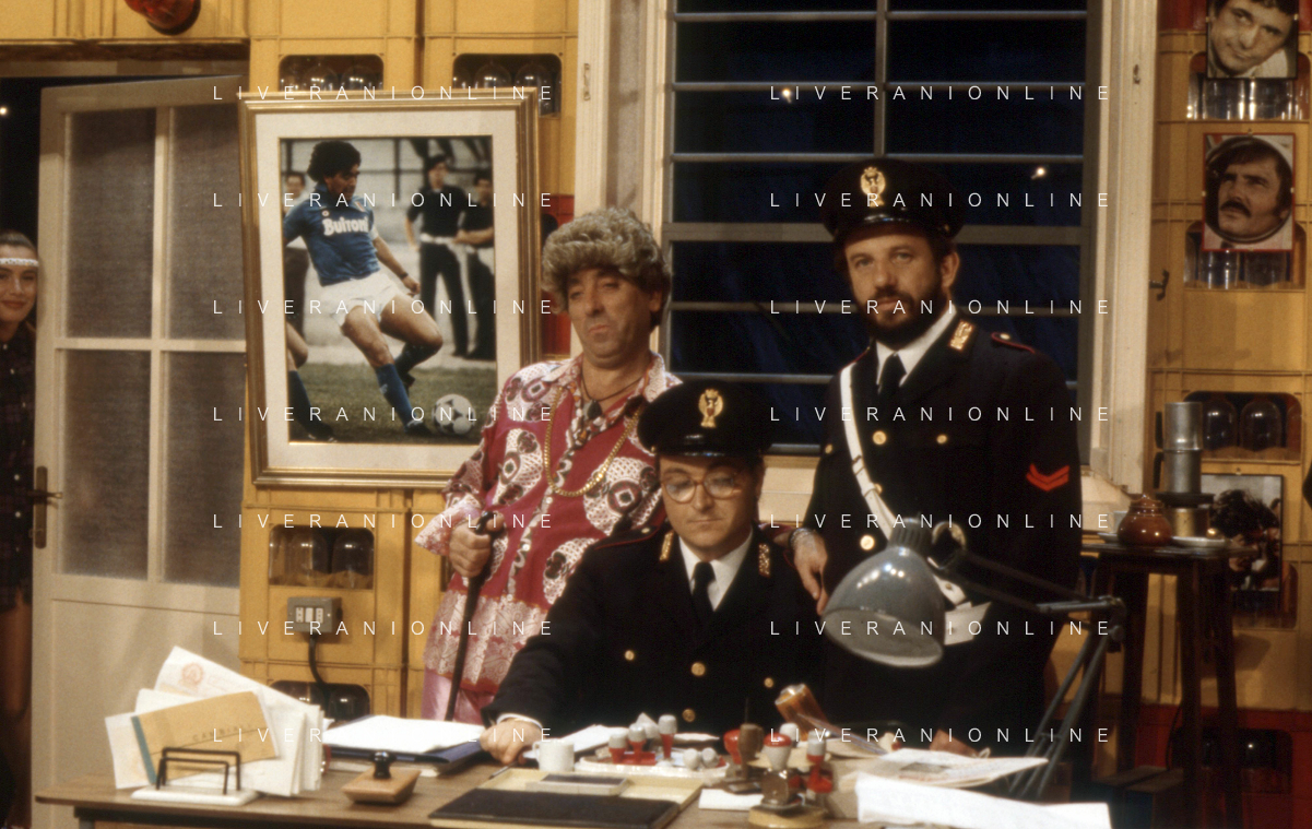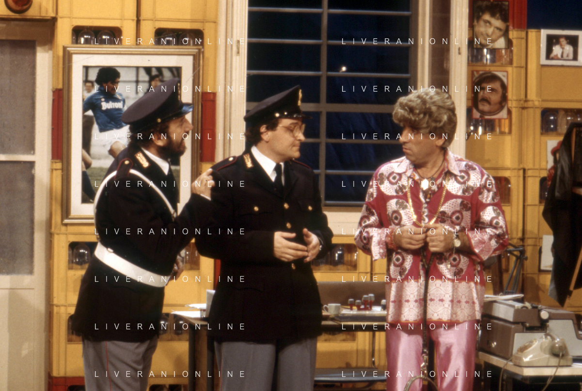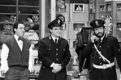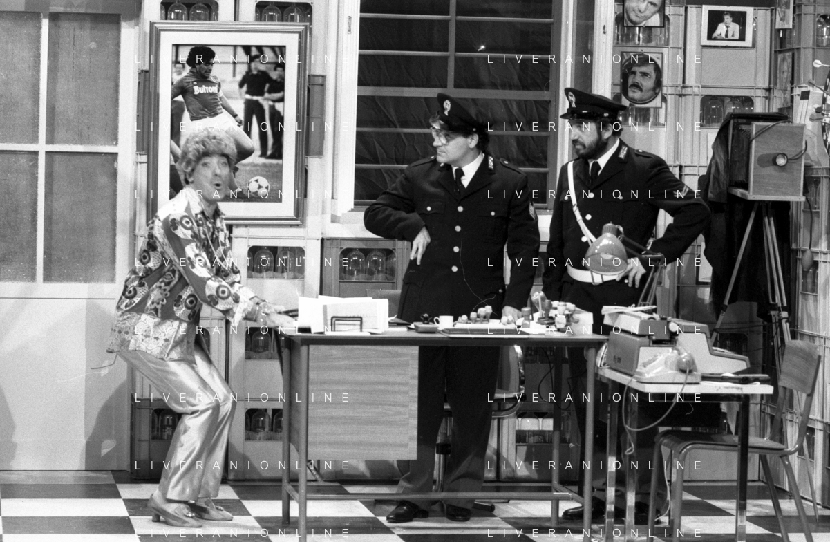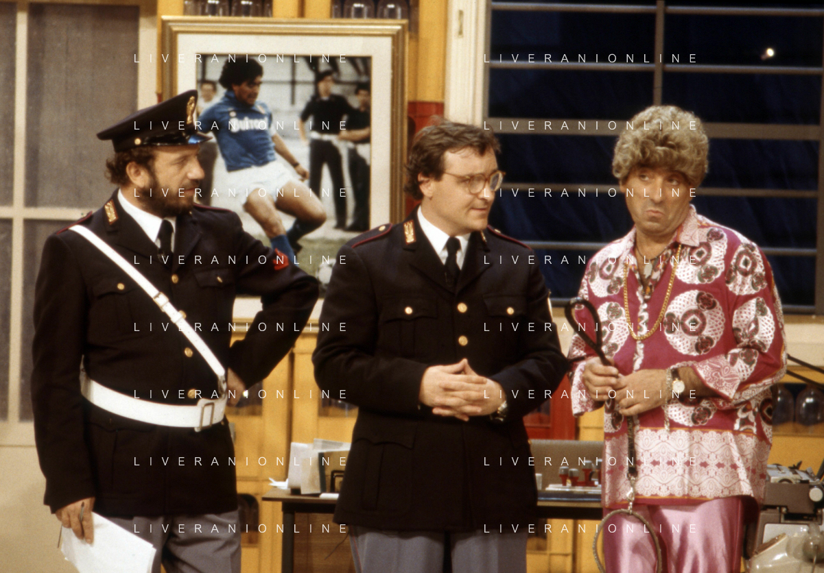 I TRETTRE' , TRIO COMICO NAPOLETANO, COMPOSTO DA GINO COGLIANDRO, EDOARDO ROMANO E MIRKO SETARO NELLA FOTO GINO COGLIANDRO E EDOARDO ROMANO NEL 1986 AG ALDO LIVERANI SAS