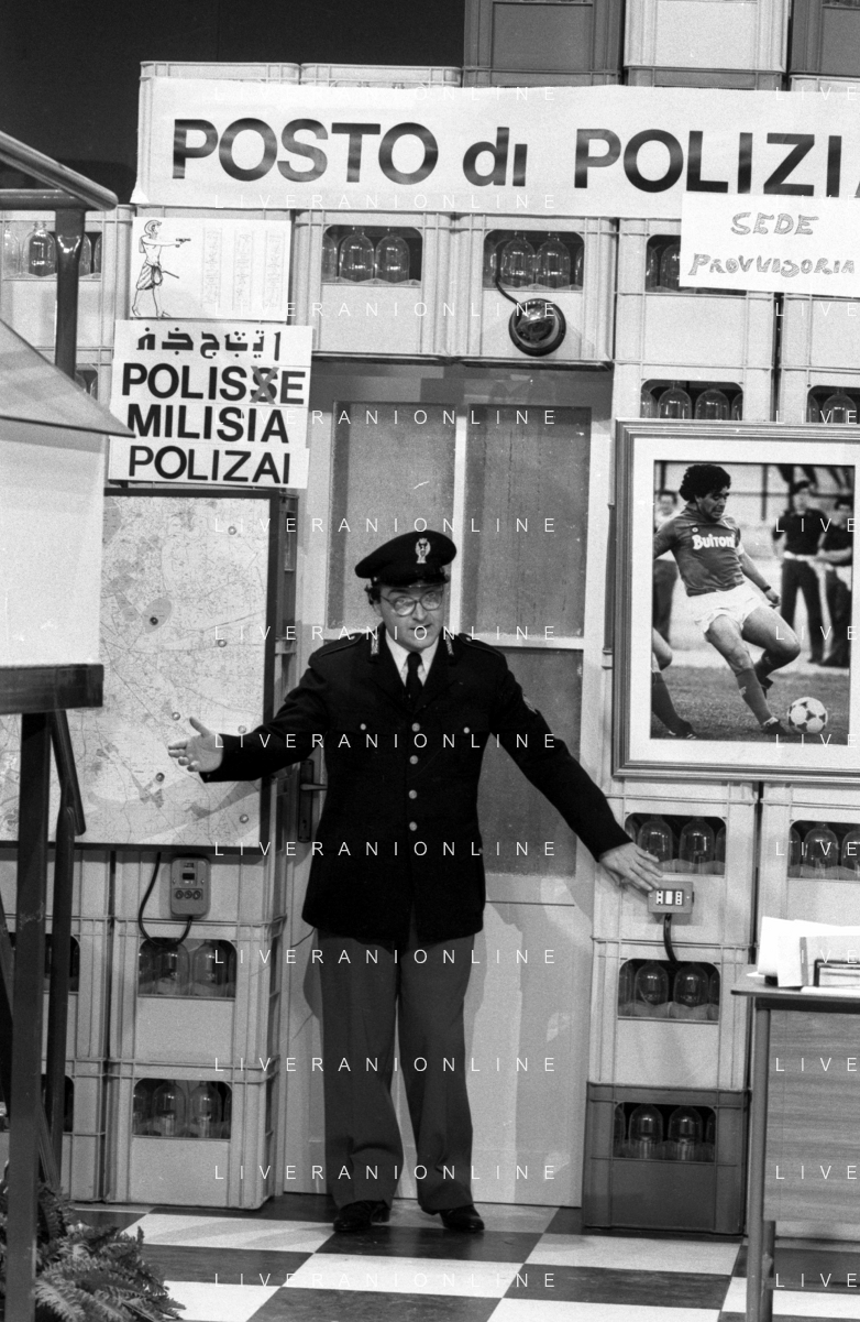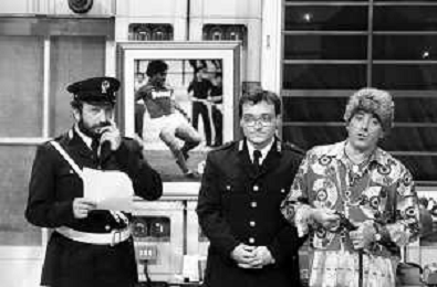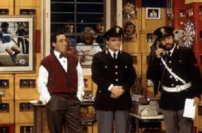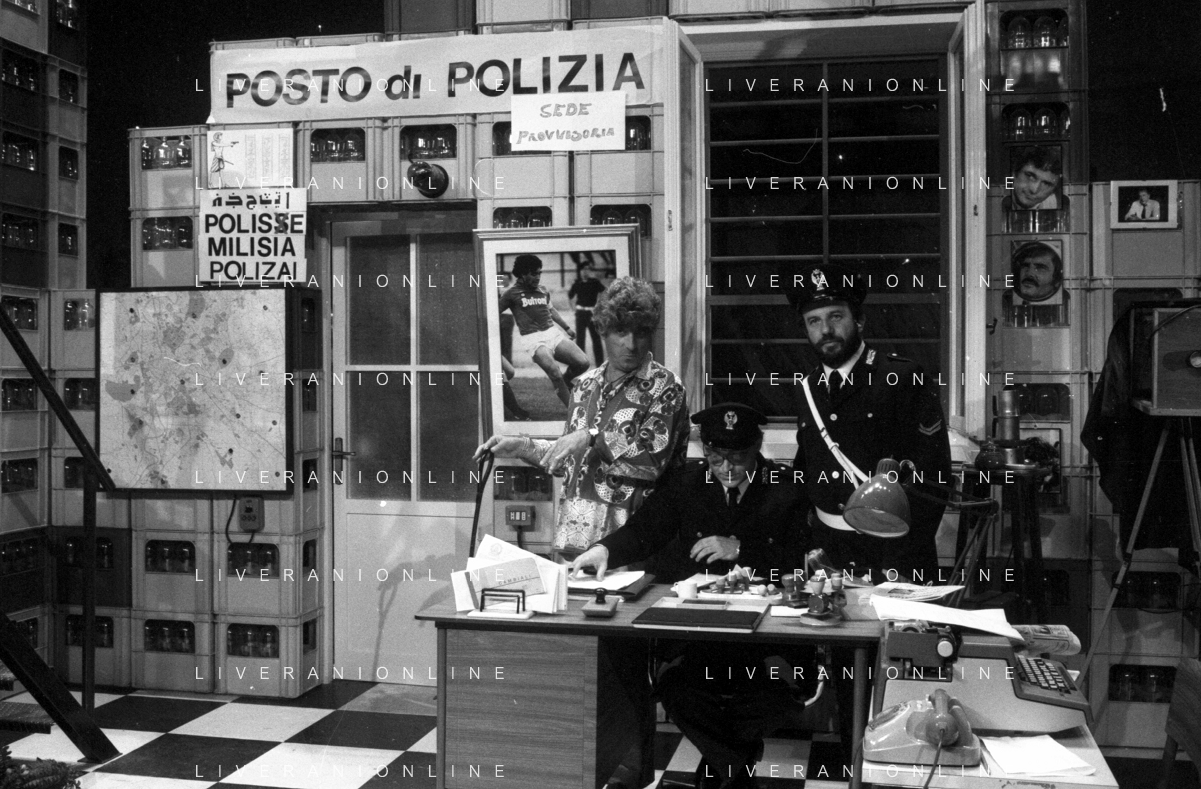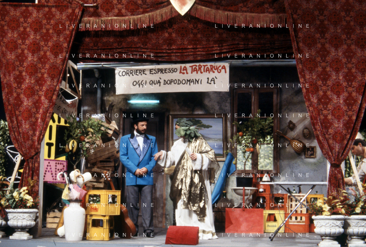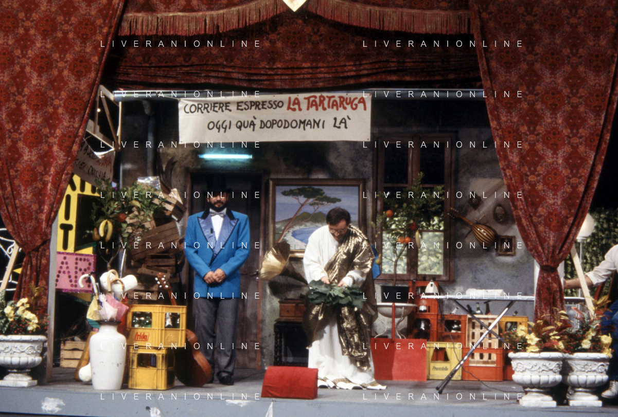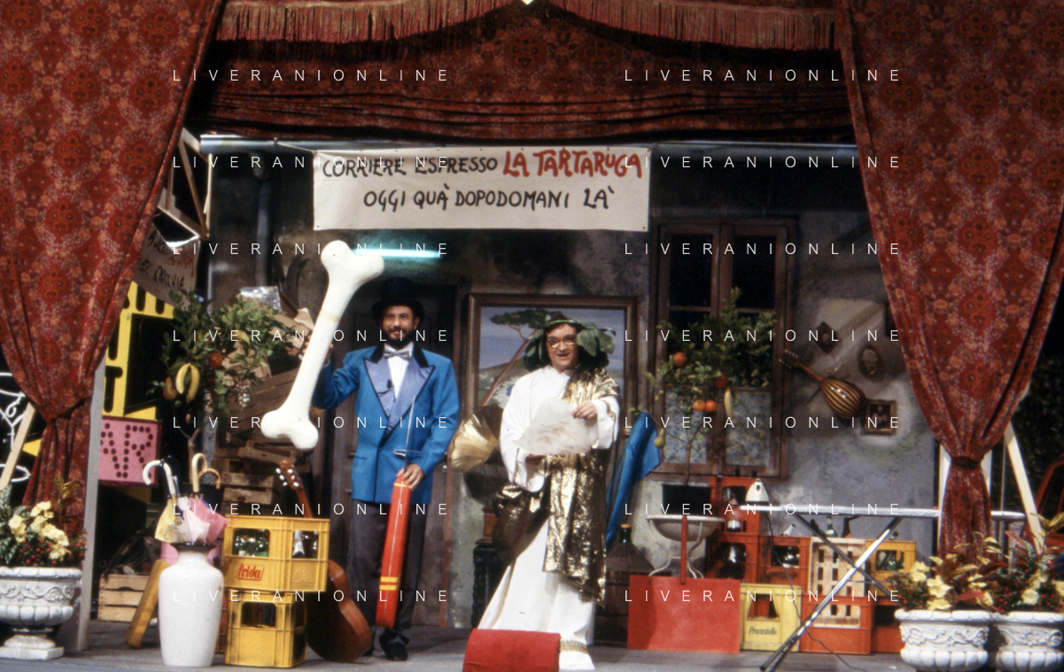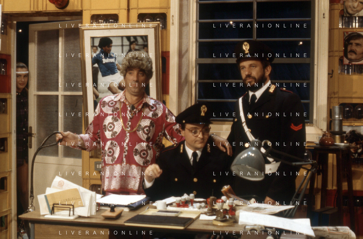 I TRETTRE' , TRIO COMICO NAPOLETANO, COMPOSTO DA GINO COGLIANDRO, EDOARDO ROMANO E MIRKO SETARO NELLA FOTO GINO COGLIANDRO E EDOARDO ROMANO NEL 1986 AG ALDO LIVERANI SAS