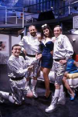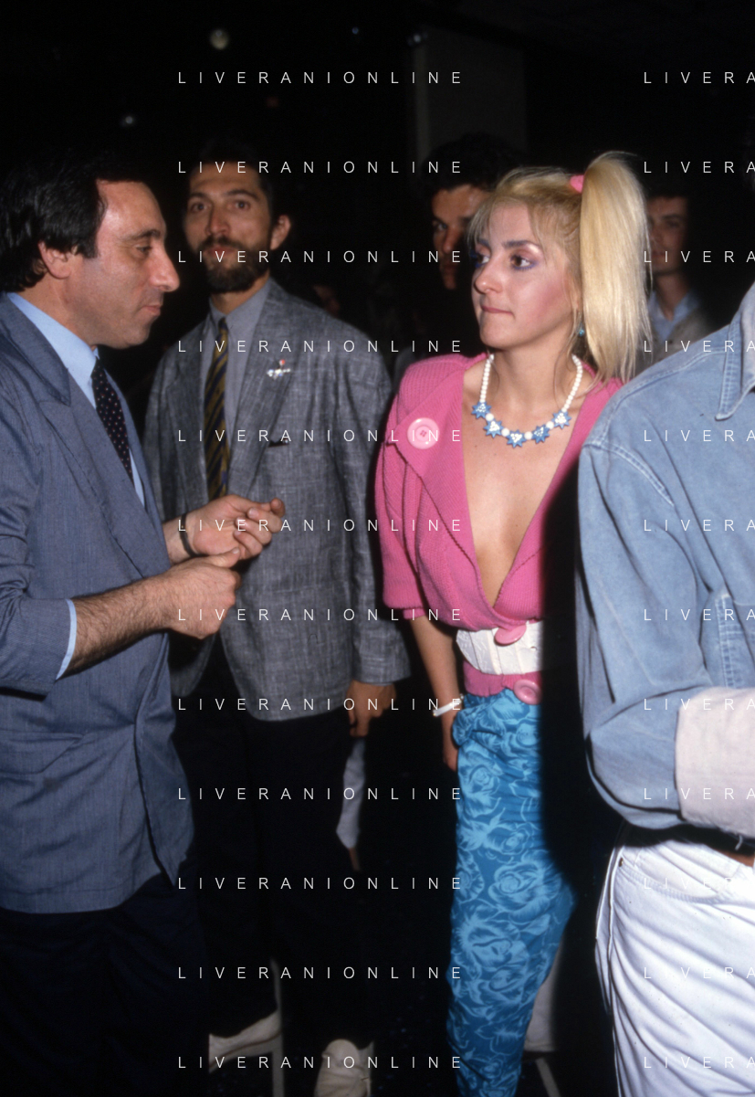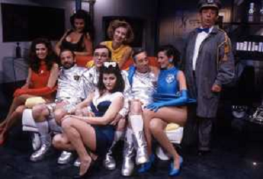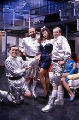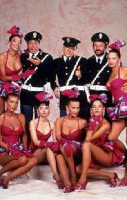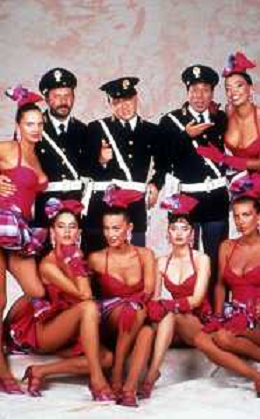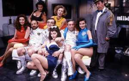I TRETTRE' , TRIO COMICO NAPOLETANO, COMPOSTO DA GINO COGLIANDRO, EDOARDO ROMANO E MIRKO SETARO NELLA FOTO CON LE RAGAZZE FAST FOOD CAST DI 'DRIVE IN' DEL 1987 AG ALDO LIVERANI SAS
