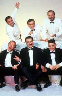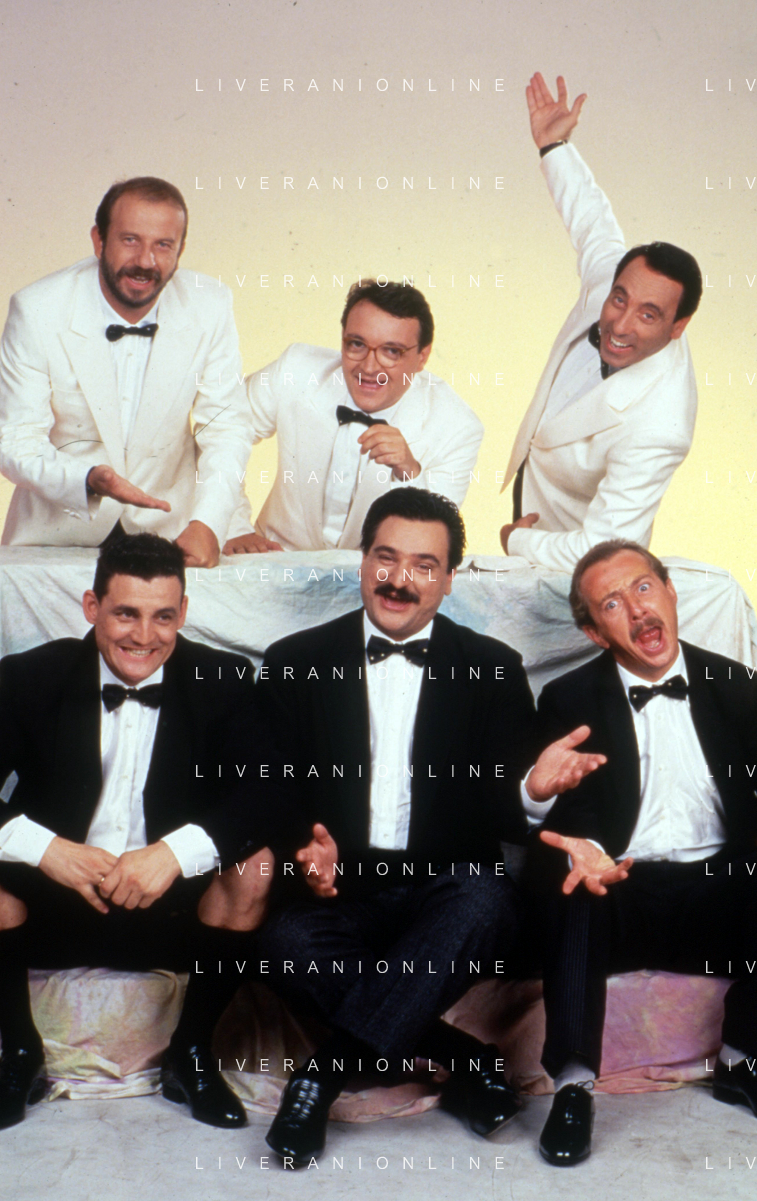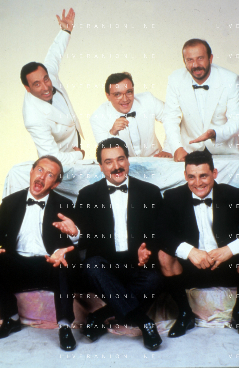 I TRETTRE' , TRIO COMICO NAPOLETANO, COMPOSTO DA GINO COGLIANDRO, EDOARDO ROMANO E MIRKO SETARO NELLA FOTO CON FRANCESCO SALVI, SERGIO VASTANO E ENZO BRASCHI, CAST DI 'DRIVE IN' DEL 1987 AG ALDO LIVERANI SAS