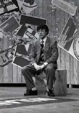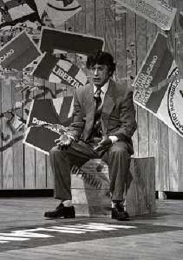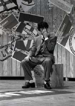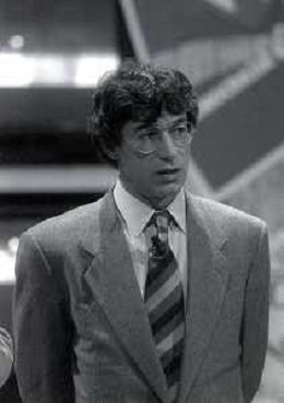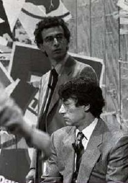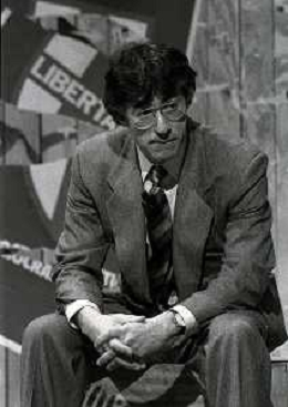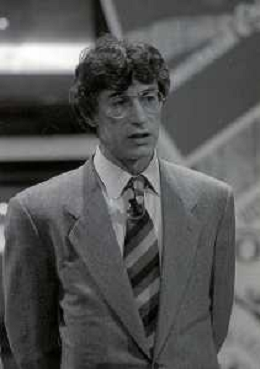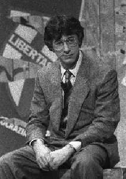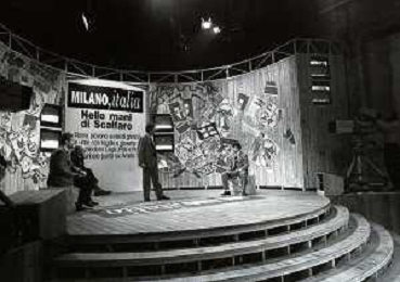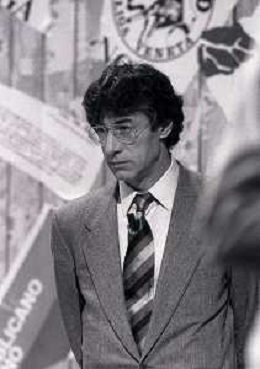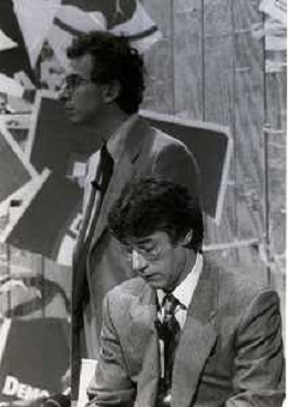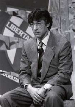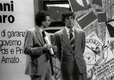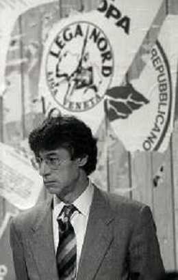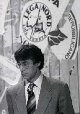 RETROSPETTIVA UMBERTO BOSSI POLITICO LEGA NORD NELLA FOTO TRASMISSIONE TELEVISIVA “MILANO ITALIA“ CONDOTTA DA GAD LERNER ANNO 1992-1993 AG ALDO LIVERANI SAS