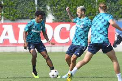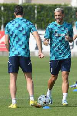 TVMV-Torino 05.09.2022 Continassa © Manuela Viganti/Agenzia Aldo Liverani Allenamento rifinitura Champions League 2022/2023 Paris Saint German vs Juventus Nella foto: juan cuadrado e leandro paredes
