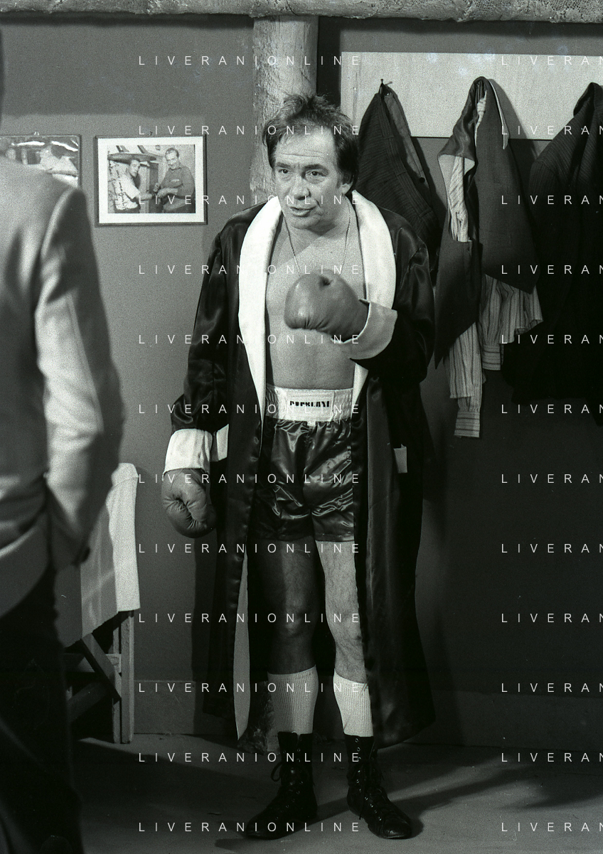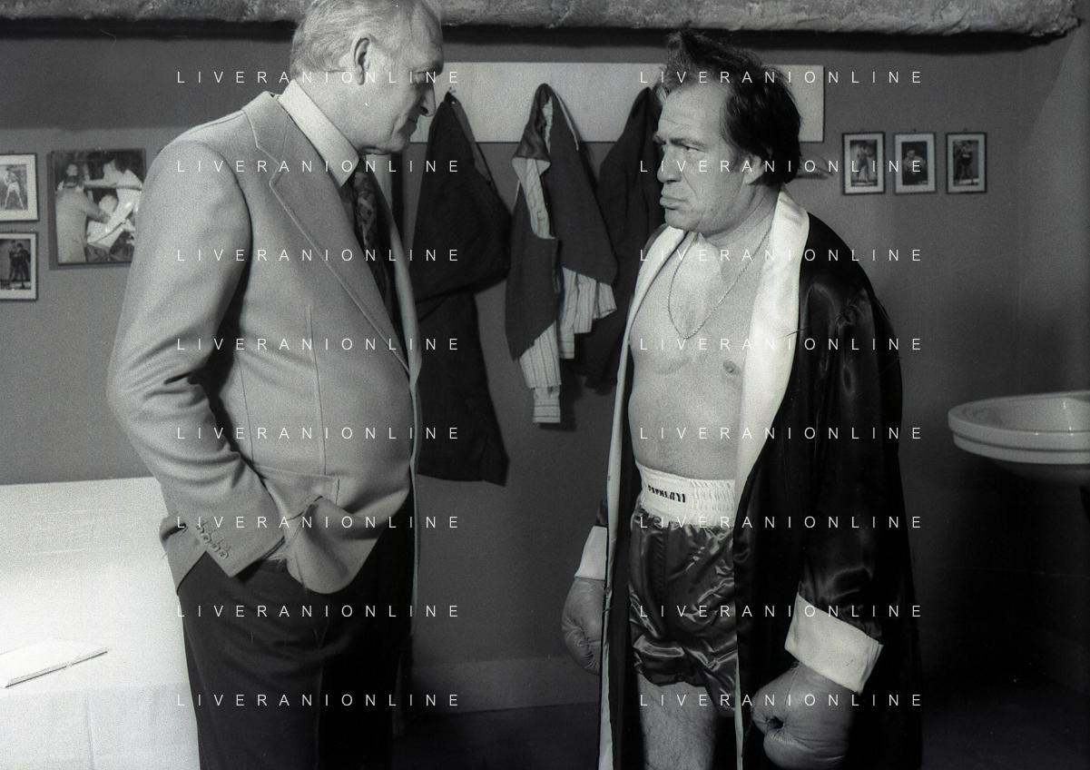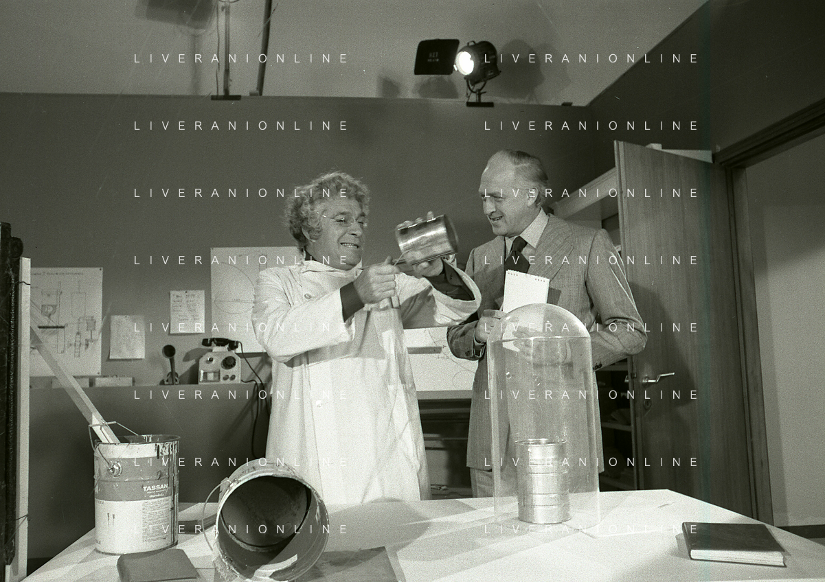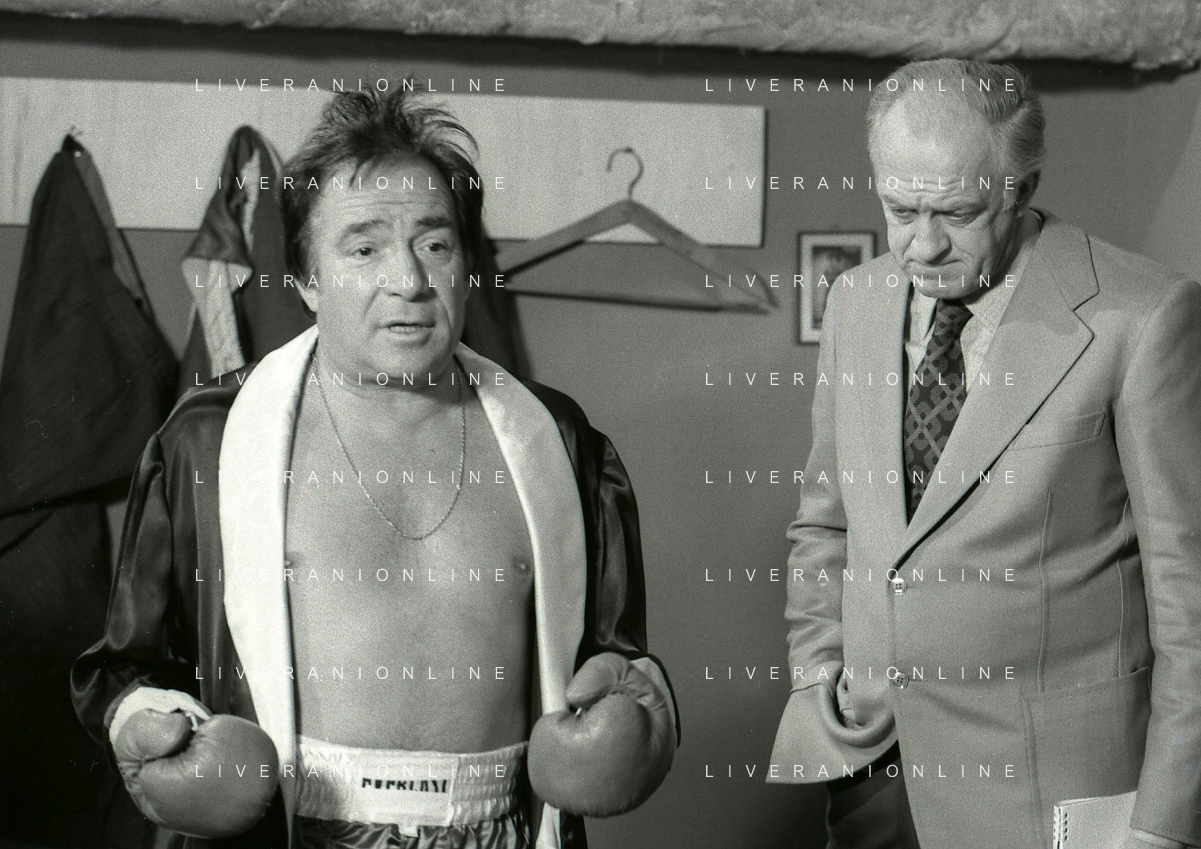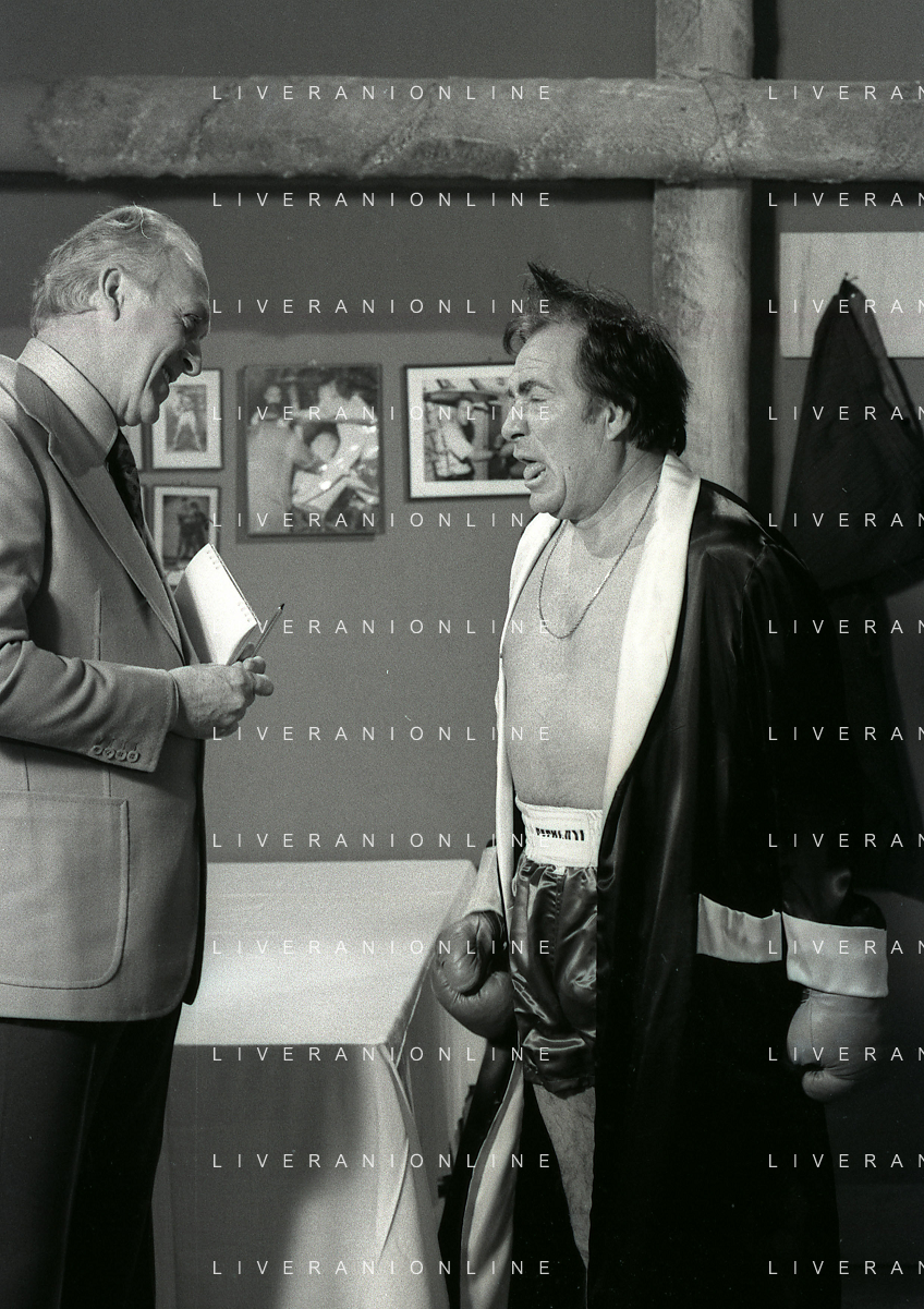 RETROSPETTIVA UGO TOGNAZZI ATTORE NELLA FOTO UGO TOGNAZZI SET DEL “CAROSELLO PUBBLICITA STOCK“ NELL'ANNO 1973 CON RAIMONDO VIANELLO AG ALDO LIVERANI SAS