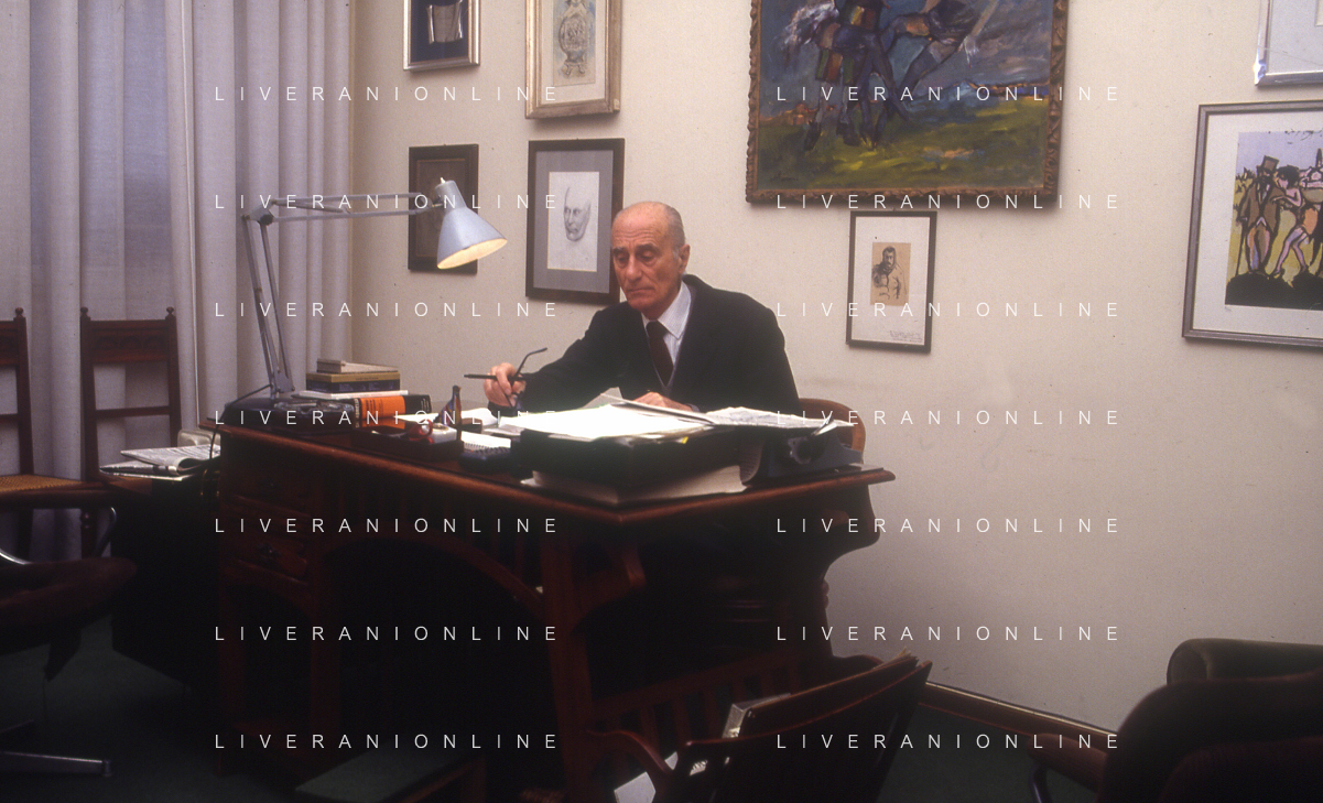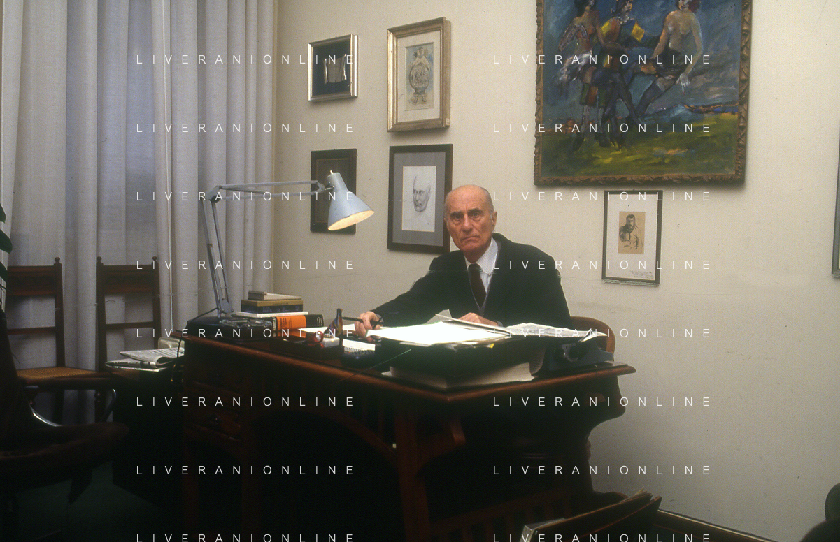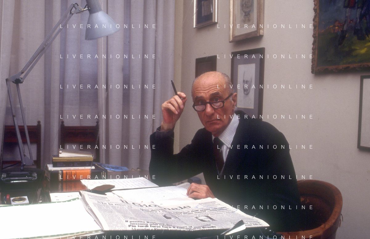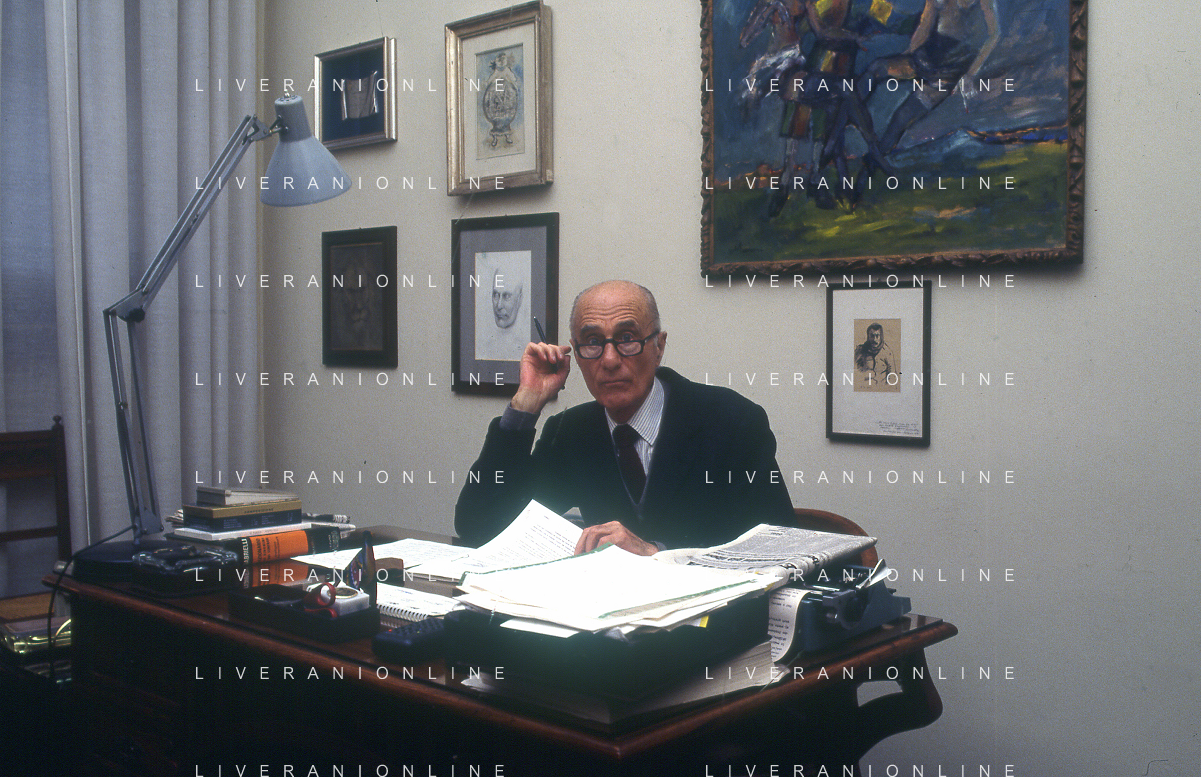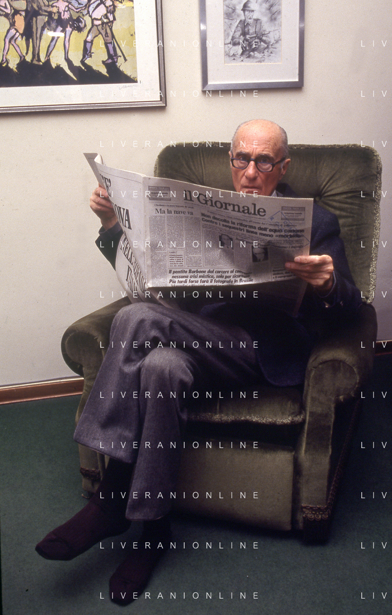 RETROSPETTIVA INDRO MONTANELLI GIORNALISTA E SCRITTORE NELLA FOTO INDRO MONTANELLI NEL SUO UFFICIO NELLA REDAIONE DEL GIORNALE NUOVO NELL'ANNO 1983 AG ALDO LIVERANI SAS