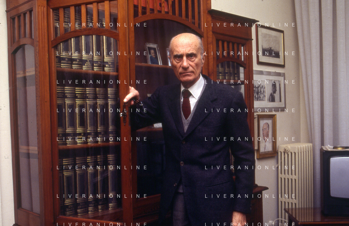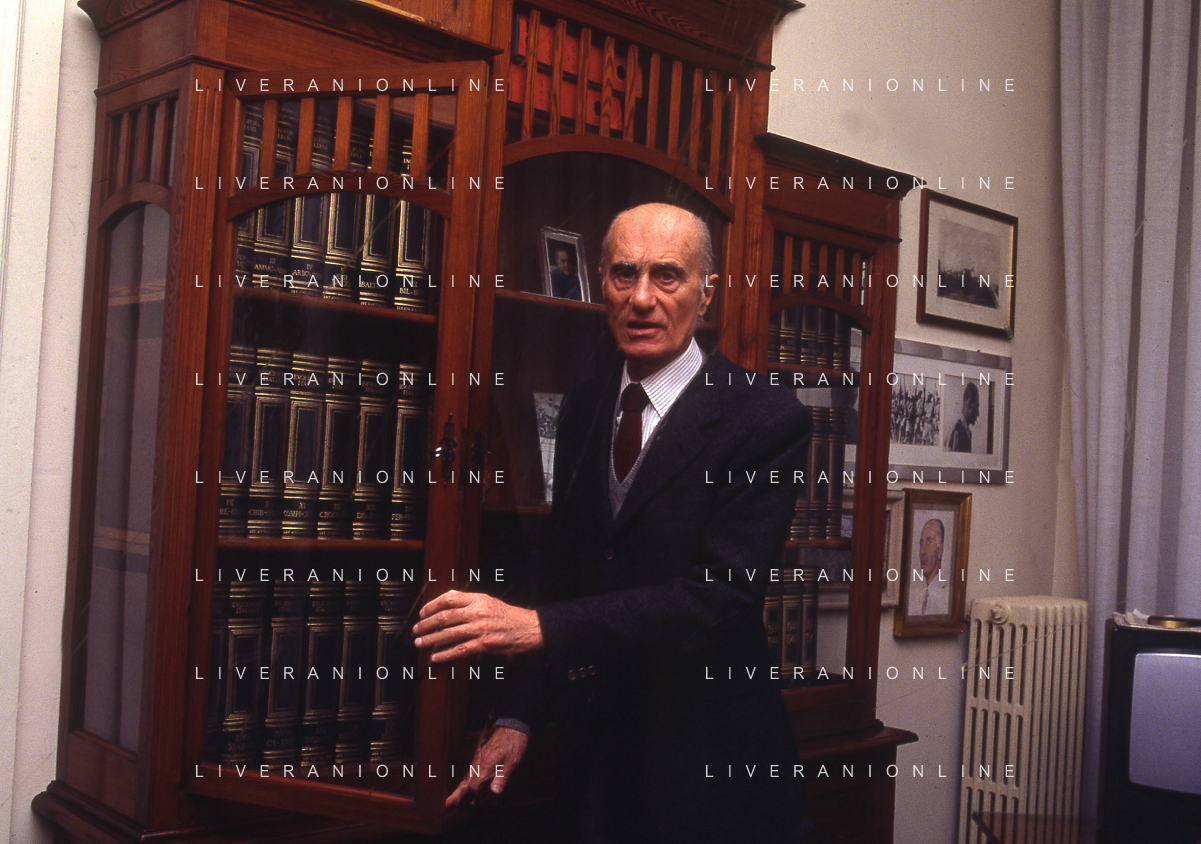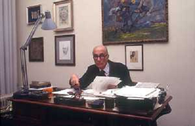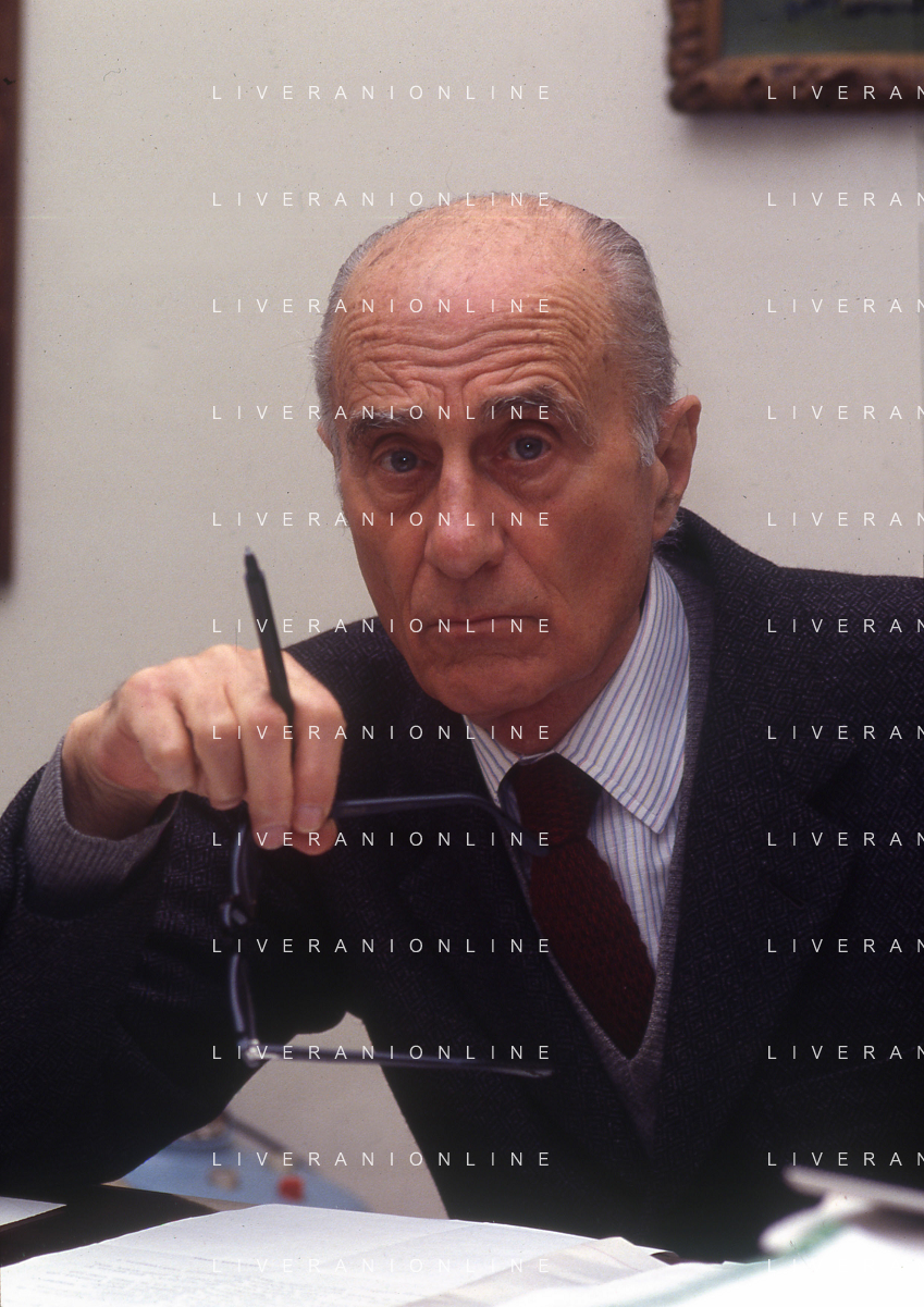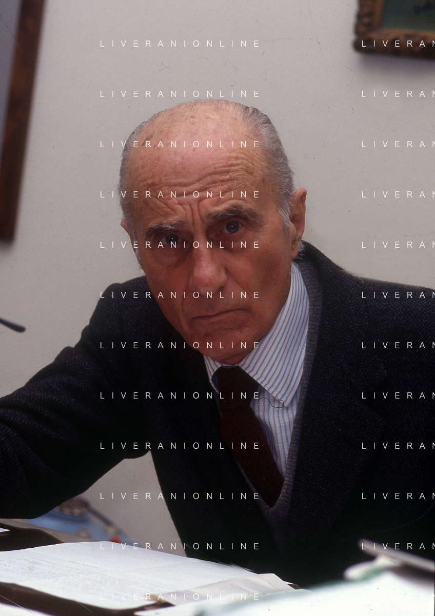 RETROSPETTIVA INDRO MONTANELLI GIORNALISTA E SCRITTORE NELLA FOTO INDRO MONTANELLI NEL SUO UFFICIO NELLA REDAIONE DEL GIORNALE NUOVO NELL'ANNO 1983 AG ALDO LIVERANI SAS
