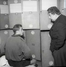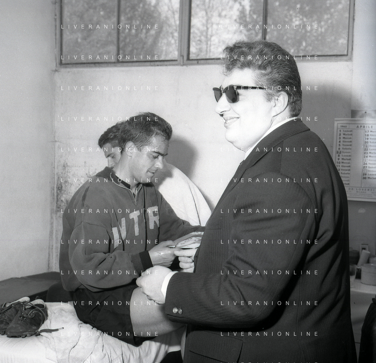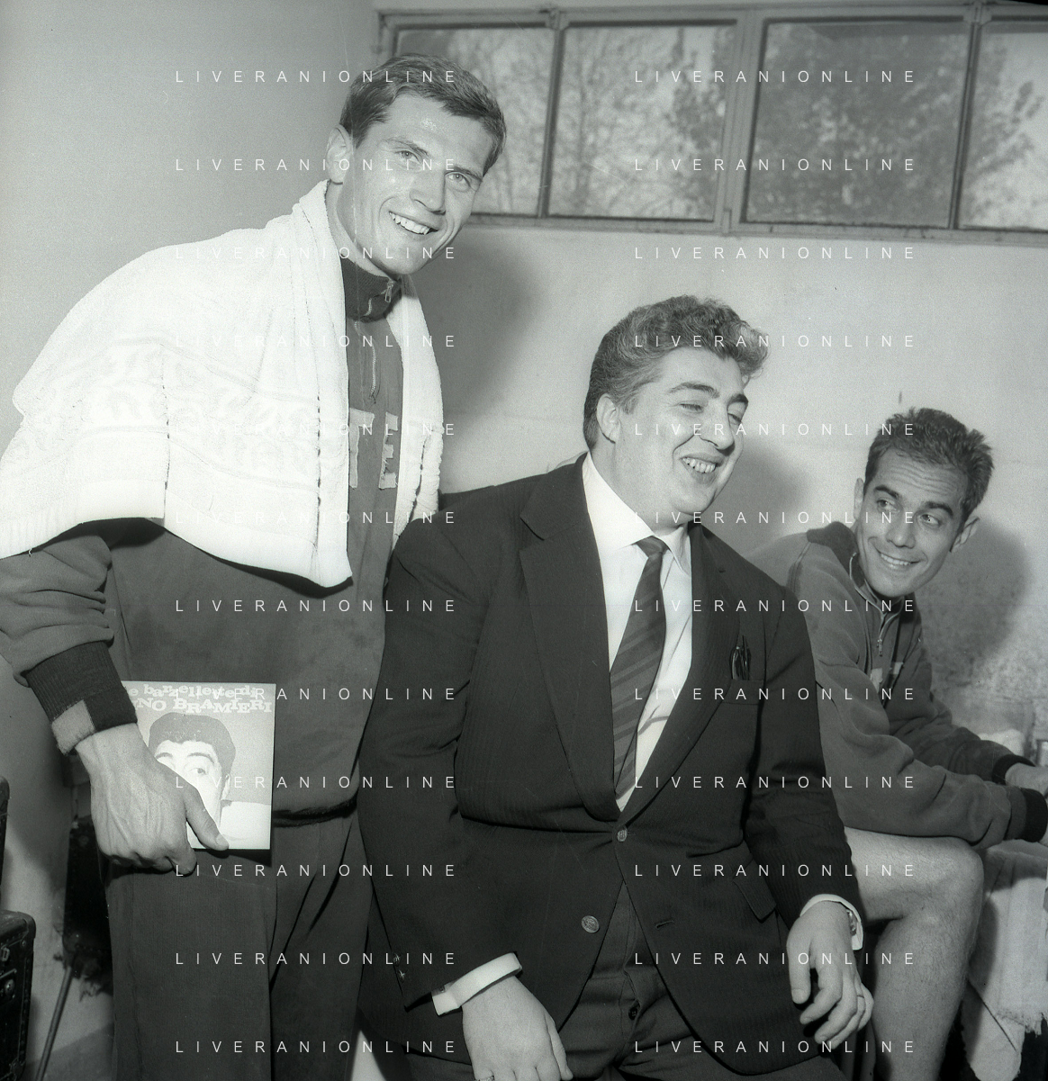 RETROSPETTIVA GINO BRAMIERI ATTORE COMICO CANTANTE NELLA FOTO GINO BRAMIERI CON LUIS SUAREZ E GIACINTO FACCHETTI IL GIORNO 24-04-1963 AG ALDO LIVERANI SAS