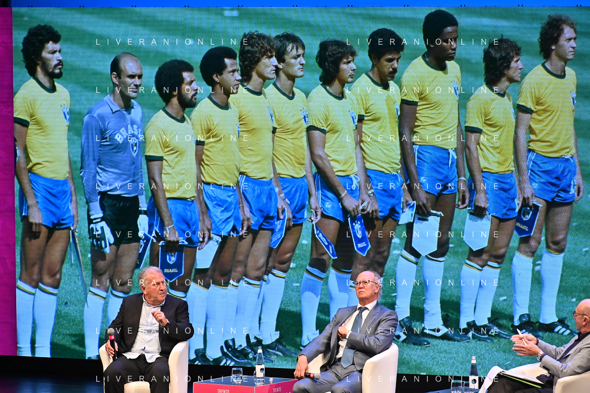 Festival dello Sport nella foto Arthur Antunes Coimbra Zico SX e Paulo Roberto Falcao DX sullo sfondo la squadra del Brasile che affronto' l'Italia al Mondiale del 1982 in Spagna Trento 24-09-2022 Auditorium Santa Chiara Falcao e Zico il Brasile dei fenomeni, con Paulo Roberto Falcao e Arthur Antunes Coimbra Zico foto Roberto Garavaglia/ag. Aldo Liverani sas/AGENZIA ALDO LIVERANI SAS