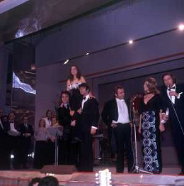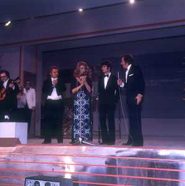 RETROSPETTIVA NICOLA DI BARI CANTANTE NELLA FOTO NICOLA DI BARI AL FESTIVAL DI SANREMO NELL'ANNO 1972 CON MIKE BONGIORNO, SYLVA KOSCINA E PAOLO VILLAGGIO AG ALDO LIVERANI SAS