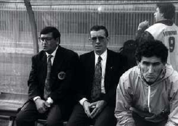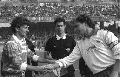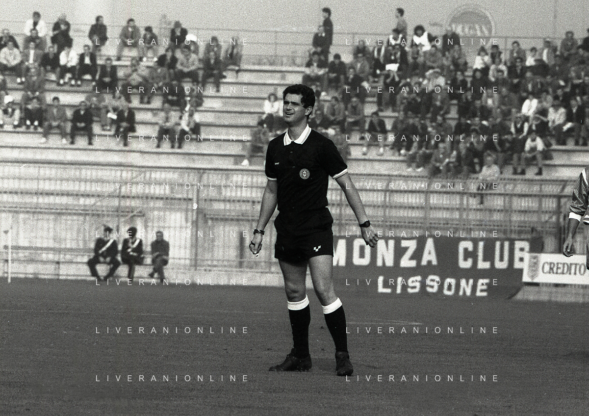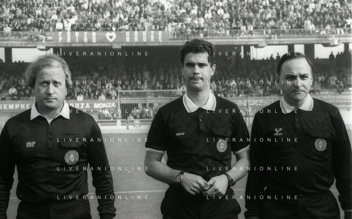 22-10-1989 MONZA-CAMPIONATO DI CALCIO SERIE B MONZA-LICATA 2-0 NELLA FOTO FULVIO SAINI E GIORGIO TAORMINA SCAMBIO GAGLIARDETTI TRA CAPITANI DAVANTI ALL'ARBITRO GIUSEPPE ROSICA AG ALDO LIVERANI SAS
