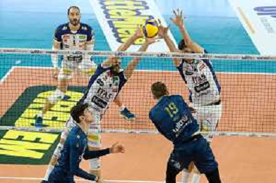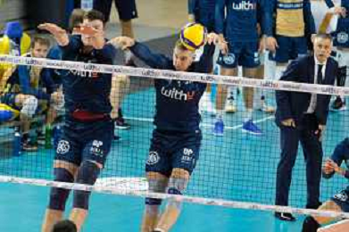 Block by Leandro Mosca - WithU Verona and Maksim Sapozhkov - WithU Verona during the match between WithU Verona and ITAS Trentino valid for a second day of the Superlega Italian volley men championship on October 8, 2022 at Pala AGSM-AIM in Verona, Italy FOTO ROBERTO TOMMASINI-AG ALDO LIVERANI SAS
