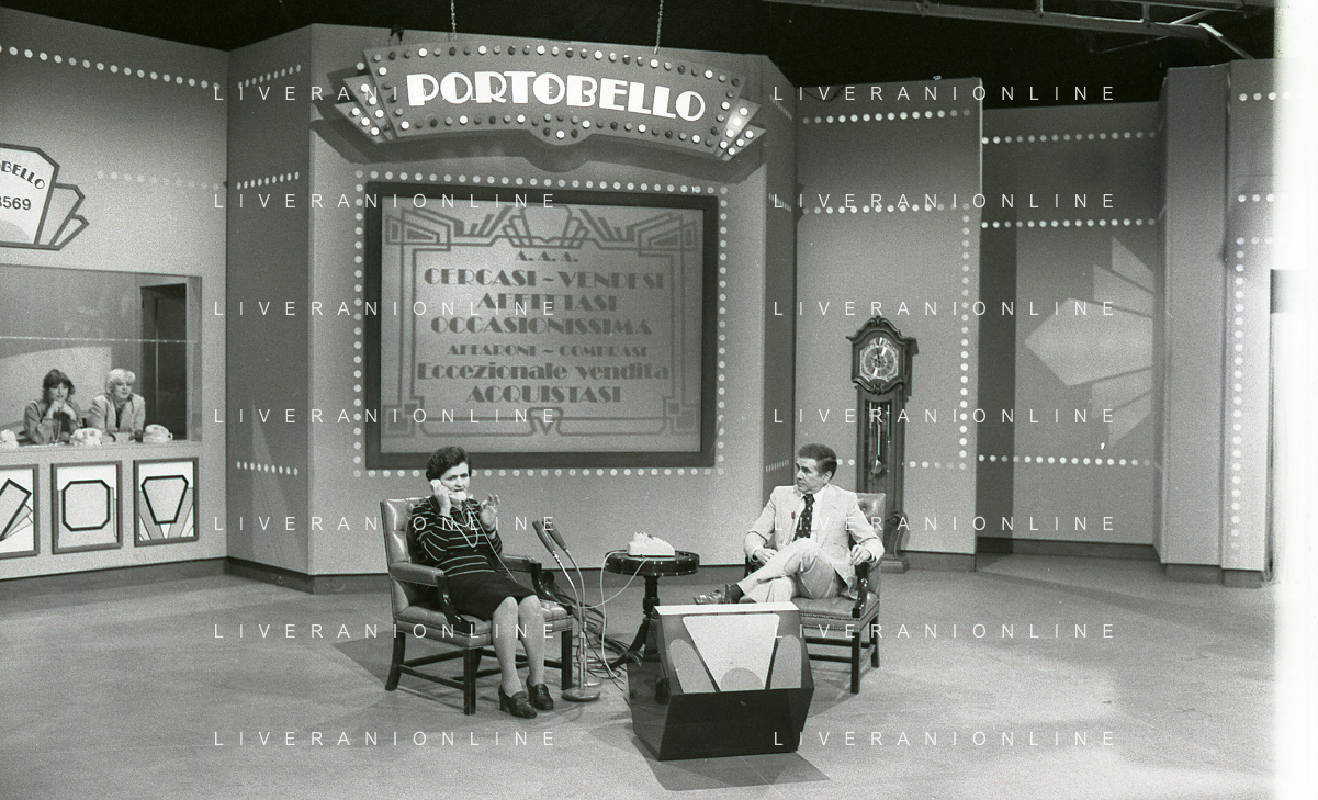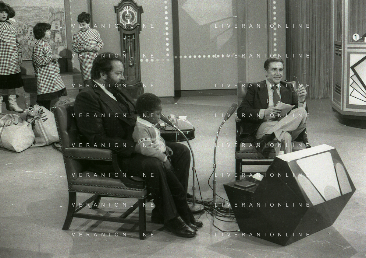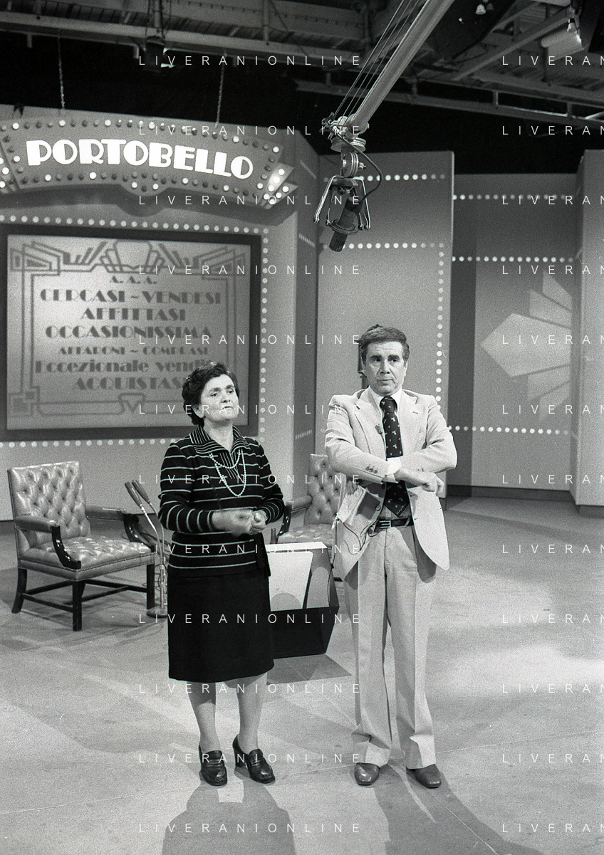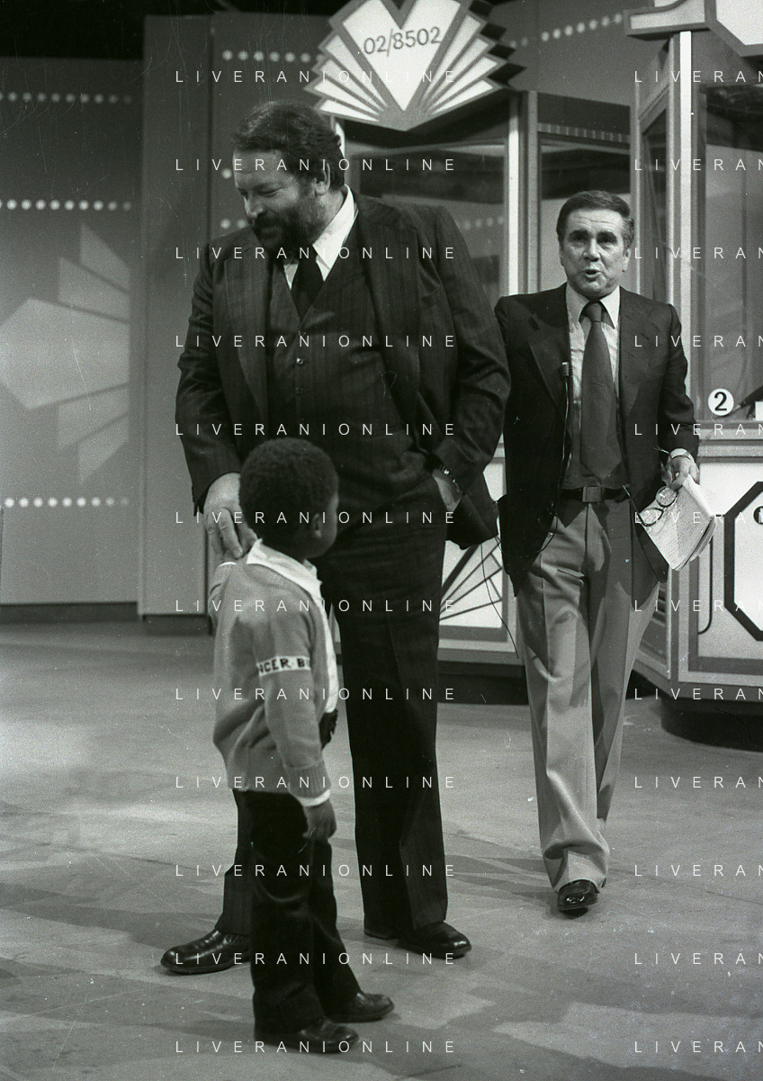 1978 MILANO TRASMISSIONE TELEVISIVA “PORTOBELLO“ NELLA FOTO ENZO TORTORA CONDUCE LA TRASMISSIONE TELEVISIVA “PORTOBELLO“ CON BUD SPENCER CARLO PEDERSOLI AG ALDO LIVERANI SAS