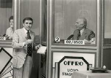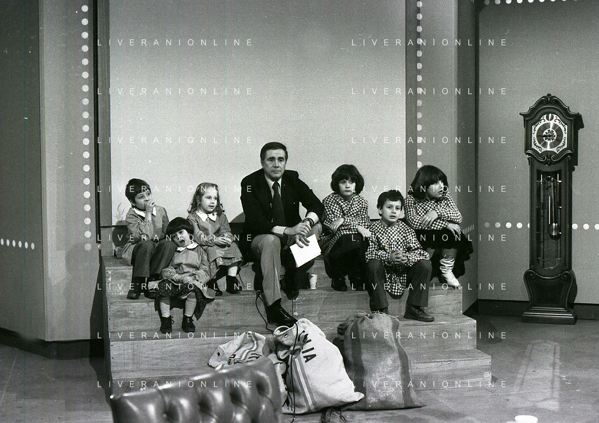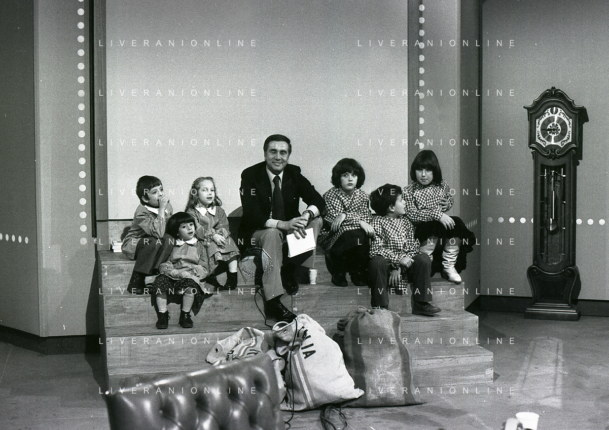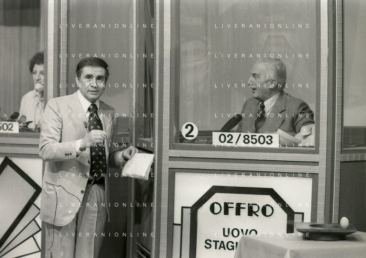 1978 MILANO TRASMISSIONE TELEVISIVA “PORTOBELLO“ NELLA FOTO ENZO TORTORA CONDUCE LA TRASMISSIONE TELEVISIVA “PORTOBELLO“ CON BUD SPENCER CARLO PEDERSOLI AG ALDO LIVERANI SAS
