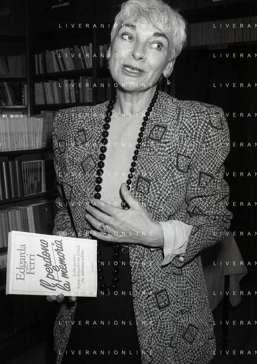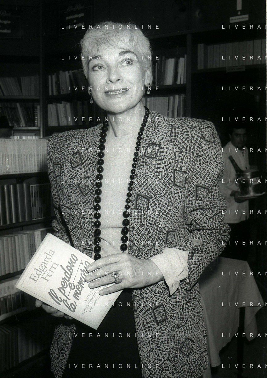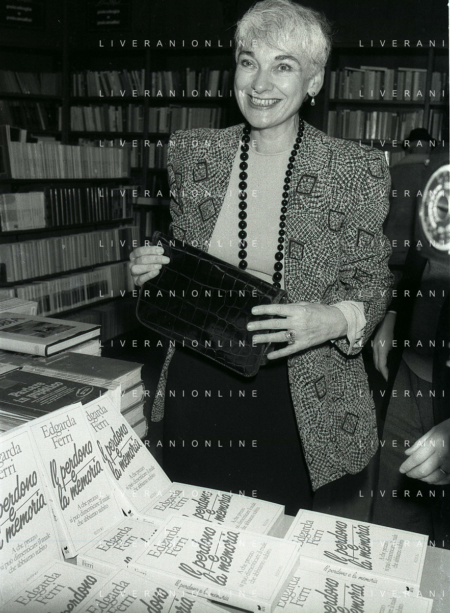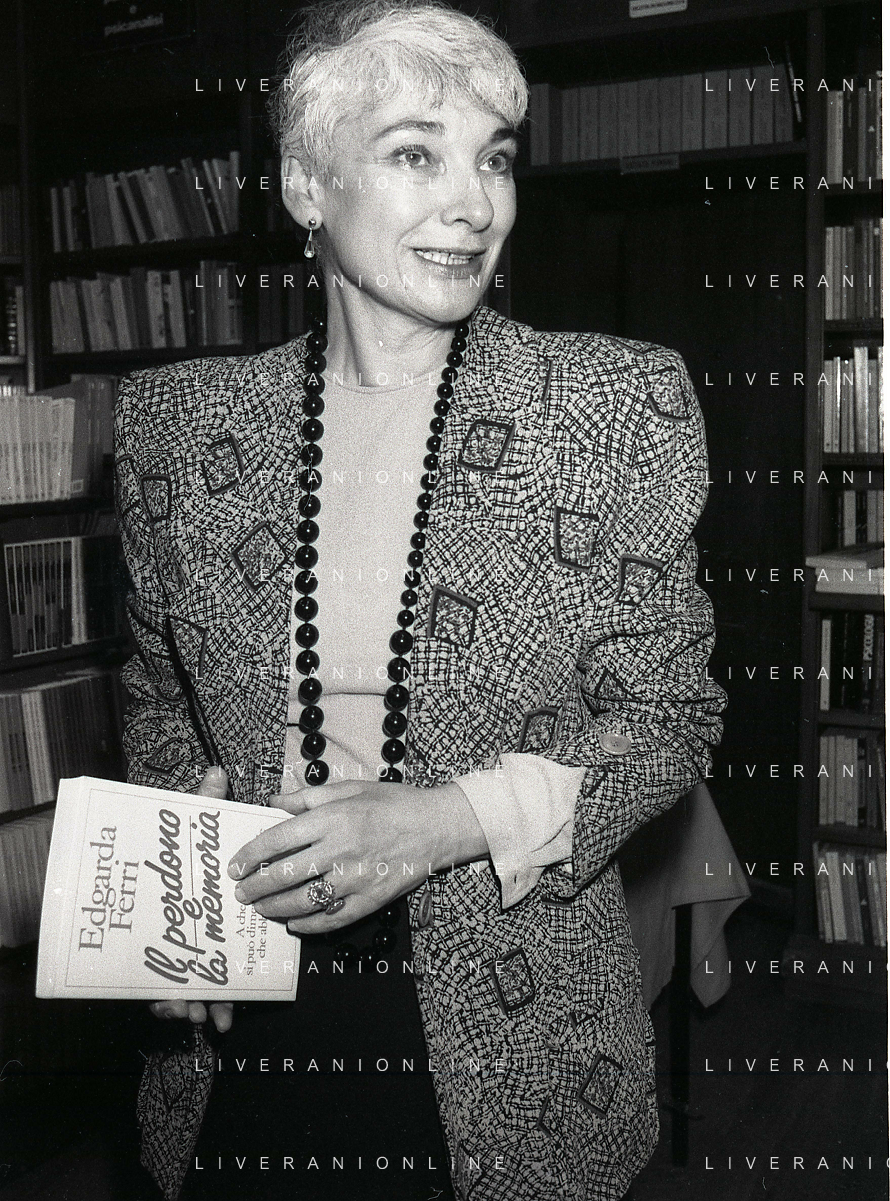 1988 MILANO PRESENTAZIONE DEL LIBRO “IL PERDONO E LA MEMORIA“ NELLA FOTO EDGARDA FERRI SCRITTRICE A MILANO NELL'ANNO 1988 PRESENTA IL SUO LIBRO“IL PERDONO E LA MEMORIA“ AG ALDO LIVERANI SAS