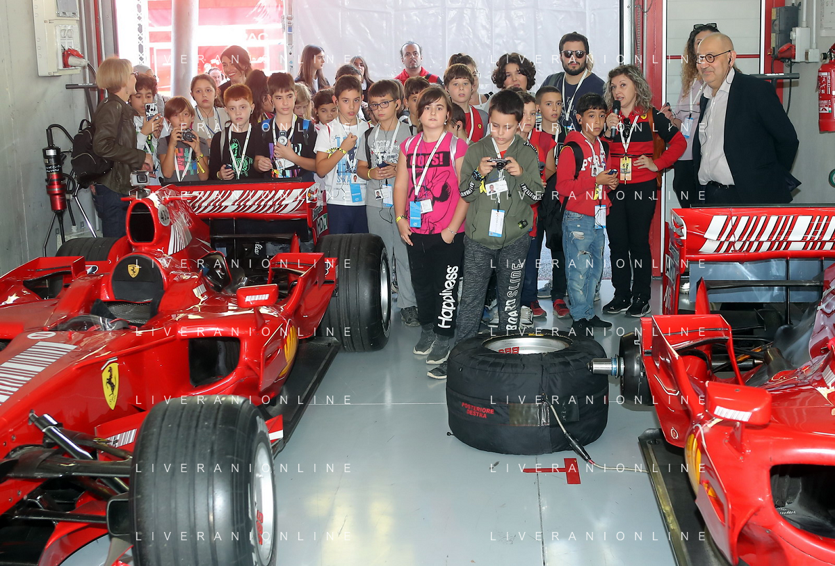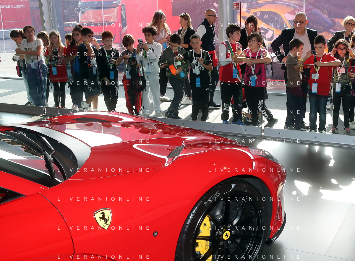 IMOLA 27 10 2022 AUTODROMO ENZO E DINO FERRARI "FERRARI FINALI MONDIALI" LE CLASSI VINCITRICI DEL CONCORSO l'AUTODROMO:COME TI PIACEREBBE UTILIZZARLO IN VISITA AL PADDOCK IN OCCASIONE DELLE FINALI MONDIALI FERRARI 2022 NELLA FOTO SUTDENTI VISITANO IL SALONE DELLE AUTO FERRARI FOTO GIANNI SANNA-AG ALDO LIVERANI SAS