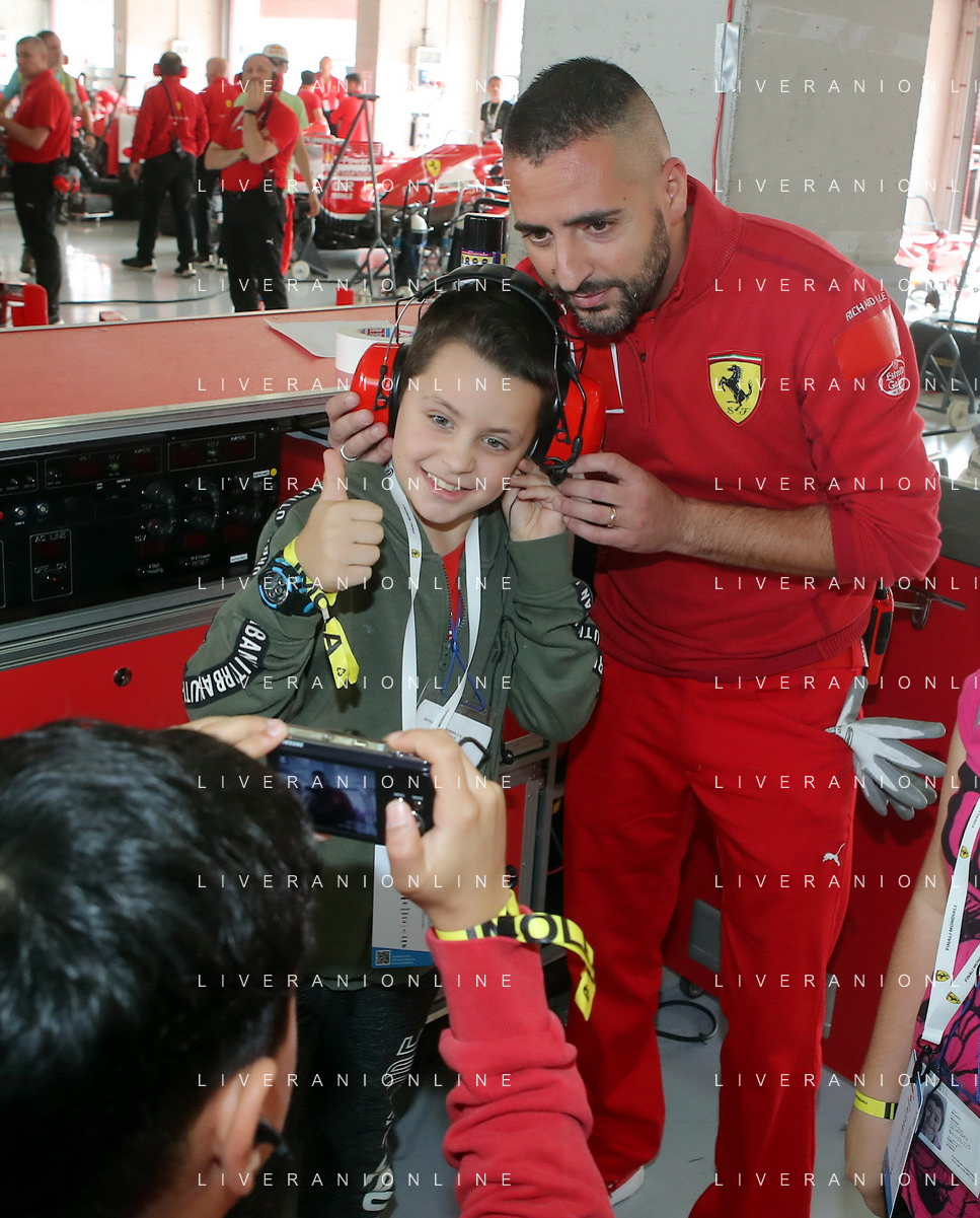 IMOLA 27 10 2022 AUTODROMO ENZO E DINO FERRARI "FERRARI FINALI MONDIALI" LE CLASSI VINCITRICI DEL CONCORSO l'AUTODROMO:COME TI PIACEREBBE UTILIZZARLO IN VISITA AL PADDOCK IN OCCASIONE DELLE FINALI MONDIALI FERRARI 2022 NELLA FOTO FOTO RICORDO CON GLI MECCANICI DELLA FERRARI FOTO GIANNI SANNA-AG ALDO LIVERANI SAS